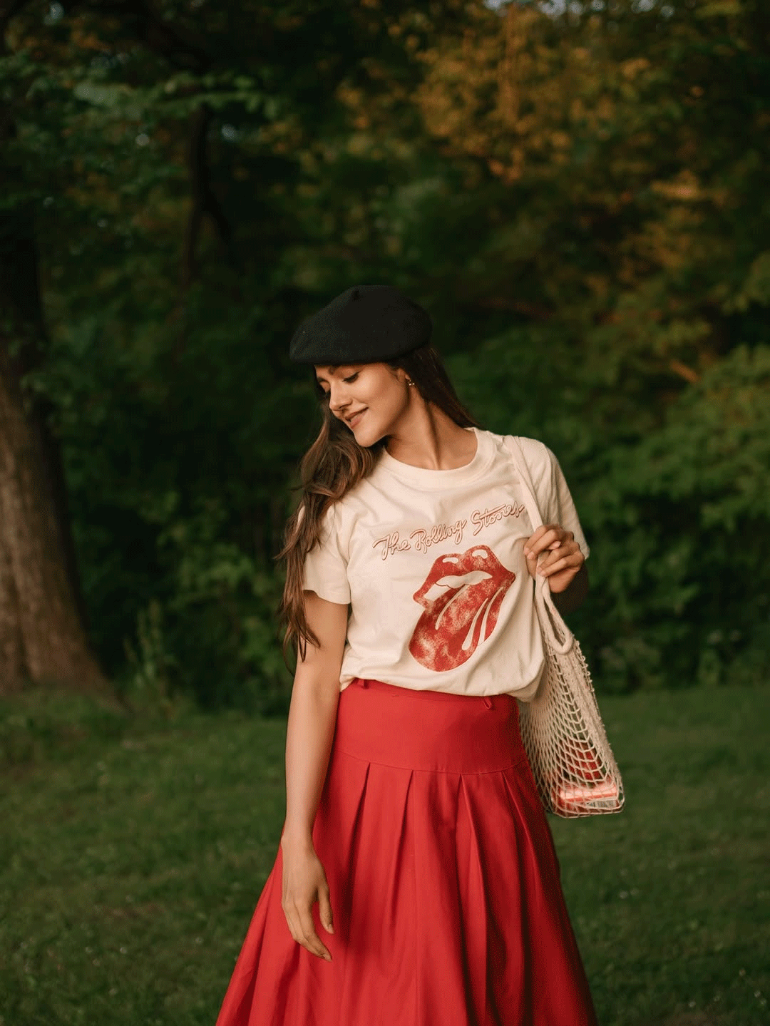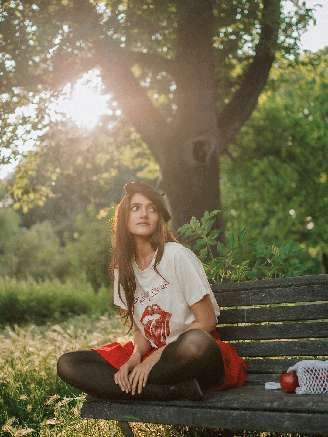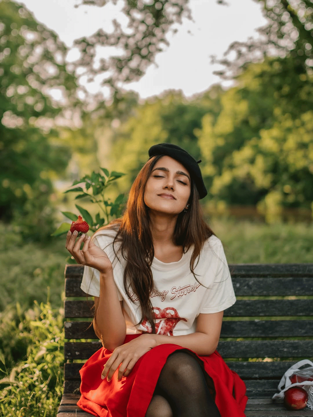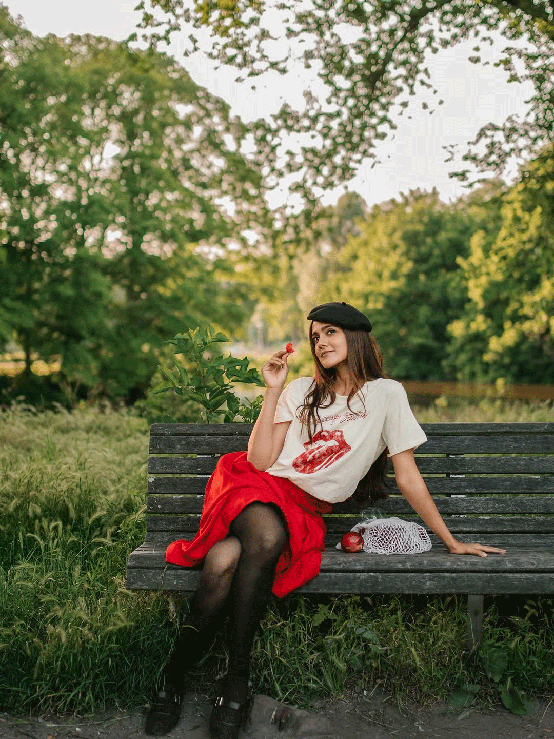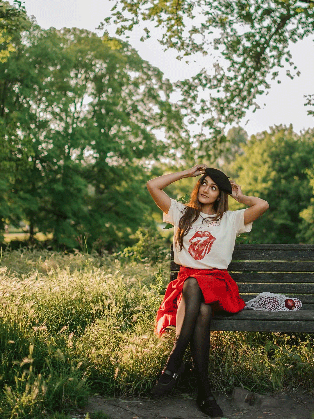 By: Tupaki Desk | 22 July 2025 1:51 PM ISTSimran Choudhary’s latest Instagram post is a soft slice of summer. She is seen sitting on a wooden bench surrounded by tall grass and warm sunshine. She is dressed casually in a white t-shirt with a red lips graphic and a bright red skirt, she completes the look with black tights, simple shoes, and a beret. Her caption reads: