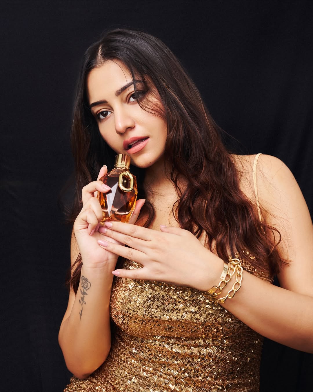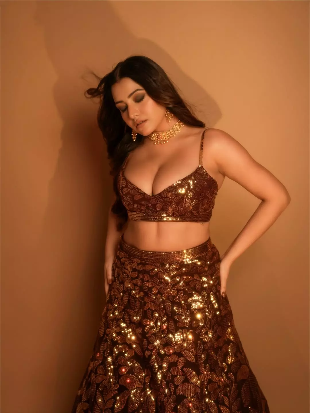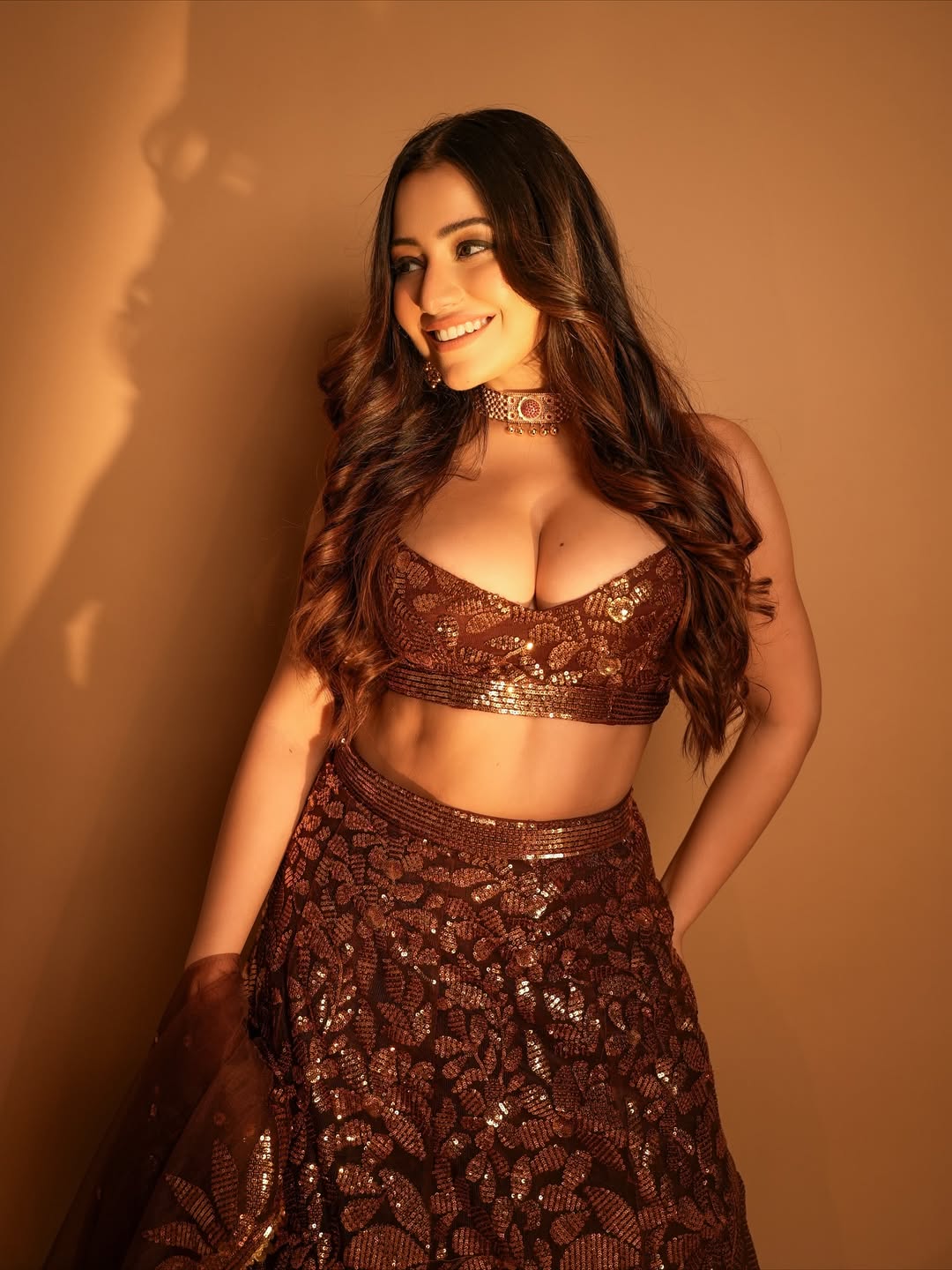 The outfit sparkled with every flicker of light, highlighting Simran’s radiant aura and confident charm. Keeping her accessories minimal, she allowed the luxe golden attire to steal the spotlight. Her soft, wavy hair and subtle, glowing makeup perfectly complemented the rich tones of the outfit, creating an effortlessly glamorous look.