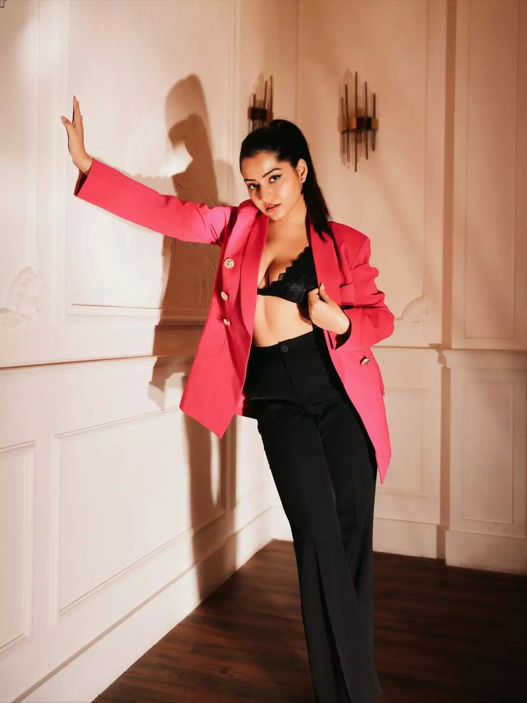 Simran Kaur exudes unapologetic power and confidence in this striking frame, rocking a bold hot-pink blazer paired with a daring black lace bralette and sleek trousers.