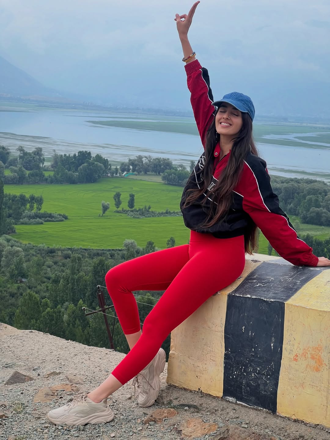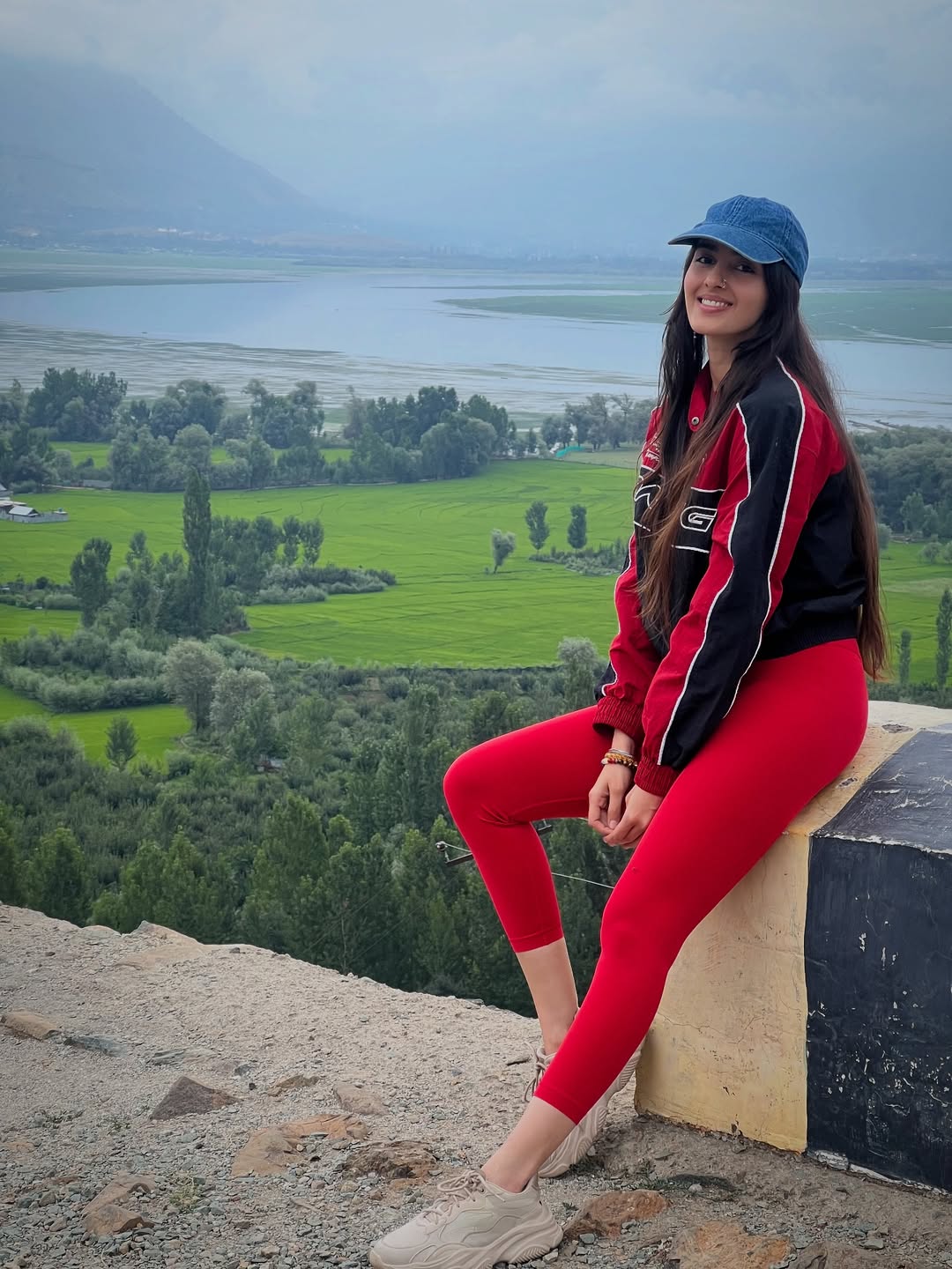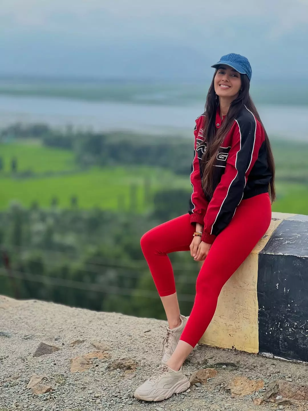 Simrat Kaur shared a peaceful moment on her Instagram. She sat on a roadside ledge. Behind her, there were green fields, trees and a wide lake. The sky looked calm and soft. Simrat wore a red tracksuit with a black and red jacket. She also wore a denim cap and beige sneakers.