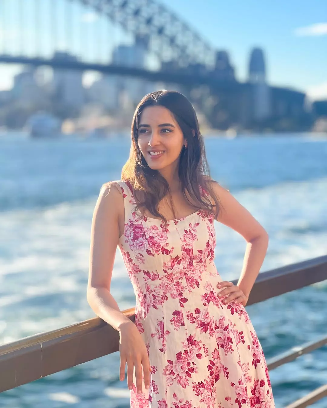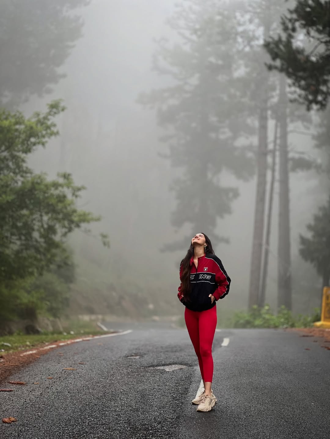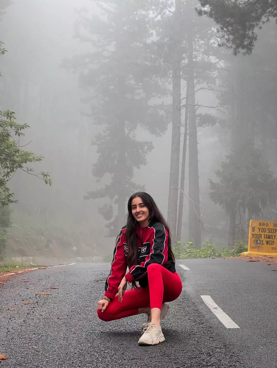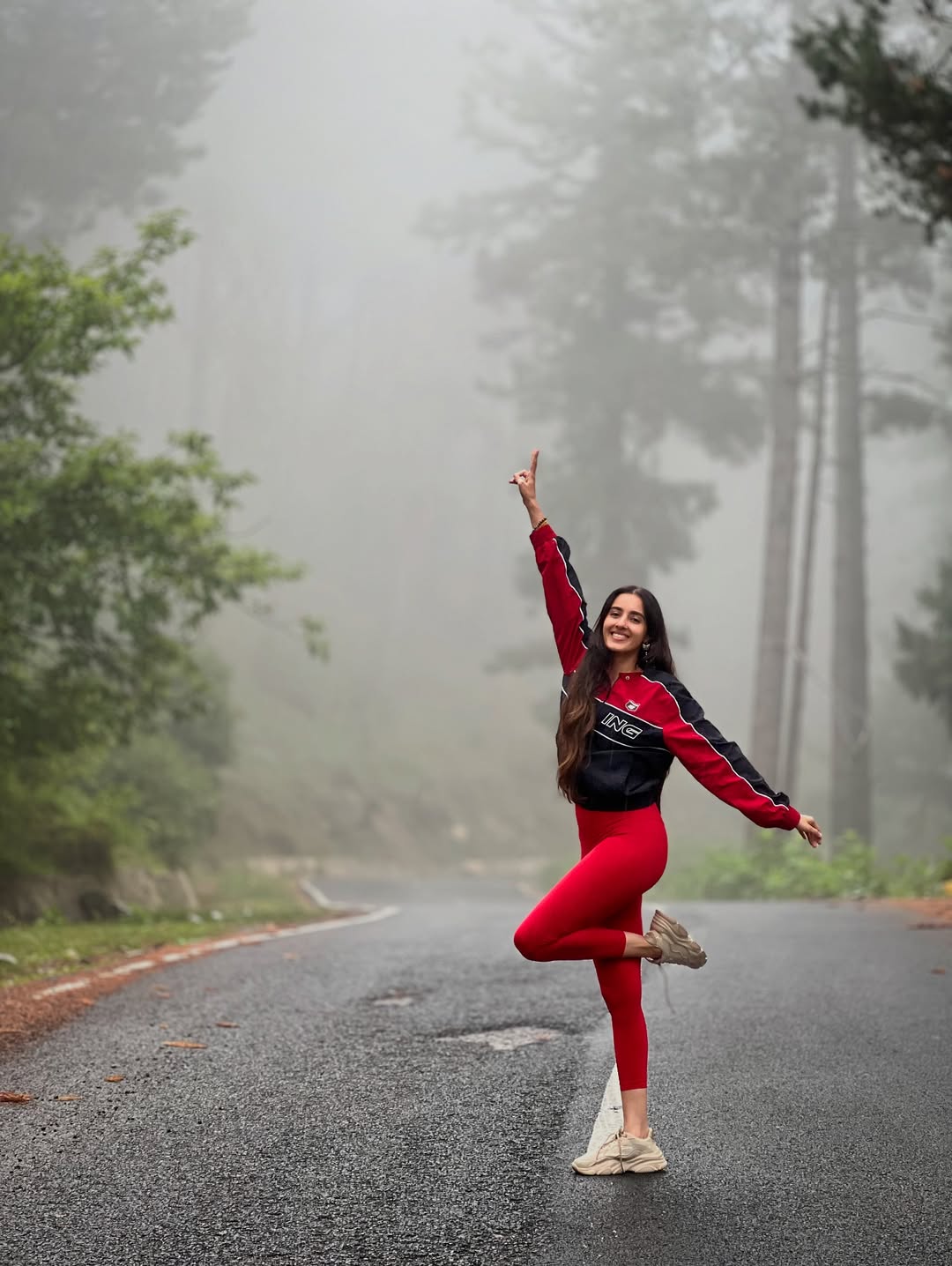 Simrat Kaur shared a peaceful moment on her Instagram. She sat on a roadside ledge. Behind her, there were green fields, trees and a wide lake. The sky looked calm and soft. Simrat wore a red tracksuit with a black and red jacket. She also wore a denim cap and beige sneakers.