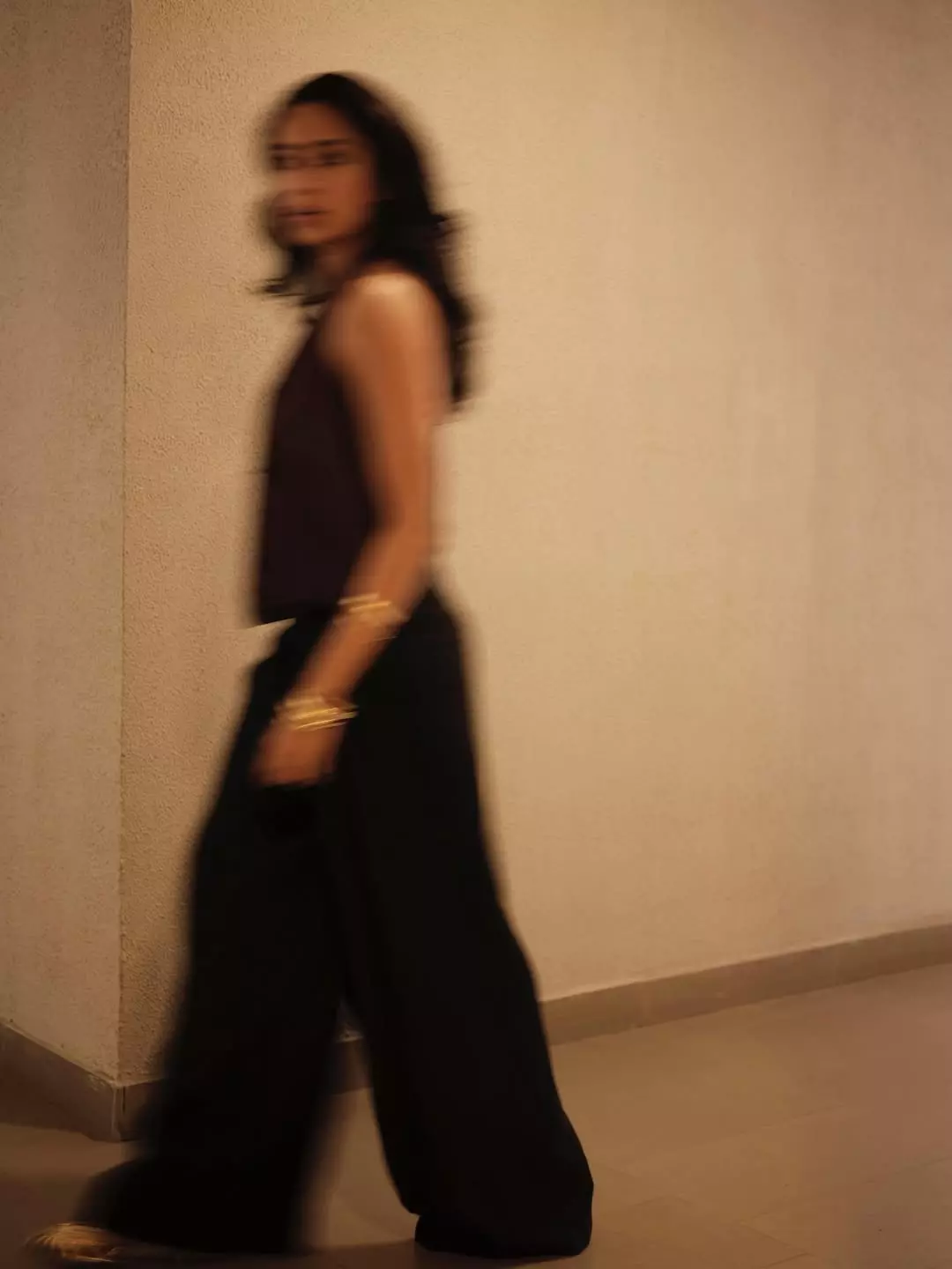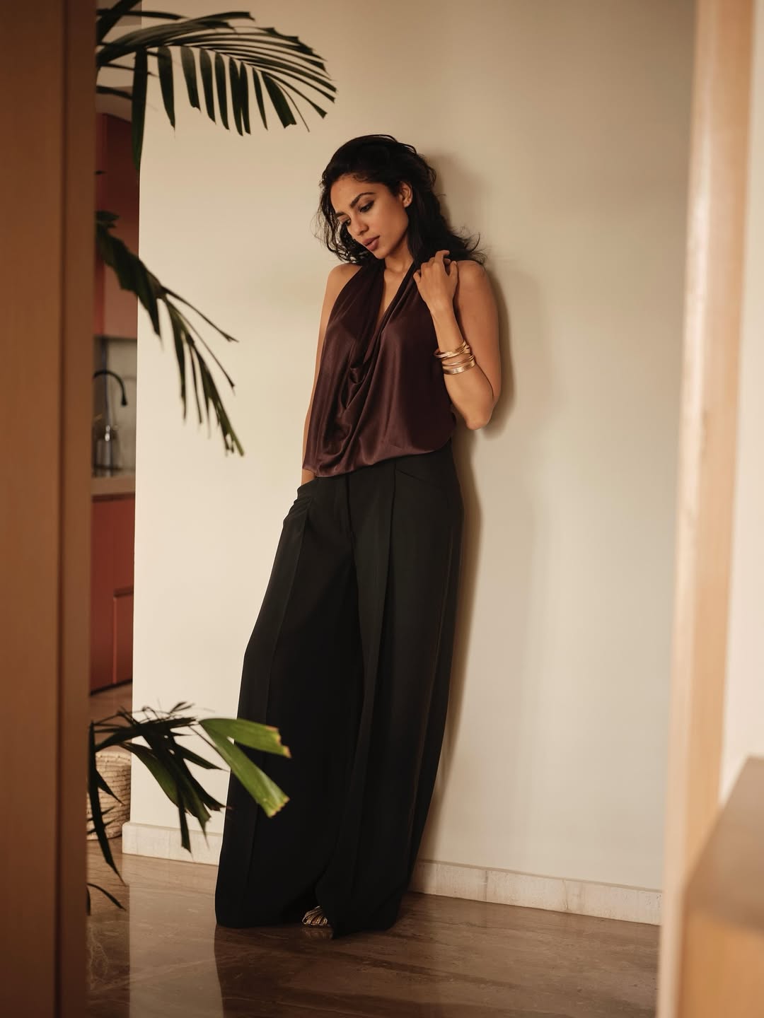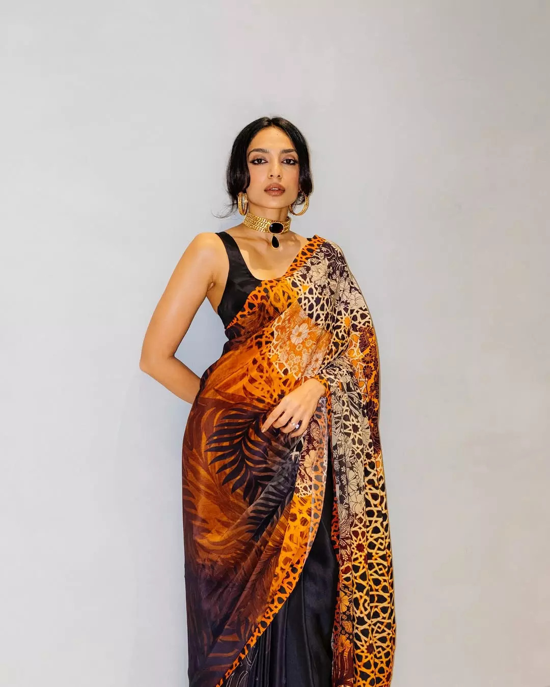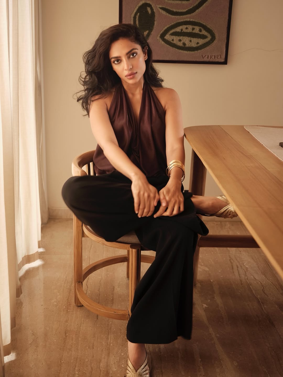 Akkineni family actress Sobhita Dhulipala is known for her impressive acting skills and fashion sense. Recently, she posted a captivating photo on Instagram by showcasing an elegant and effortlessly chic look. In the image, she is dressed in a brown halter neck top paired with black pants. Her style brought a festive vibe of the season, and her caption read, "Between structure and softness this festive season."