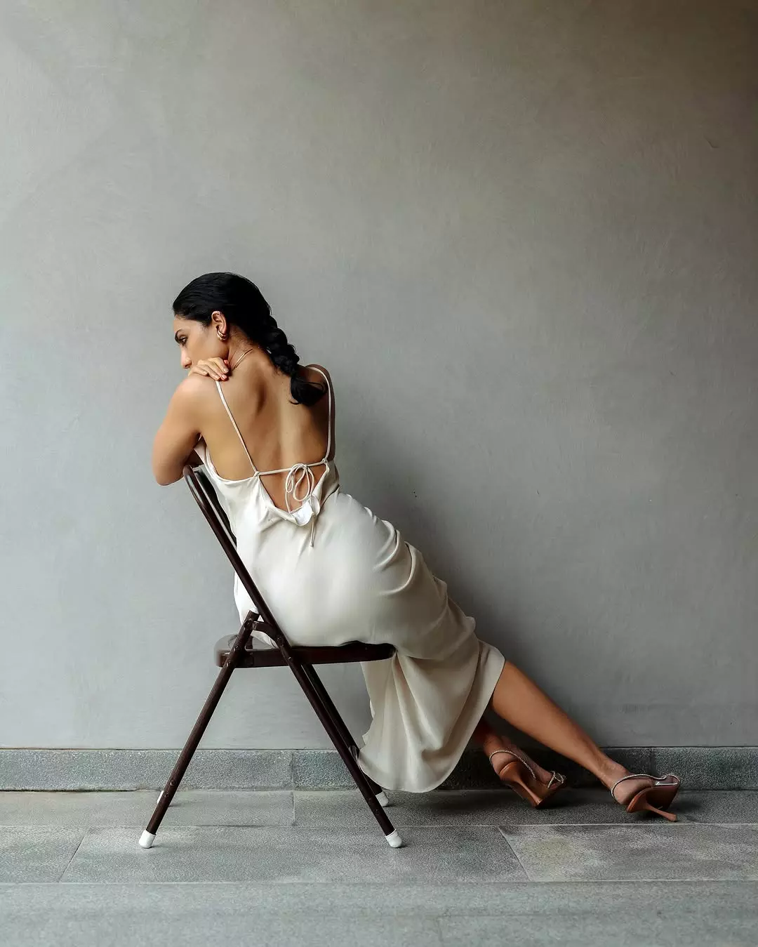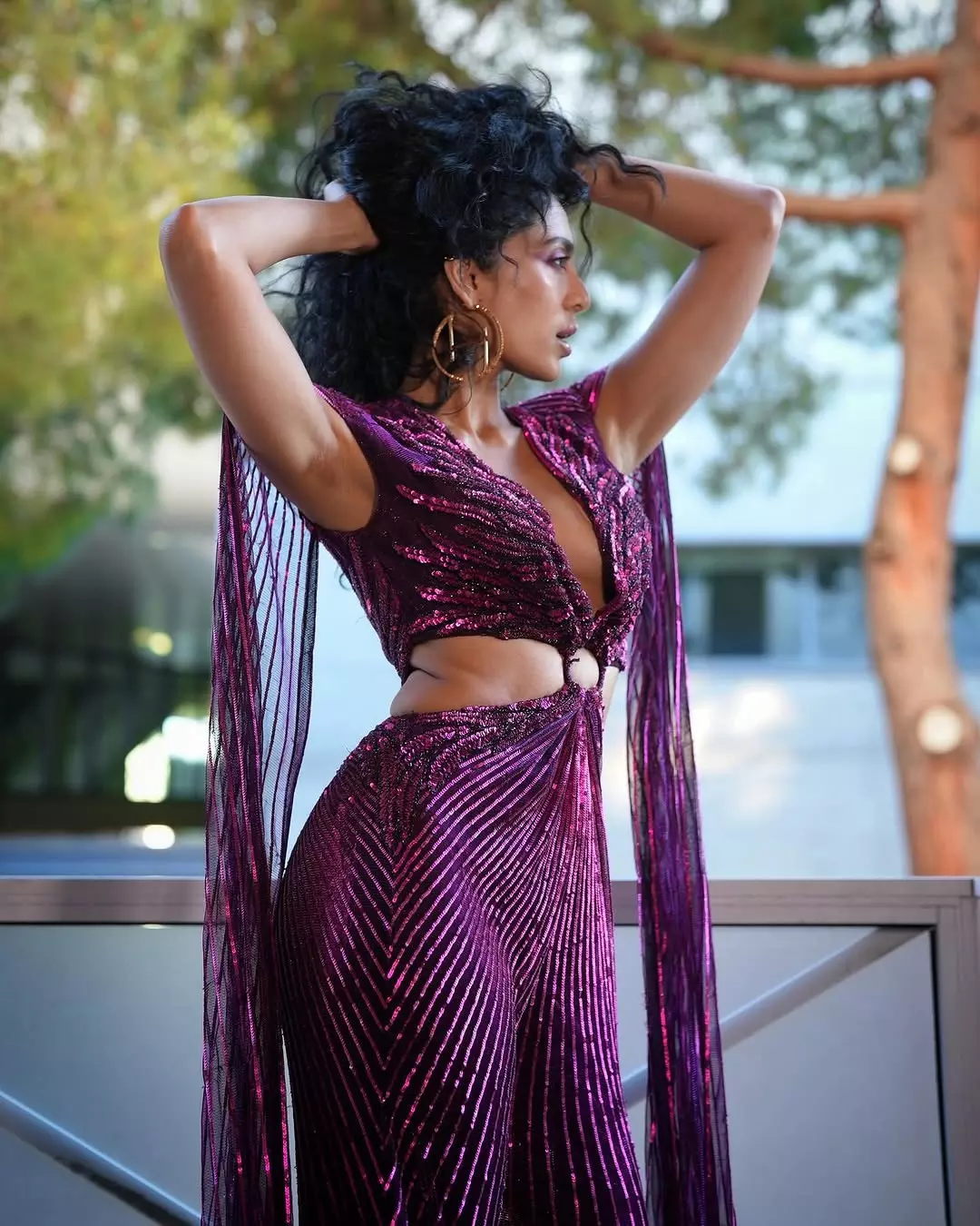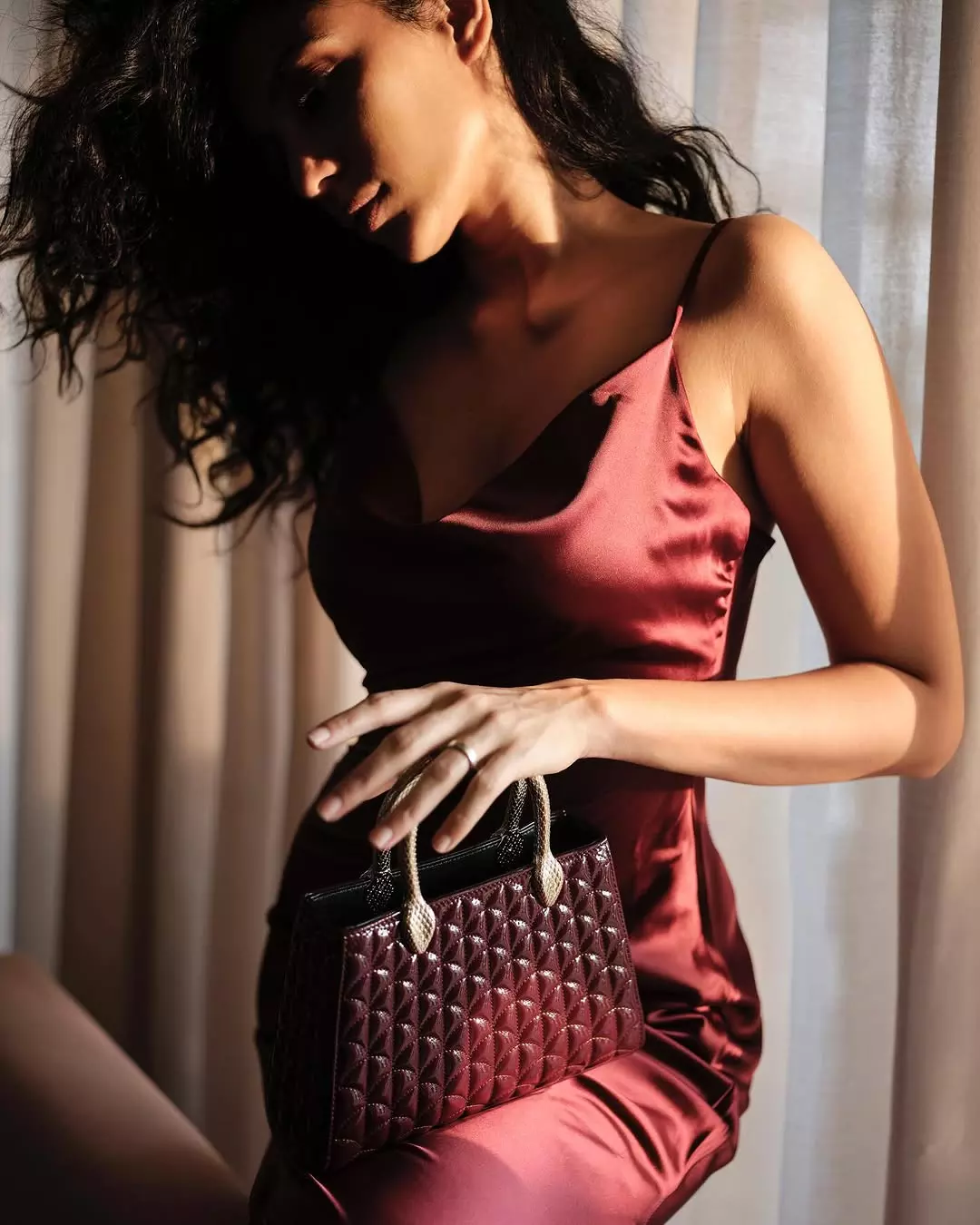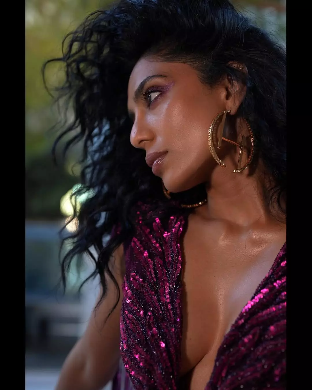 In the cover image, Sobhita is seen wearing a beautiful long dress designed by abujanisandeepkhosla. The dress shines with detailed work and gives her a royal and elegant look. She is also styled with a croissant ring by studioviange and burgundy sandals by renecaovilla.