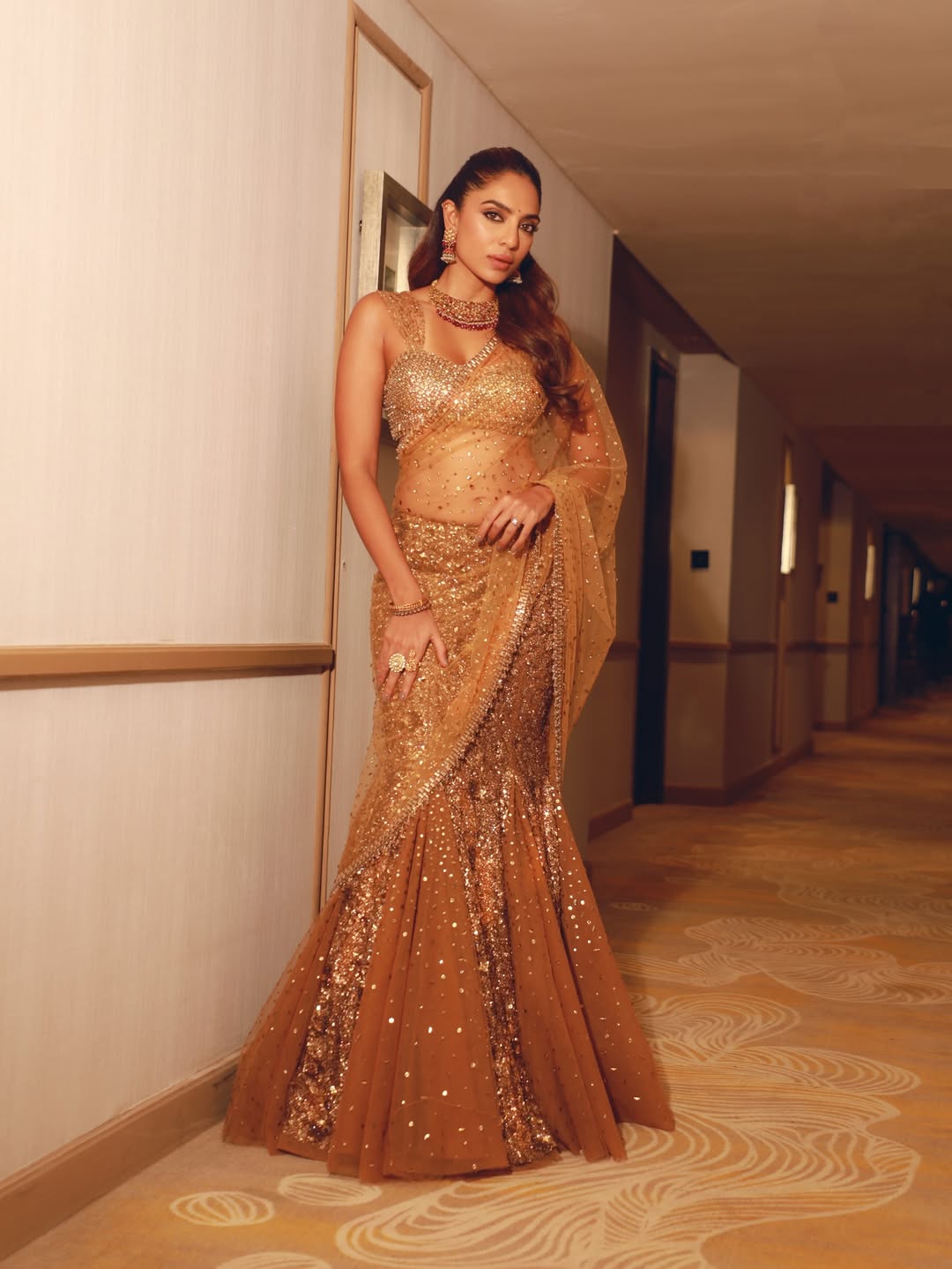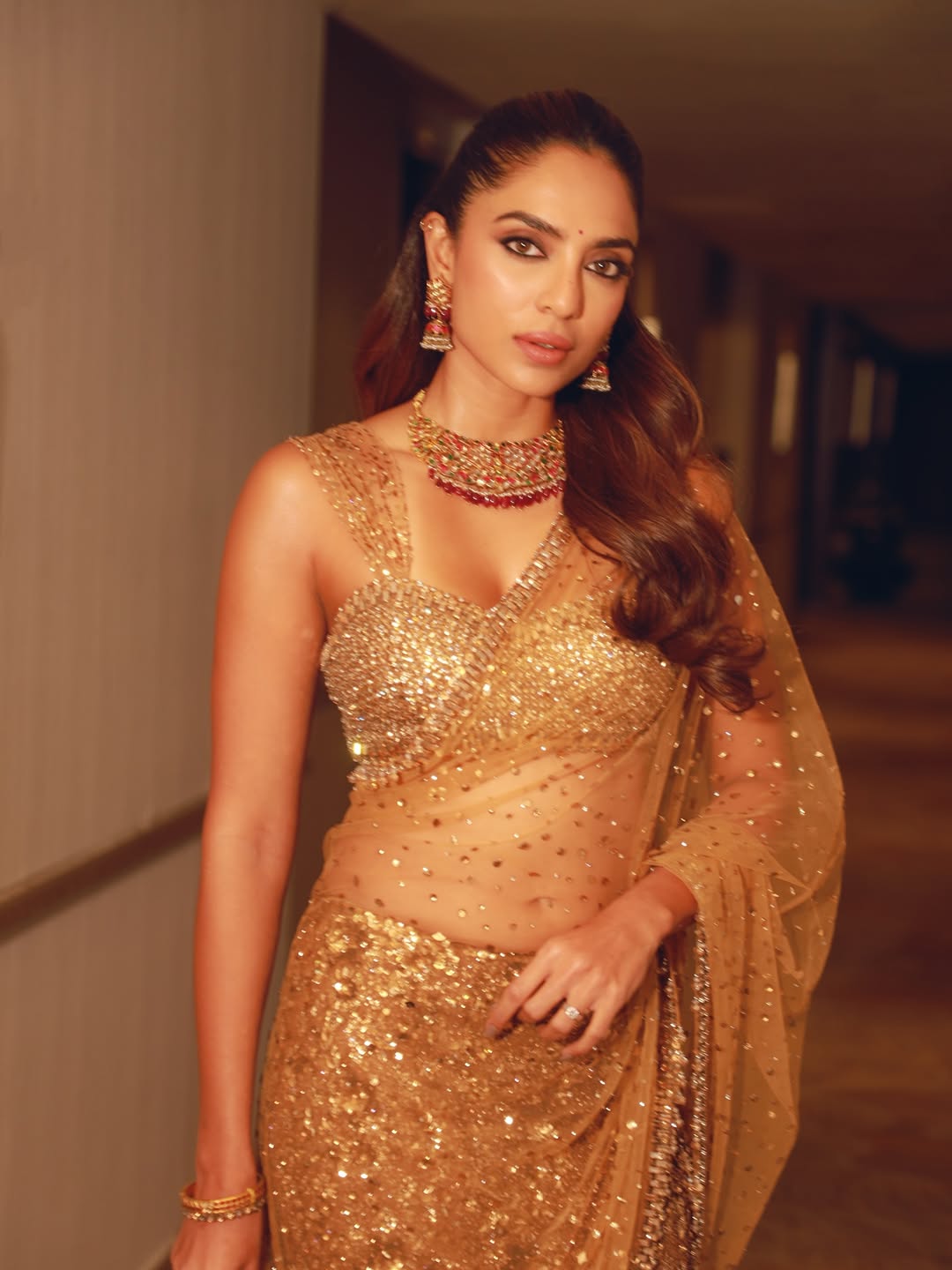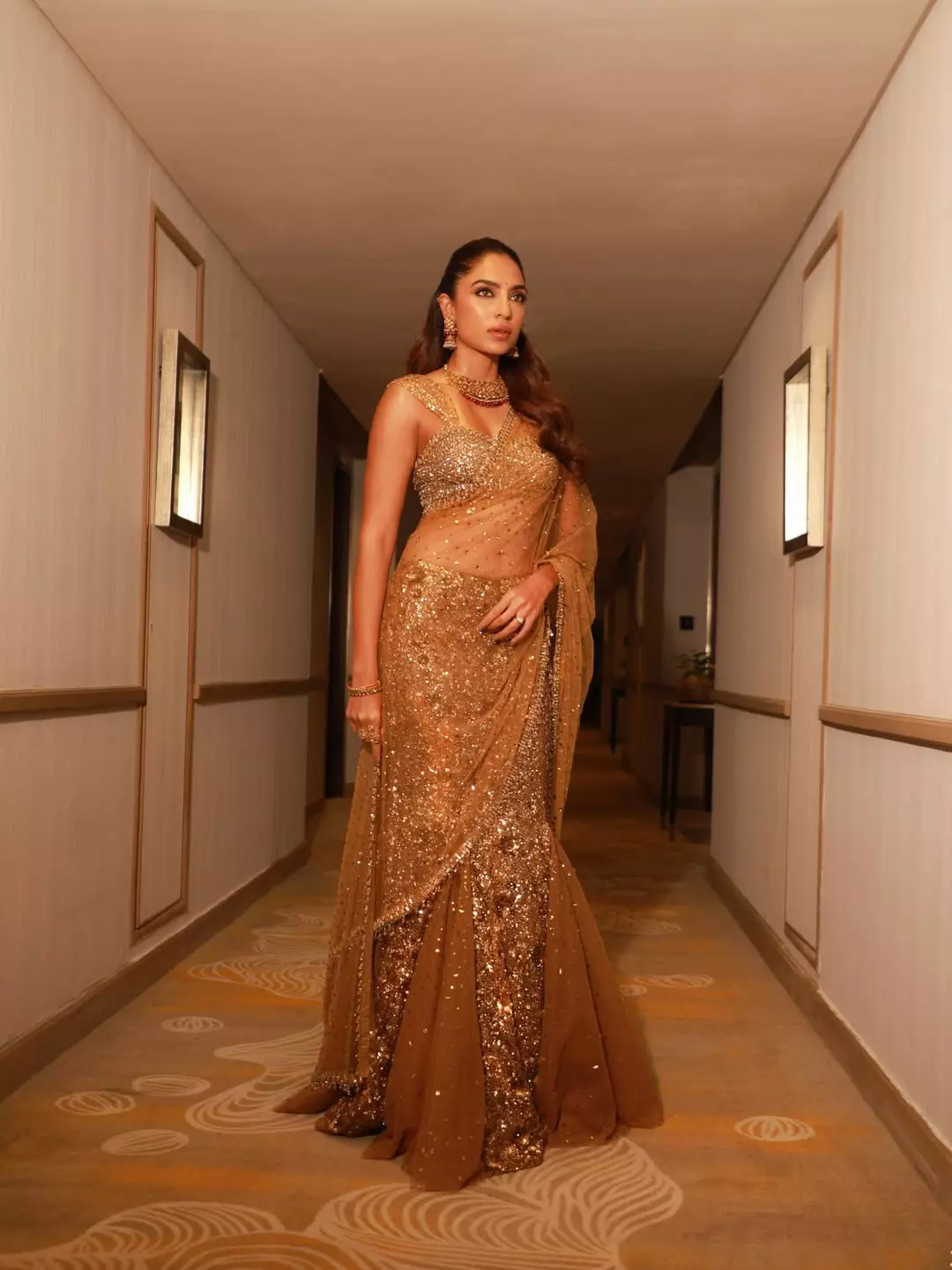 Amrapali Jewels provided accessories that added a regal touch, balancing the saree’s intricate design with understated sophistication. The talented team behind this flawless look included styling assistant @dhriti_chokshi, interns @aditisharma2309 and @style_bytrish, hair by @souravv_roy_, and makeup by @shradhaluthra. Photographer @pauldavidmartinofficial captured Sobhita’s elegance, highlighting both the saree’s richness and the subtle nuances of her expression.