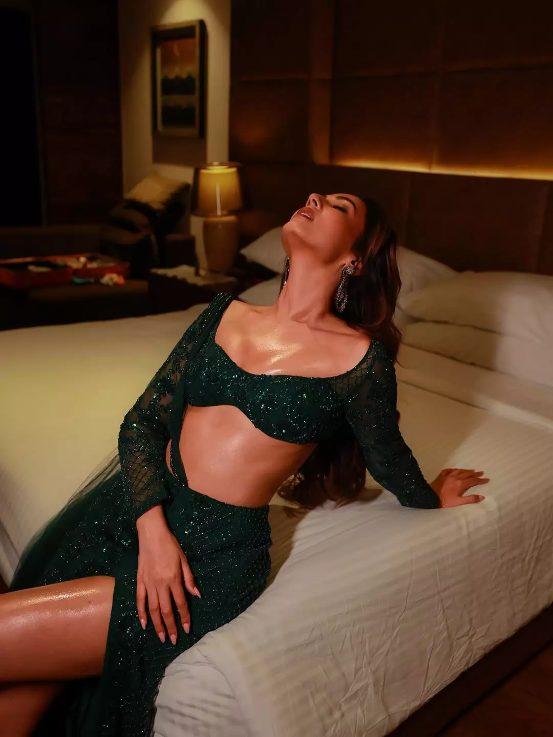 By: Priya Chowdhary Nuthalapti | 8 Sept 2025 12:23 PM ISTSonal Chauhan shared a fresh post on Instagram. Her caption read, “Your new wallpaper 🌶️🫑 Wanna see more of this look ?” In the photo, she sat on the edge of a bed. She wore a sparkling green dress from @chhavviaggarwalofficial. The dress had a stylish design with a slit that gave it a modern touch. Her glowing skin and confident pose stood out in the frame.
