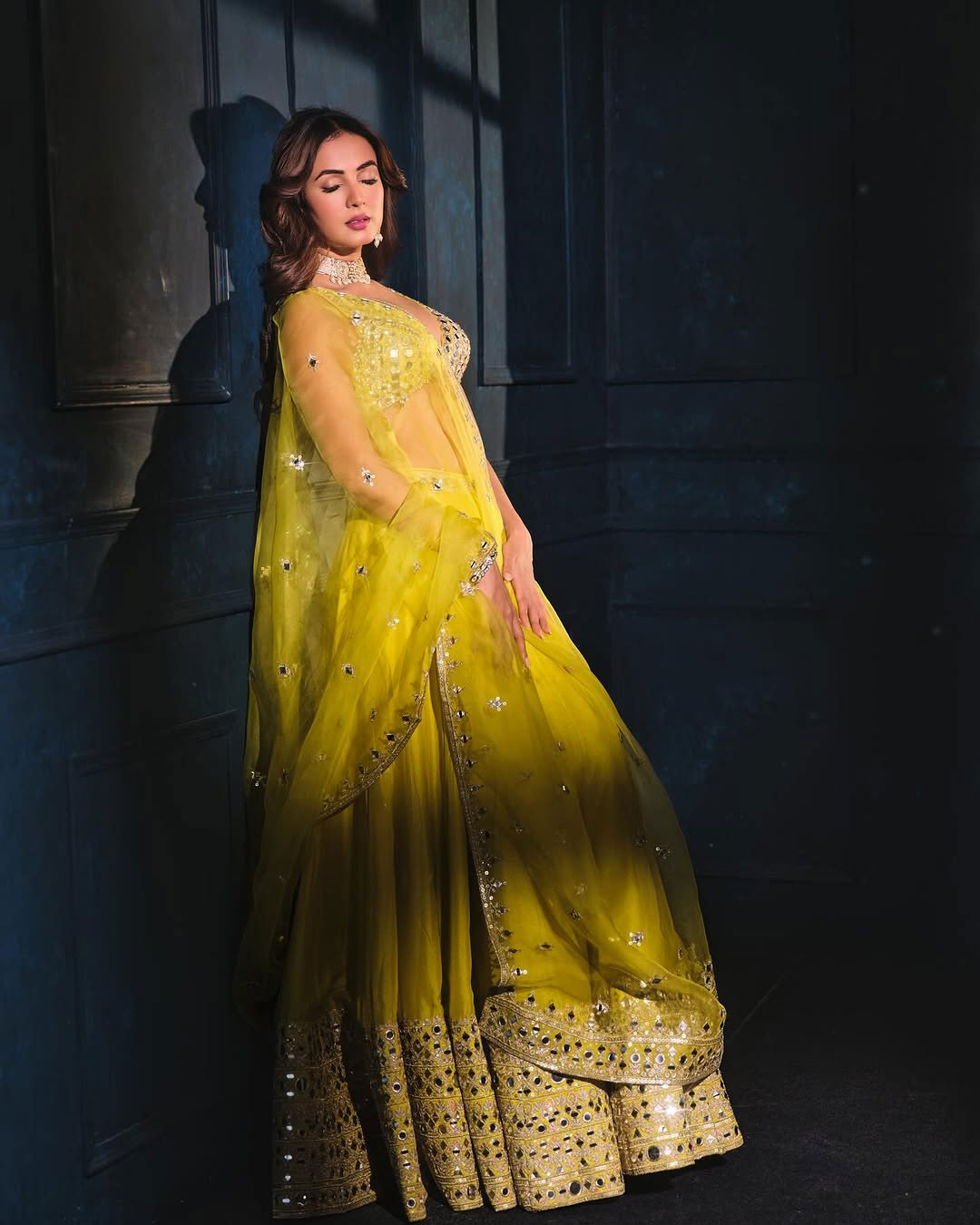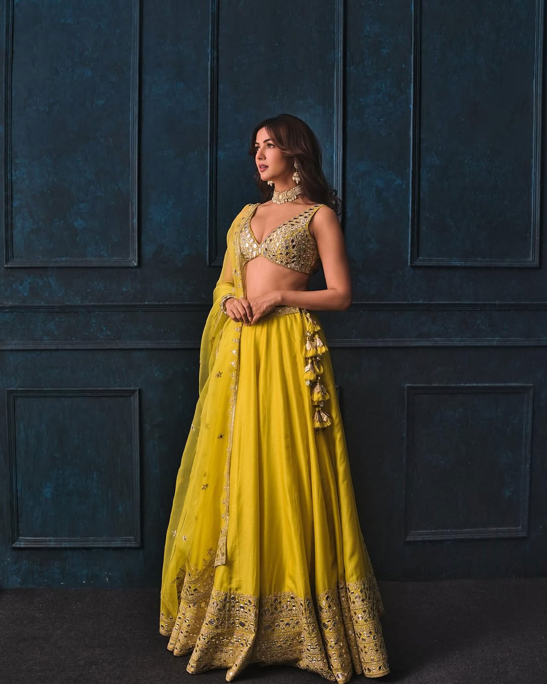 Sonal Chauhan looks absolutely adorable in her recent Instagram post. She is wearing a beautiful yellow lehenga and it is paired with sparkling jewelry that adds a royal touch to the look. Sonal’s hair style and still stand out in the picture. In her caption, she asks her followers if she chose the right picture for the cover. Her makeup is done by Sandy, style by Shru and photos by Faraz Dal.