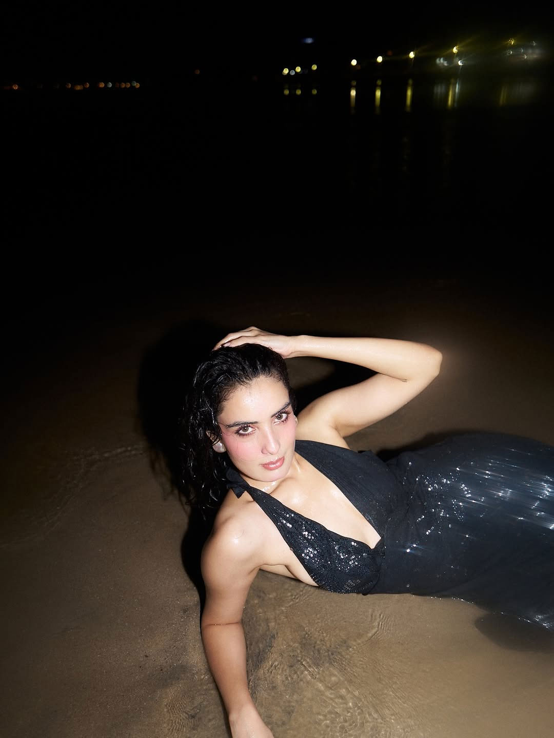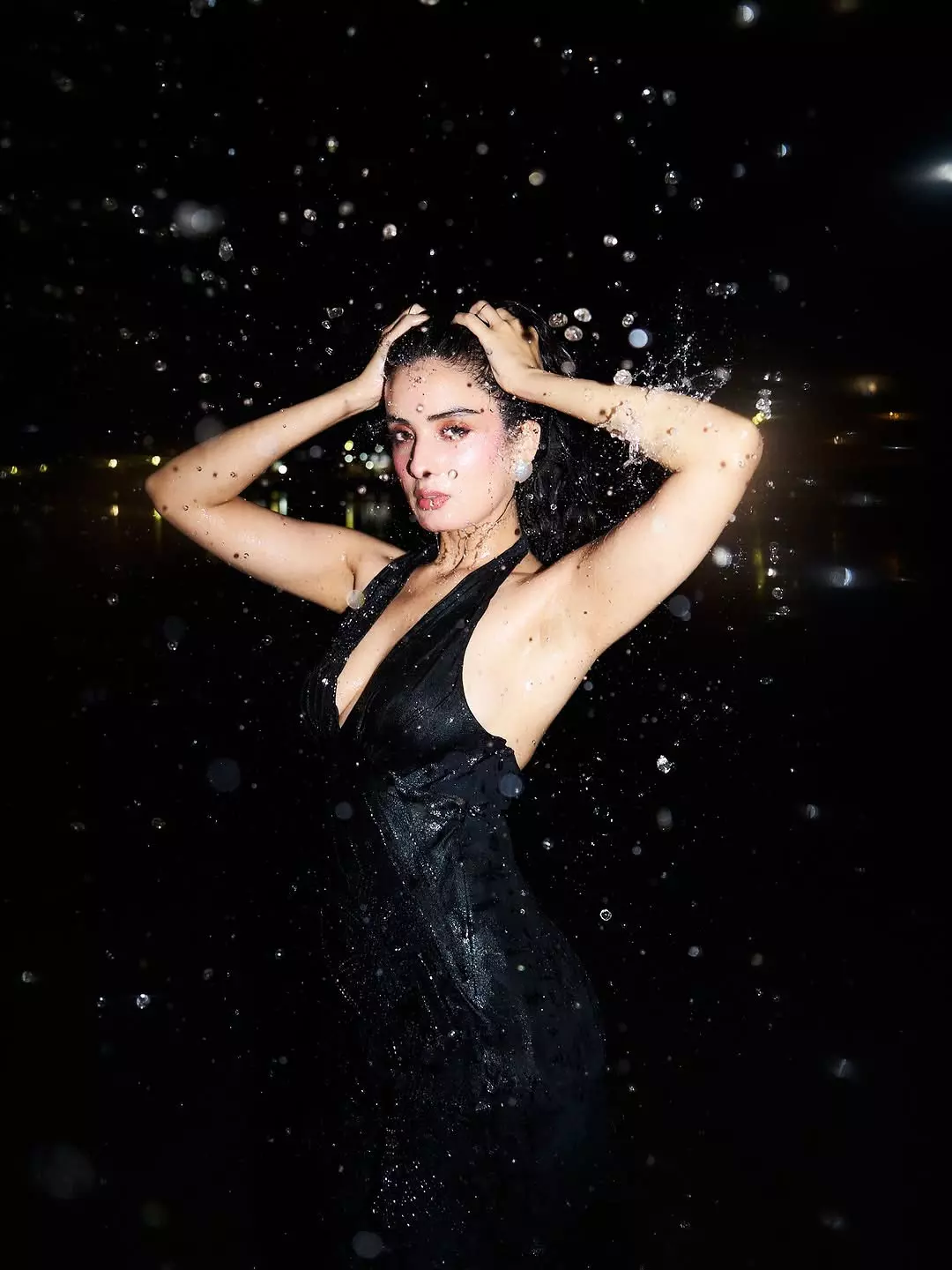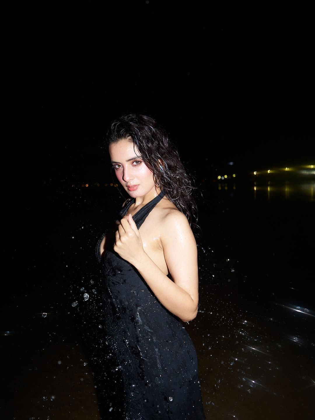 Model Sonali Kukreja posted a striking picture on Instagram. The photo shows her standing under water droplets at night.
