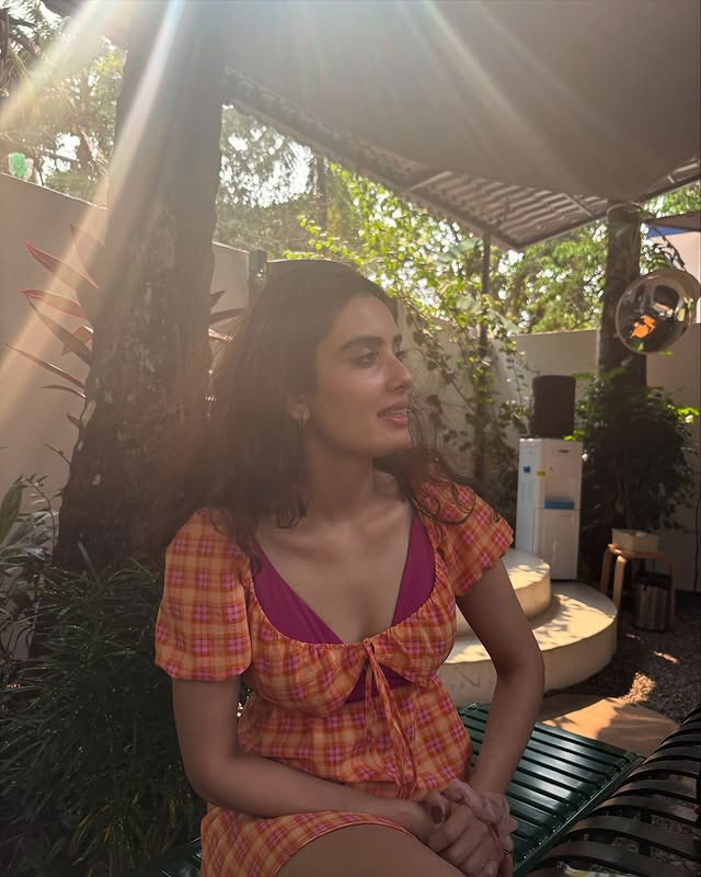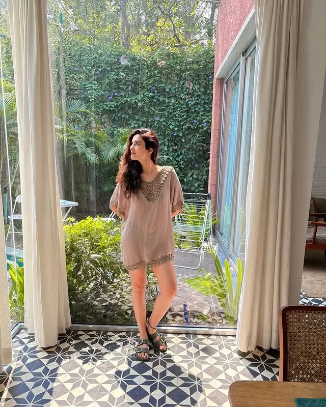 In her latest Instagram picture, she looks effortless in a short tunic dress. The earthy shade of her dress blends with the natural background. Her caption says "Lucky girl storyline."