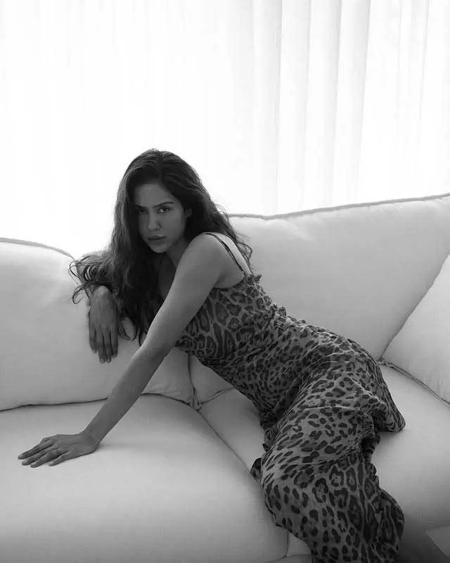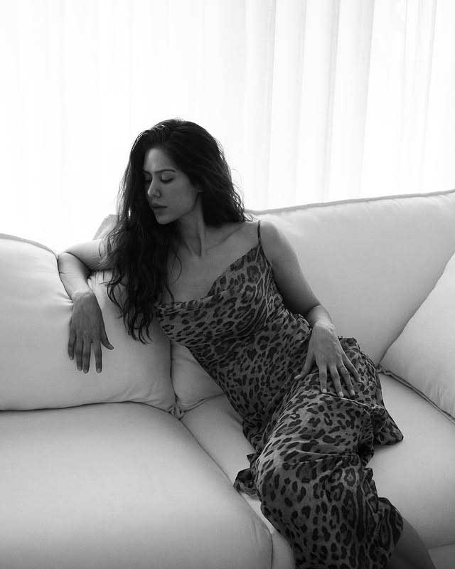 Sonam Bajwa recently shared a black-and-white picture on Instagram that quickly caught the attention of her followers. Sitting casually on a cozy white couch in a leopard-print dress, she gave a relaxed and intense look to the camera. The post had a fun and candid caption that read: