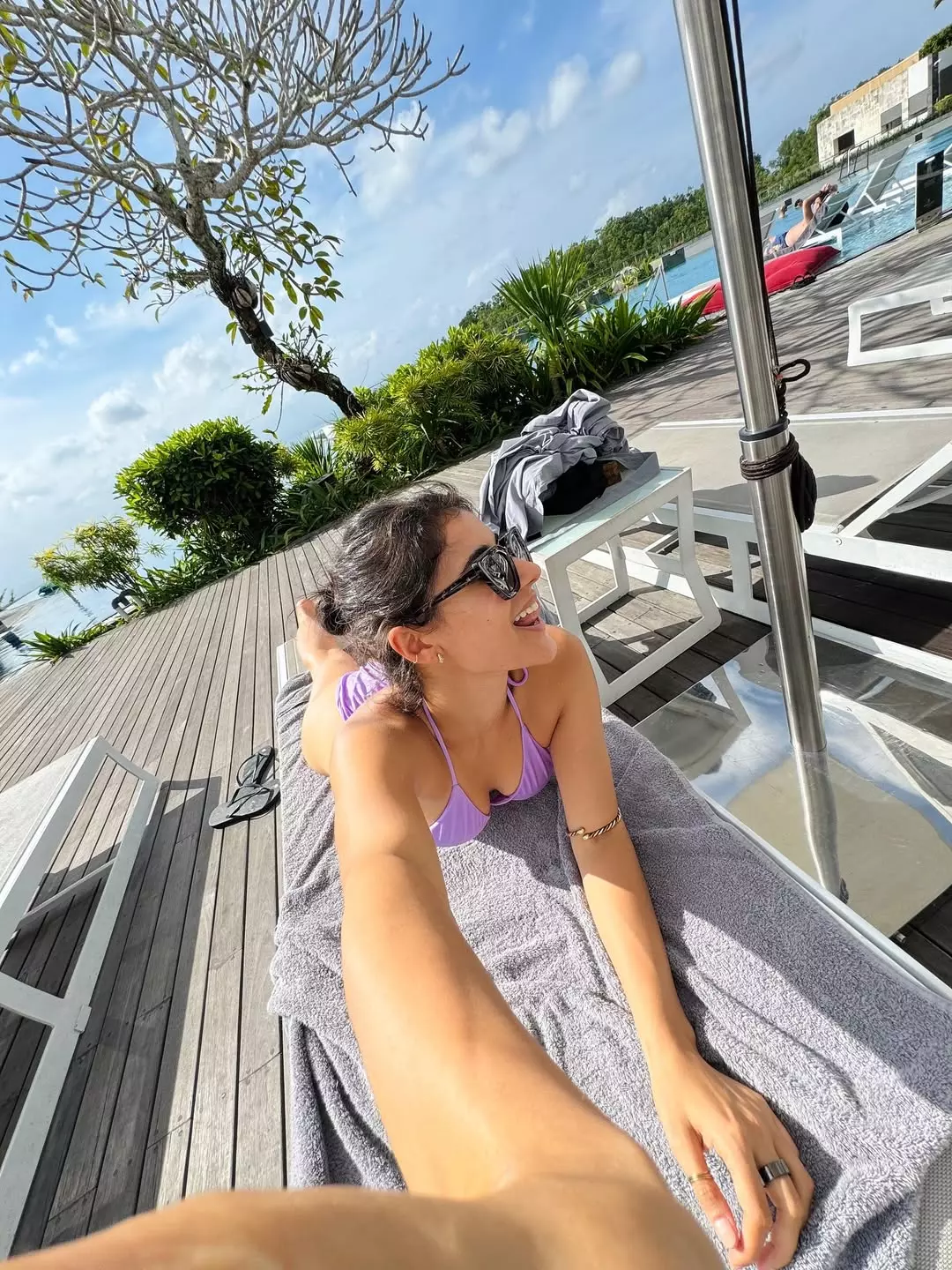 In the photo, Sonia is seen wearinga purple beach dress, standing under a bright blue sky with the sea in the background.