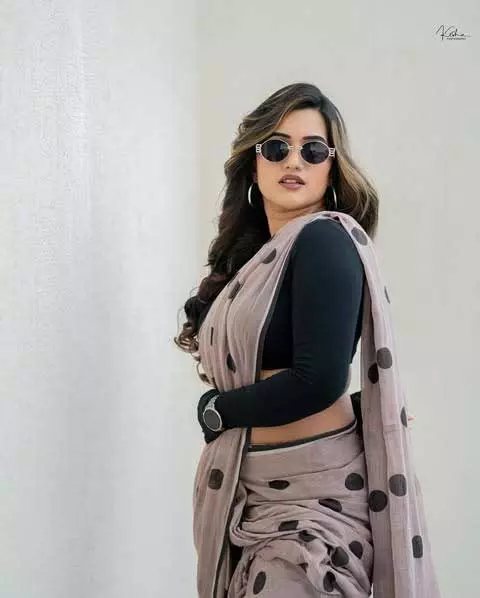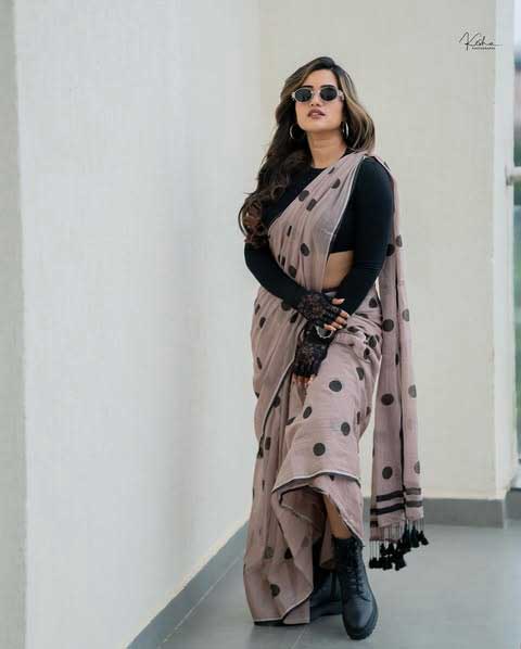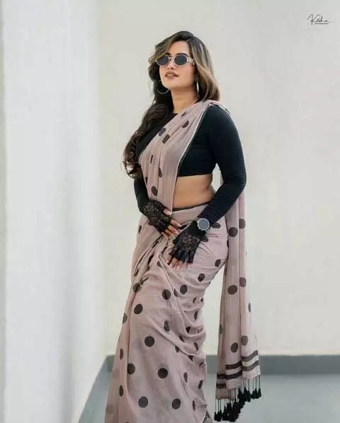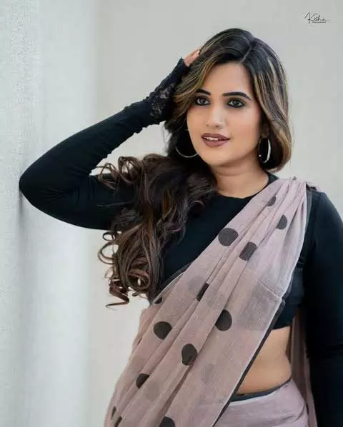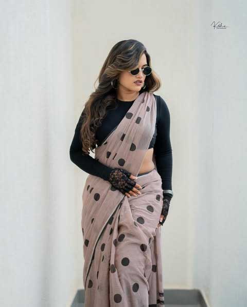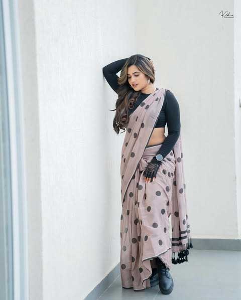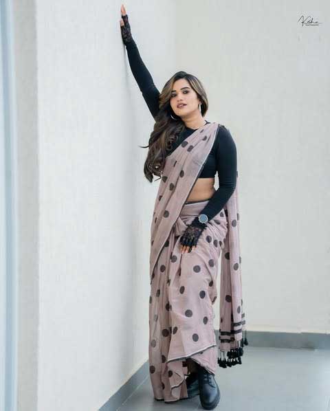 Recently, Sravanthi shared a new picture on her Instagram. She looked elegant in a Black crop top: @zara . Her look was enhanced by Saree: @suta_bombay