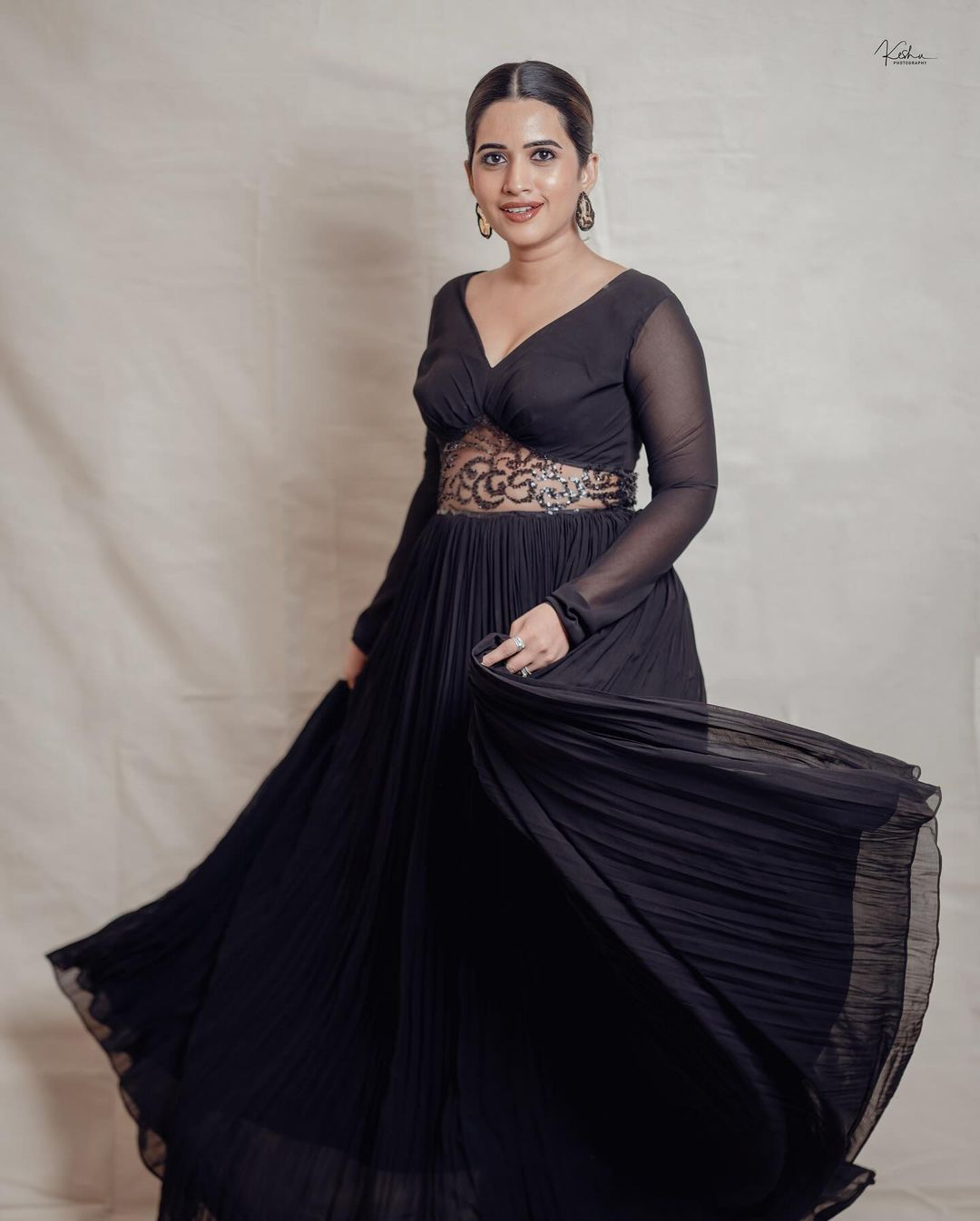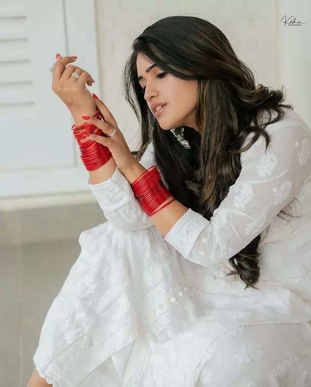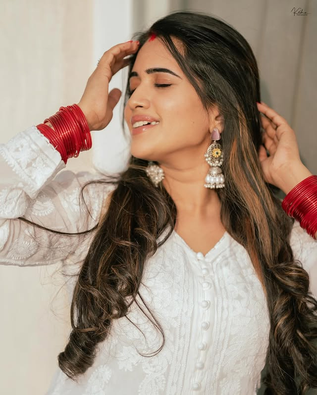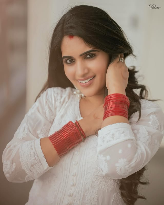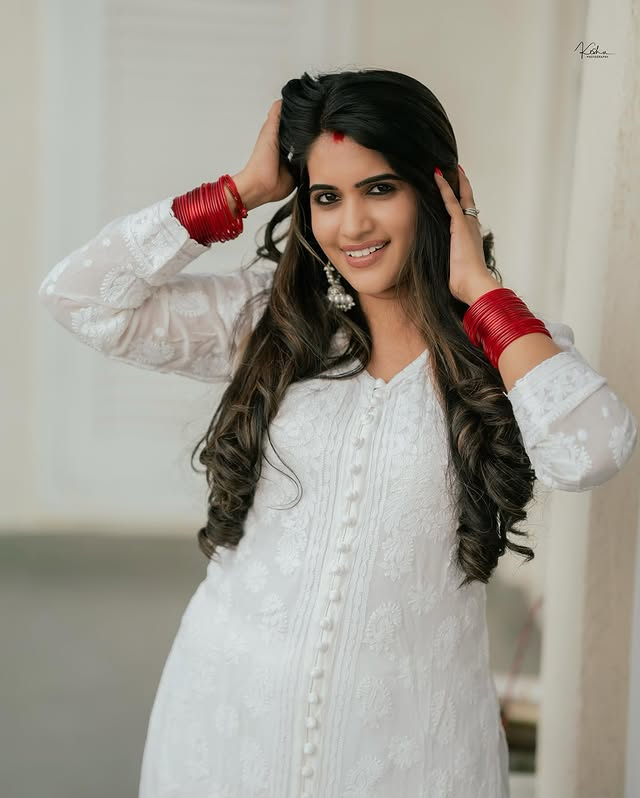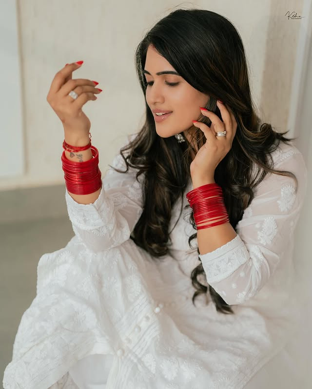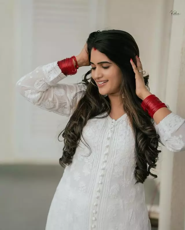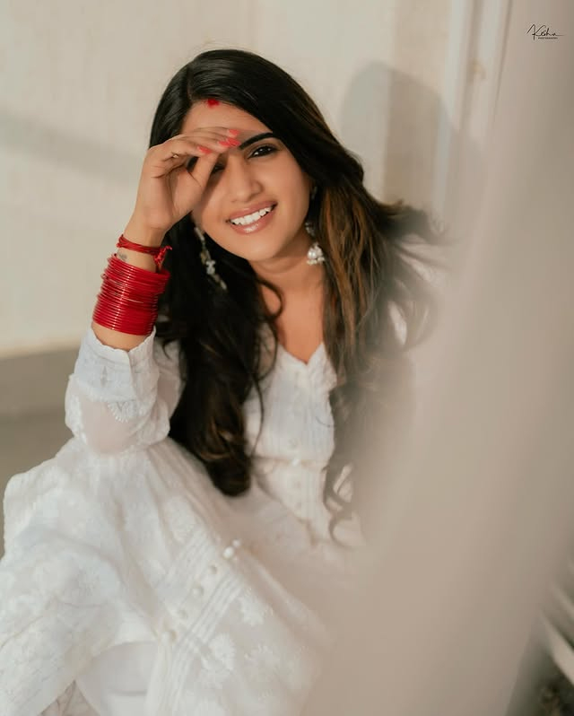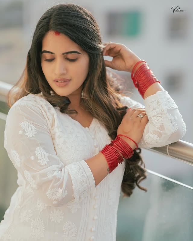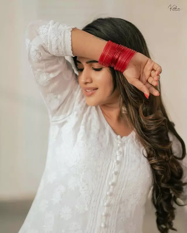 Her Instagram account offers a glimpse into her fashion journey. In one of her latest Instagram posts, Sravanthi looks radiant. She wore a white embroidered dress that exudes grace. Her red bangles and traditional earrings added more beauty. She smiled brightly in these pics and caption reads, "Just in love with these portraits."
