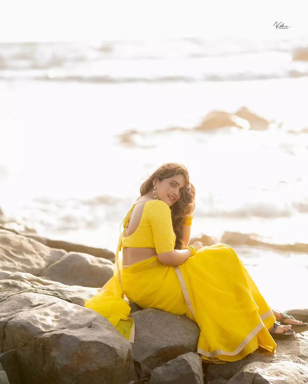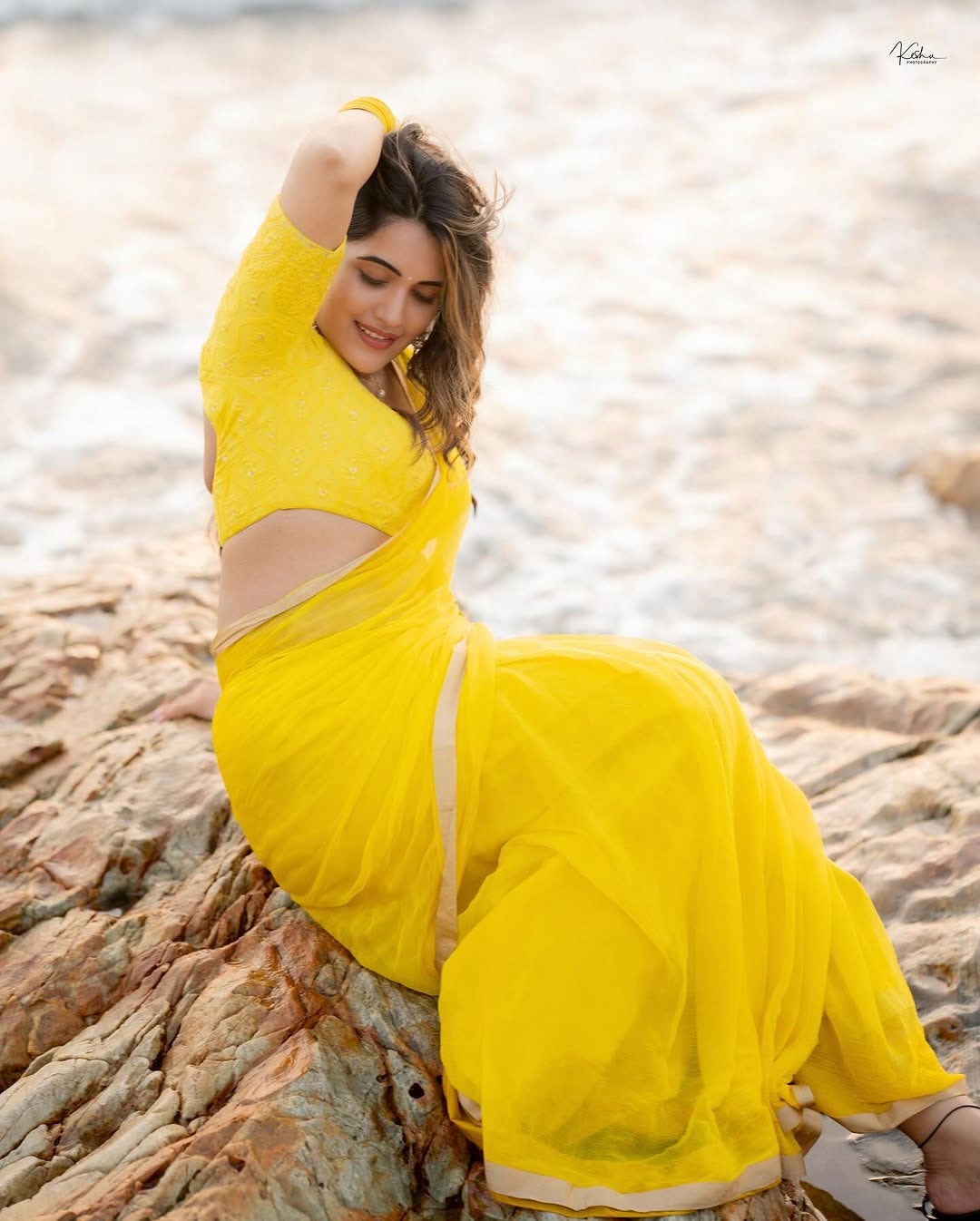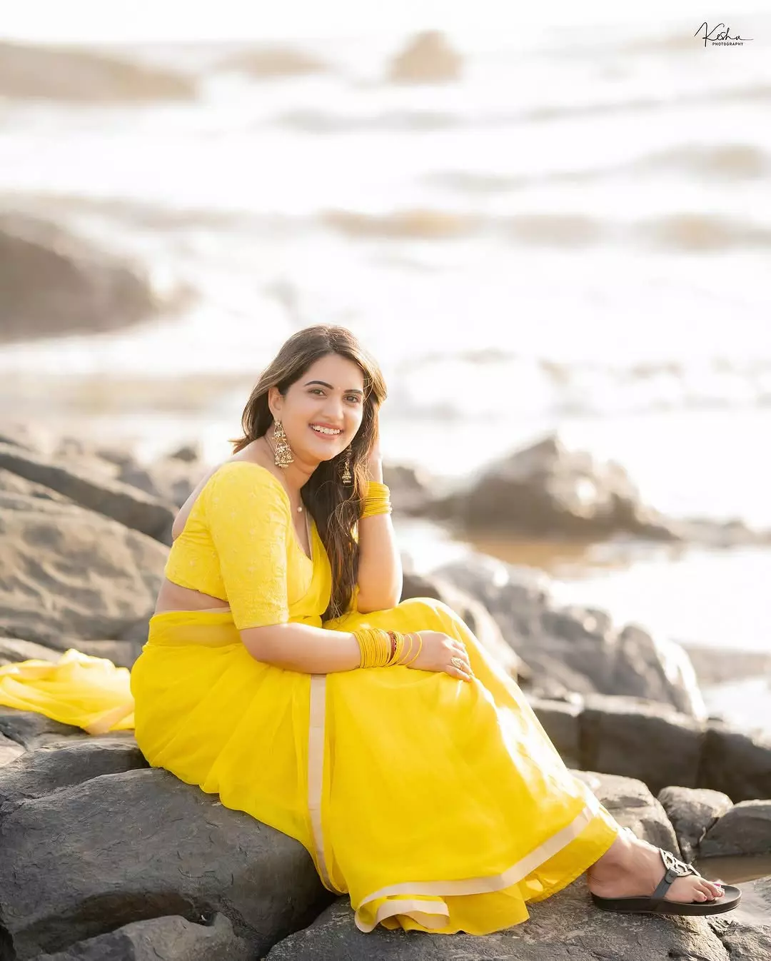 TV host and actress Sravanthi Chokarapu is winning hearts once again with her new Instagram post. She is dressed in a bright yellow saree. Sravanthi is seen sitting on a rocky beach, glowing in the golden sunset. With her eyes closed and a peaceful smile on her face, she captioned the post: β€œOcean eyes and sunset skies πŸŒžπŸ’›β€.