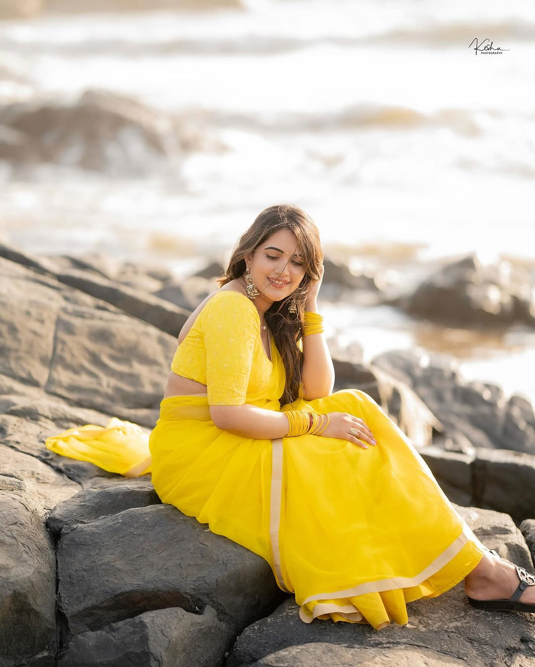The satee designed by @akirra-_label and the photo taken by @they-_call-_me-_keshu. Her yellow saree, traditional bangles and statement earrings complete the elegant yet simple look.