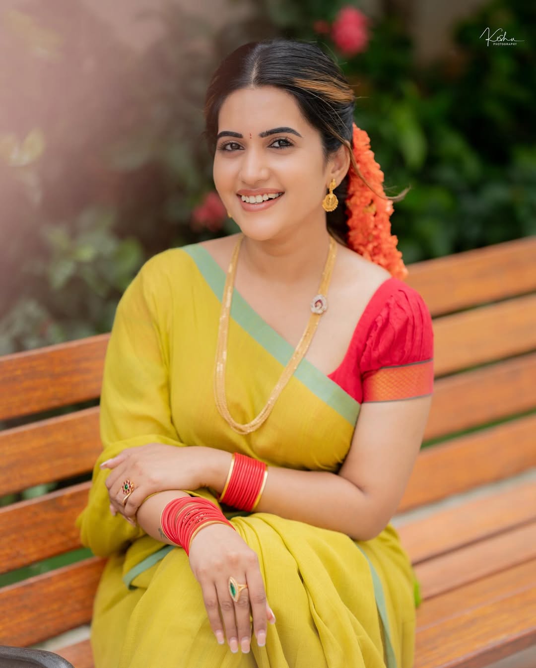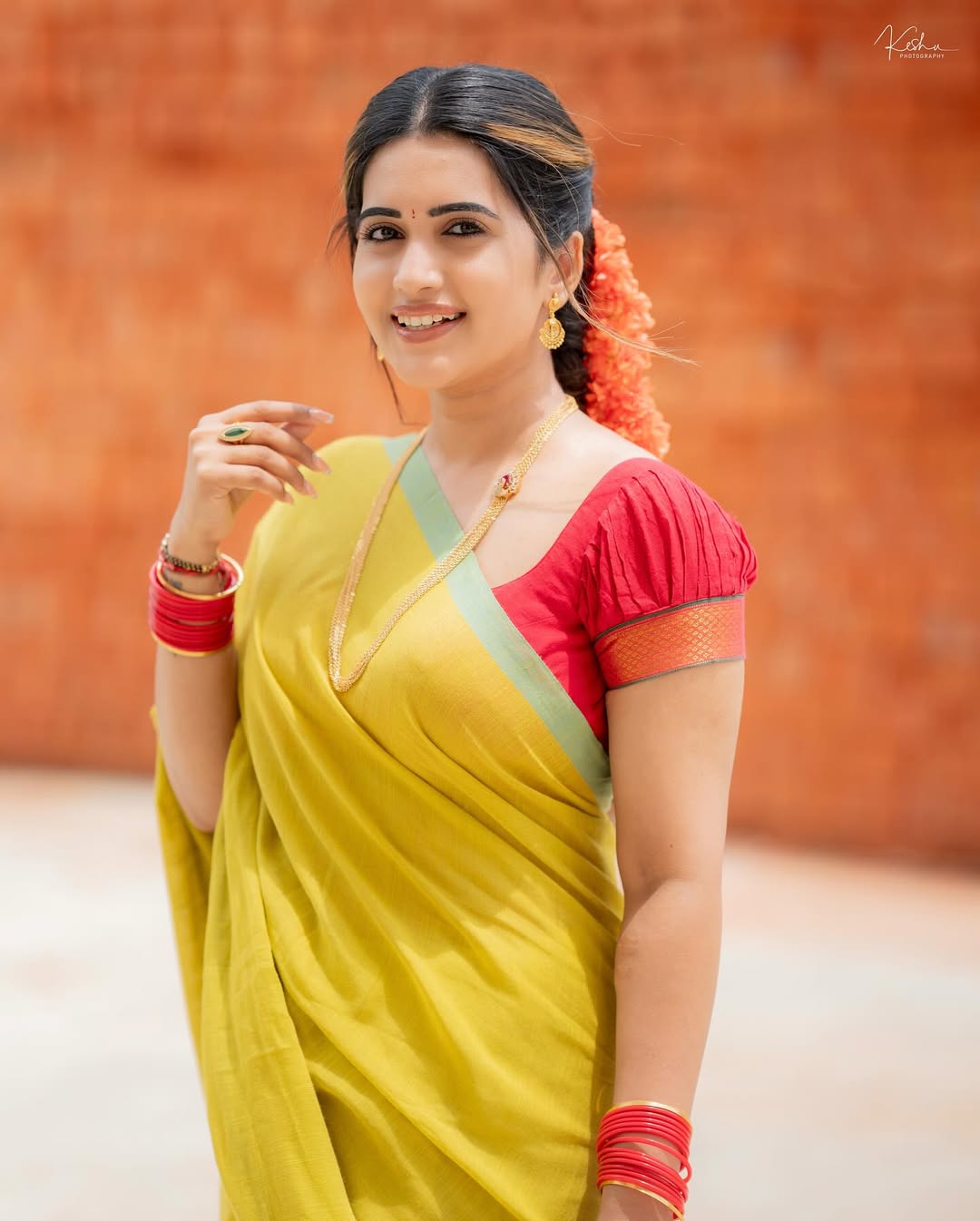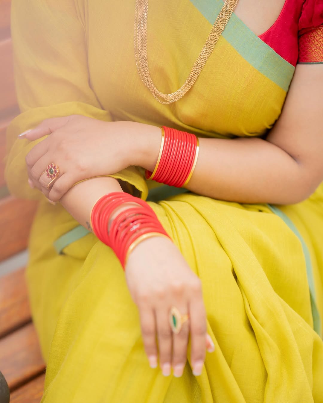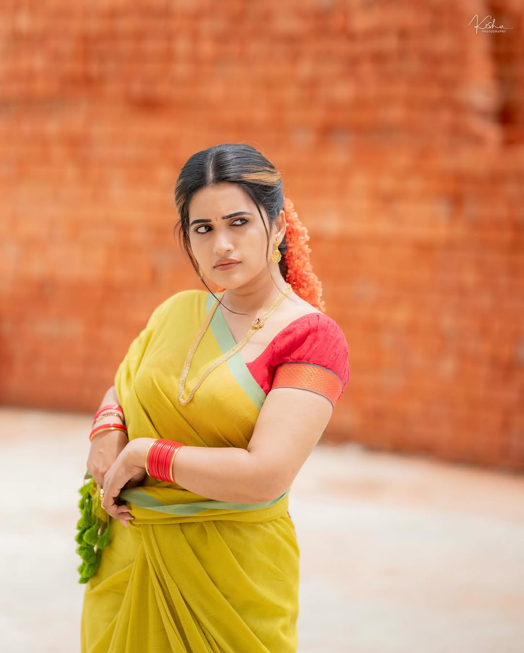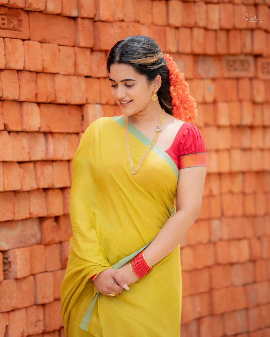 In her recent Instagram post, Sravanthi shared a picture where she looks dazzling in a bright yellow saree. The saree is from Suta Bombay. She paired the saree with red bangles and earrings. Her makeup and styling were done by Indhu Makeover, while her hair was styled by Keshu. The photo was taken by Keshu as well.