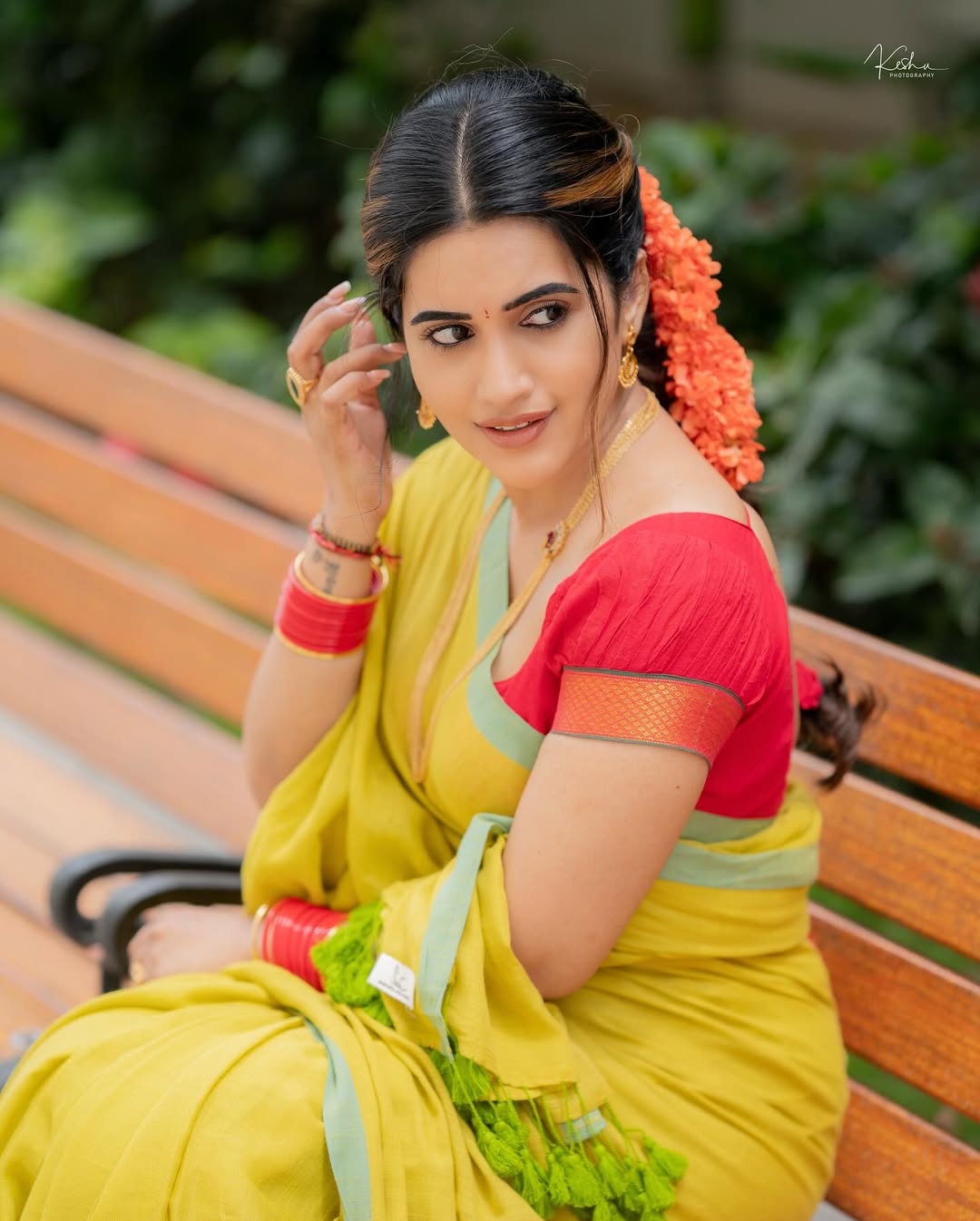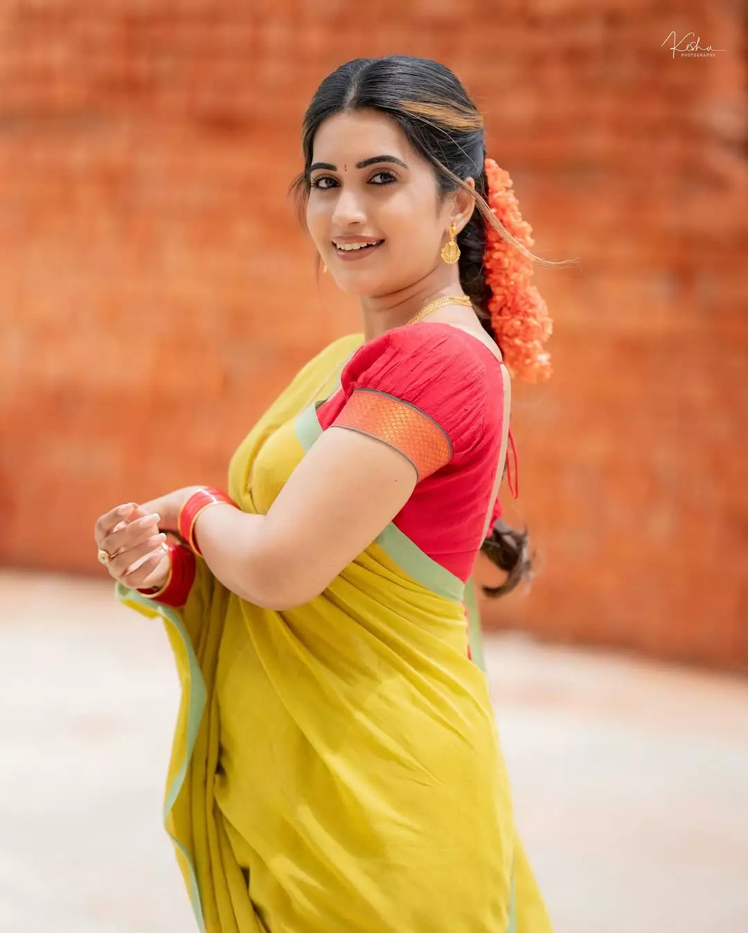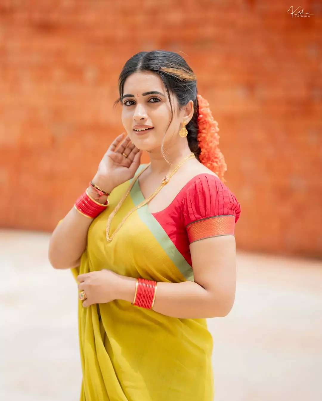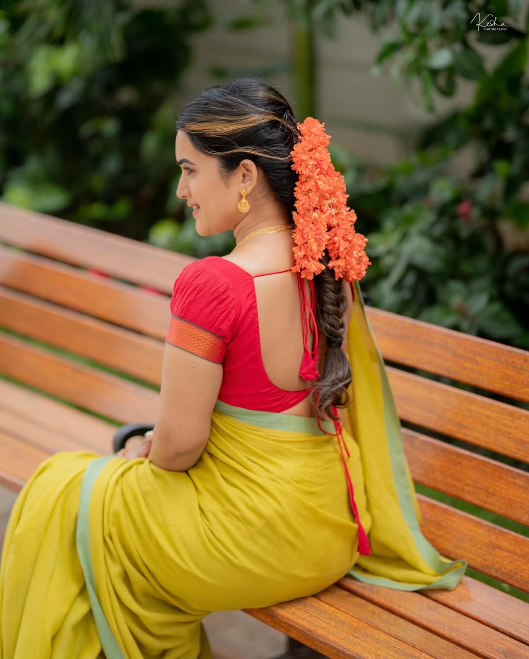 In her recent Instagram post, Sravanthi shared a picture where she looks dazzling in a bright yellow saree. The saree is from Suta Bombay. She paired the saree with red bangles and earrings. Her makeup and styling were done by Indhu Makeover, while her hair was styled by Keshu. The photo was taken by Keshu as well.