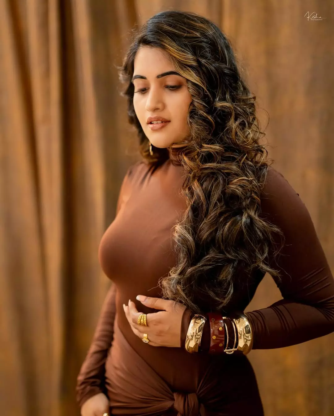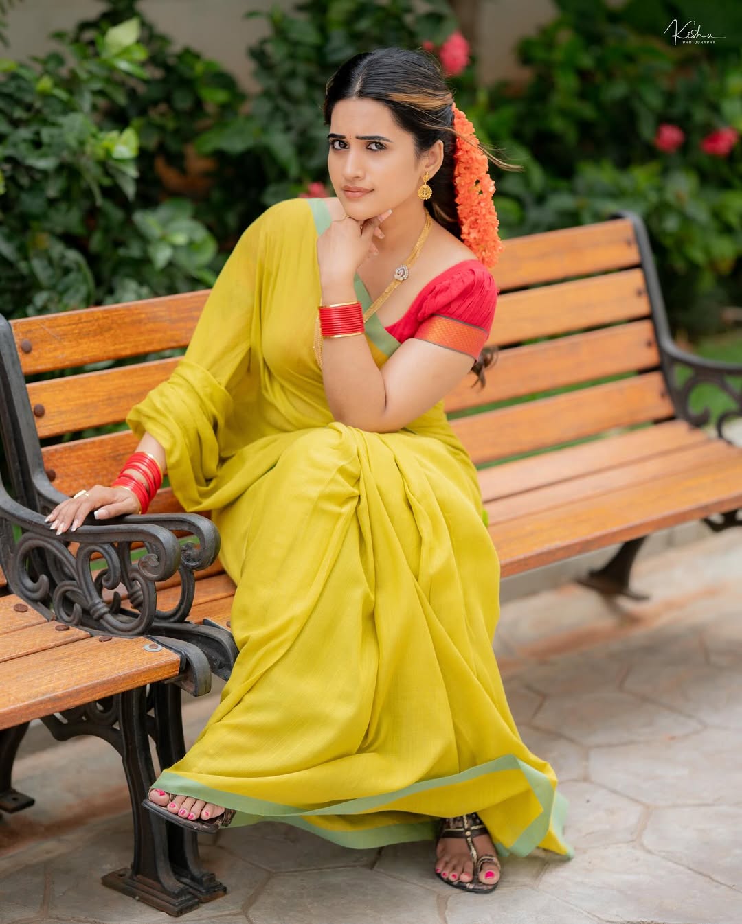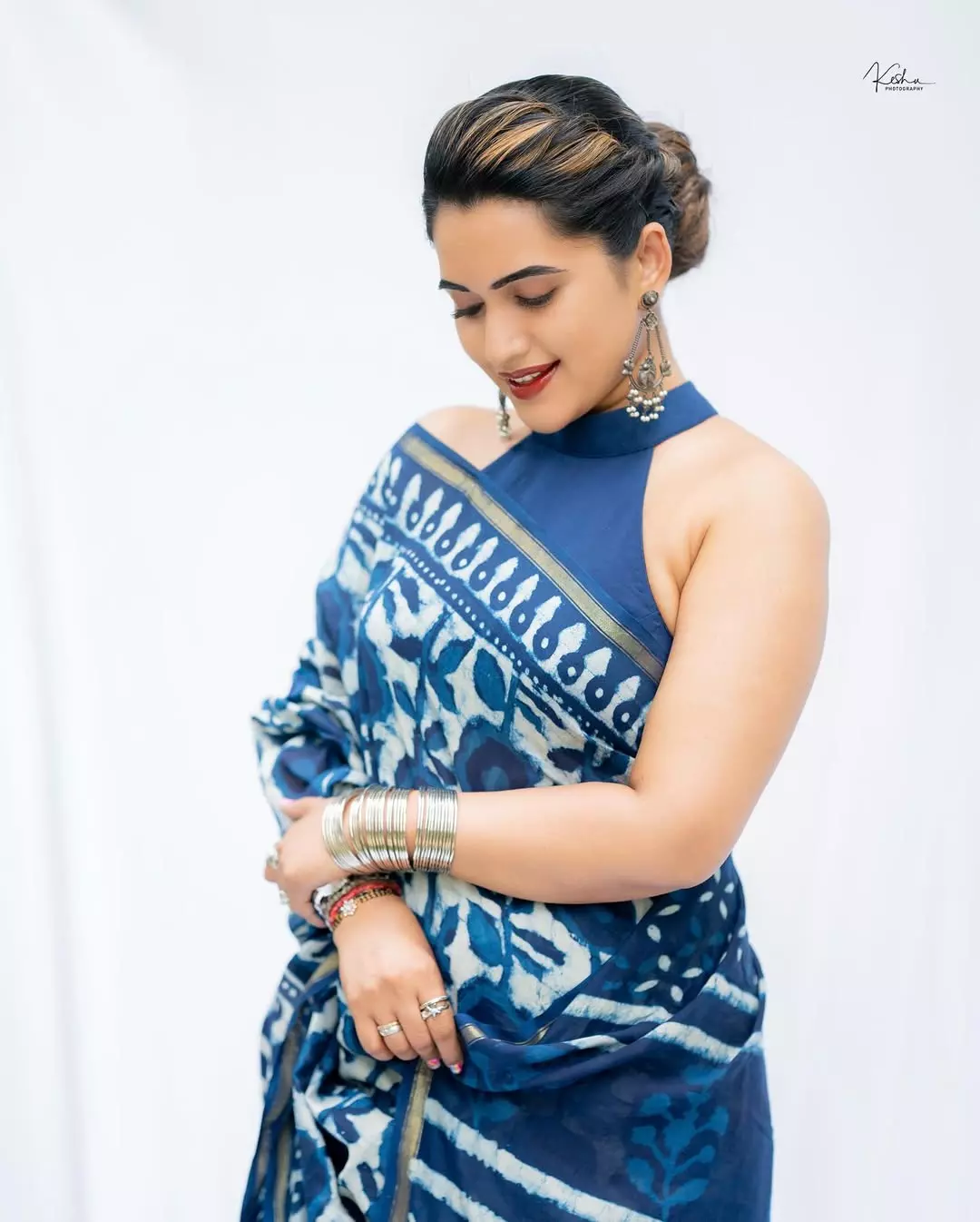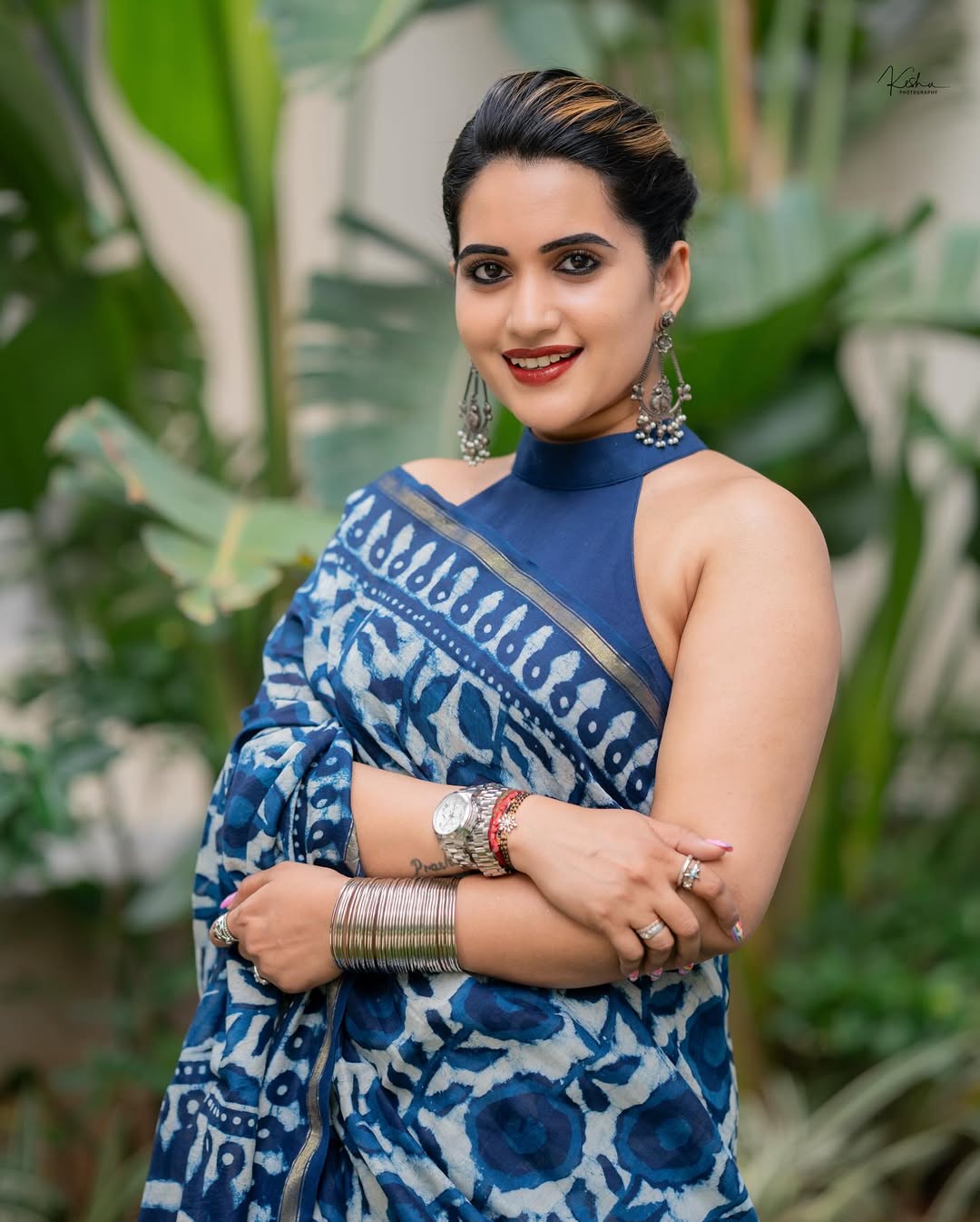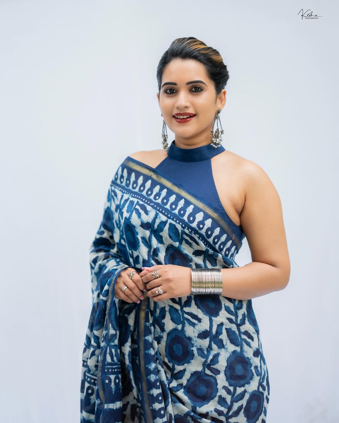 In her recent Instagram post, Sravanthi shared a picture where she looks dazzling in a bright yellow saree. The saree is from Suta Bombay. She paired the saree with red bangles and earrings. Her makeup and styling were done by Indhu Makeover, while her hair was styled by Keshu. The photo was taken by Keshu as well.