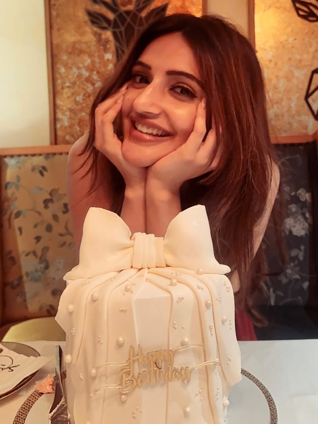 In the picture, Sreeleela is smiling warmly while resting her face on her hands in a cute pose. She looks stylish and graceful in a simple yet charming setting. In front of her is a wonderful birthday cake with a big bow on it. The cake adds happiness to the moment, reflecting the birthday vibes.