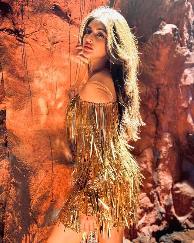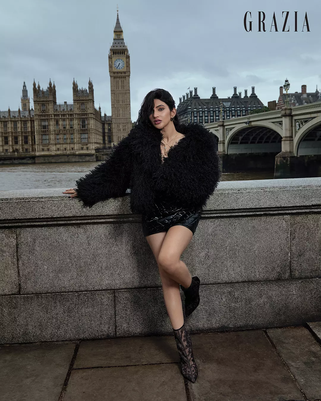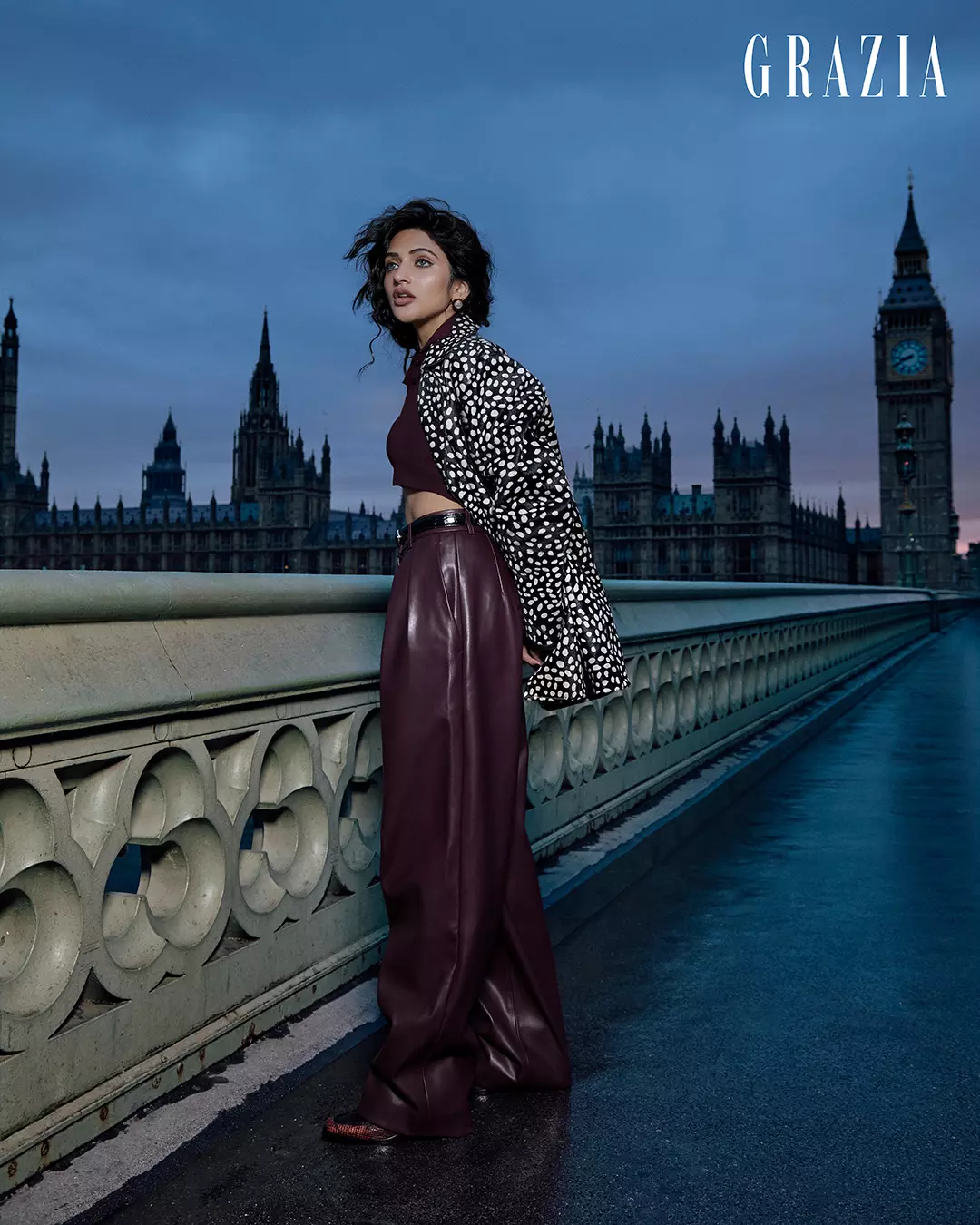 In the shoot, Sreeleela exudes effortless sophistication wearing a ribbed knit top, faux shearling cropped peacoat, and padded micro mini skirt by Michael Kors (@michaelkors). Her look is accentuated with ‘Lion’s Claw’ and ‘Samurai’ pearl pendants by Misho (@misho_designs), gold-plated Retro Chic earrings, and ‘Mon Amour’ booties by Aquazzura (@aquazzura). The ensemble mirrors her personality — bold, graceful, and adventurous.