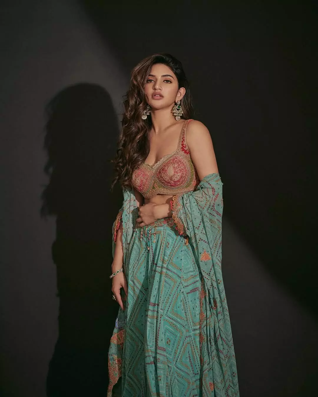 Sreeleela turns the studio into a royal mint, deep maroon pre-pleated saree cascading with gold coin fringes while a silver corset blouse hugs like liquid mercury. One hand lifts tousled waves, the other flashes an ornate cuff—smile dialed to just because. For no reason ;).