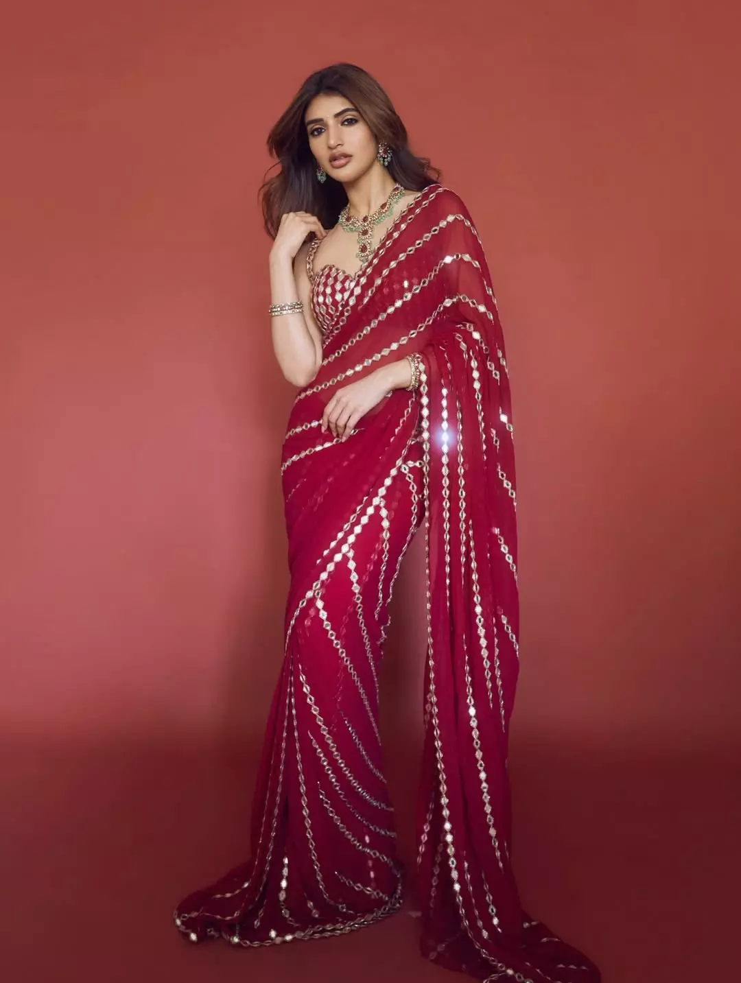 Sreeleela, the radiant young actress seen here in a stunning red traditional outfit with shimmering mirror work and ornate polki jewelry
