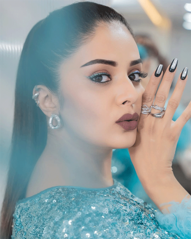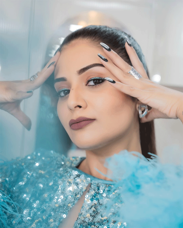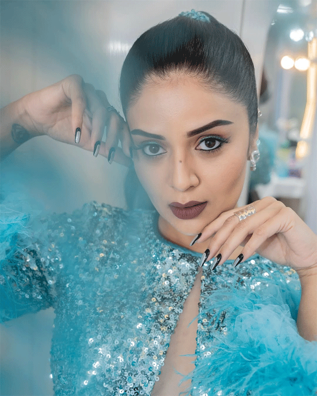 Sreemukhi Sparkles in Feathered Blue Dress