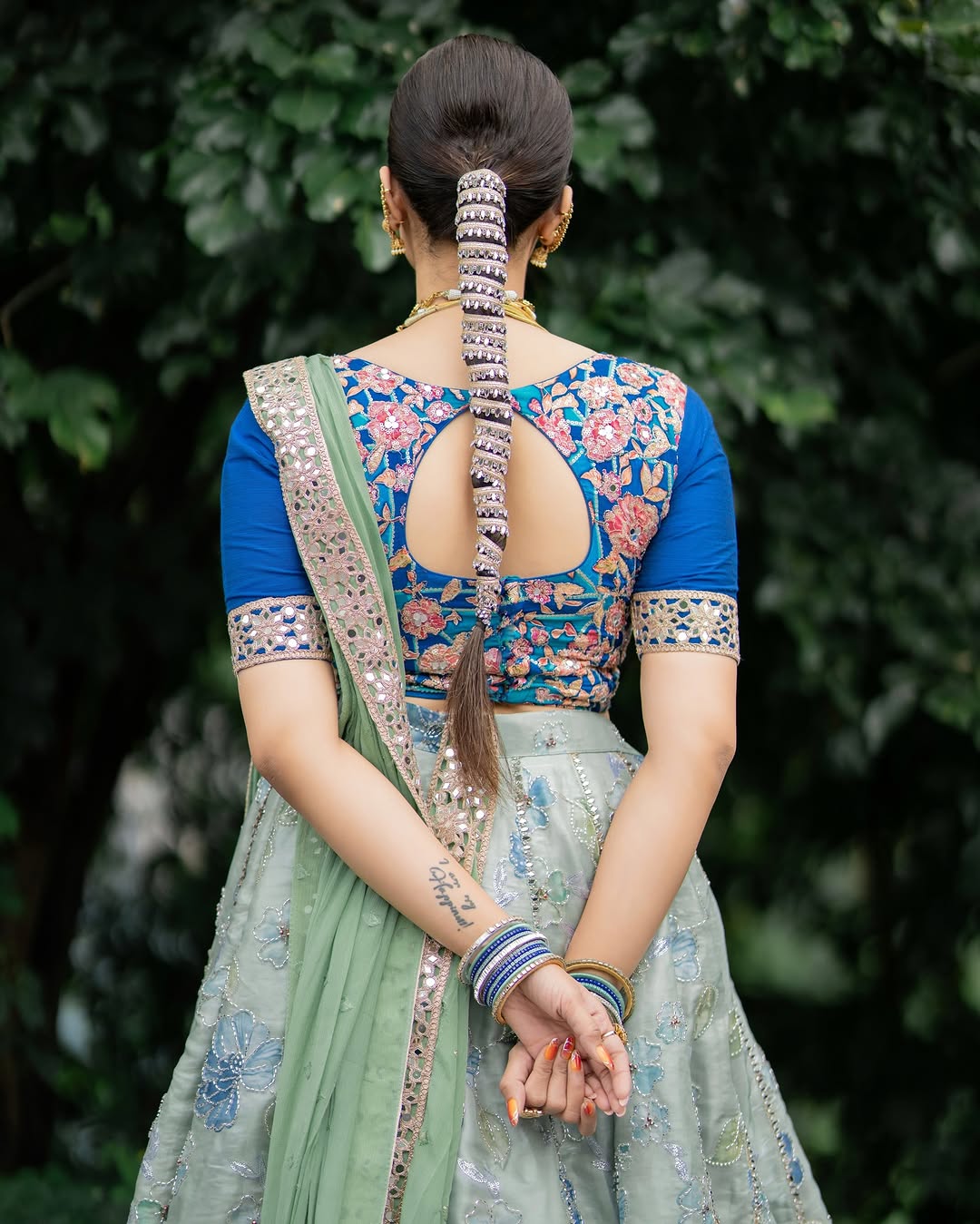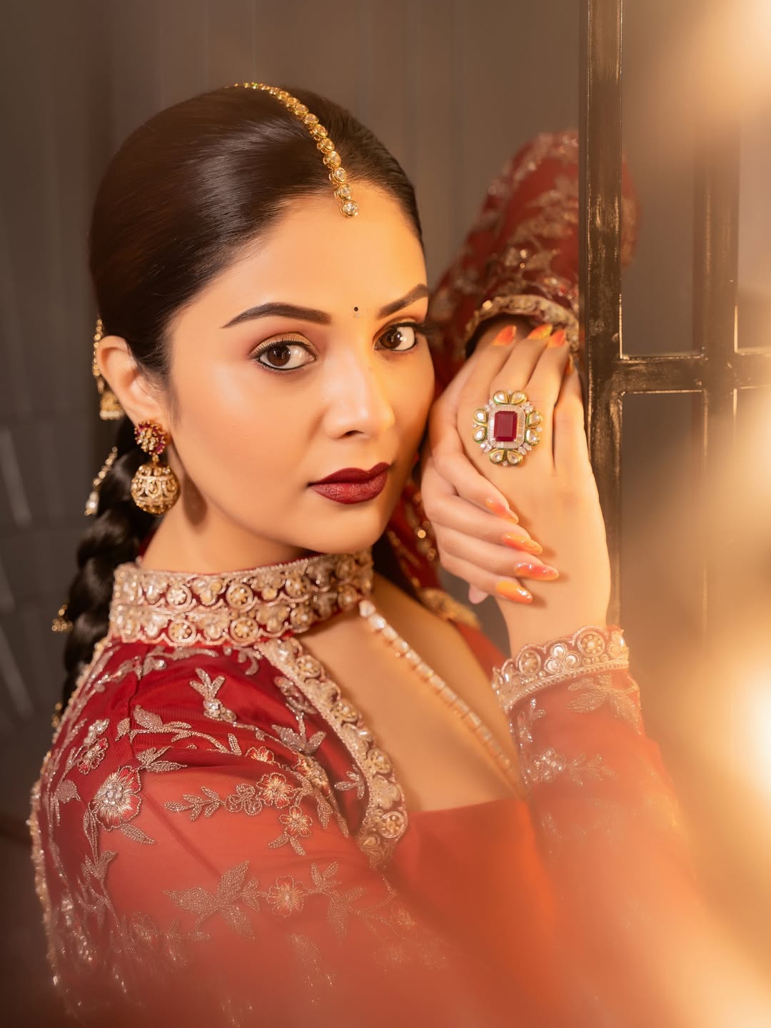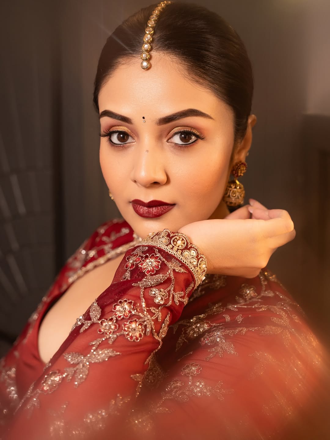 Her accessories elevate the look to statement-worthy heights: dazzling earrings from Samyu Collections perfectly complement her neckline, while delicate rings by Ambica Pearls and Jewellers add a subtle sparkle, striking the ideal balance between refinement and boldness. Makeup by Elegant Makeover Studio enhances her natural radiance, with a soft glow and defined eyes that tie the look together flawlessly. Mahesh Ravulapalli’s sleek, voluminous hairstyling adds movement and sophistication, completing the ensemble with finesse.