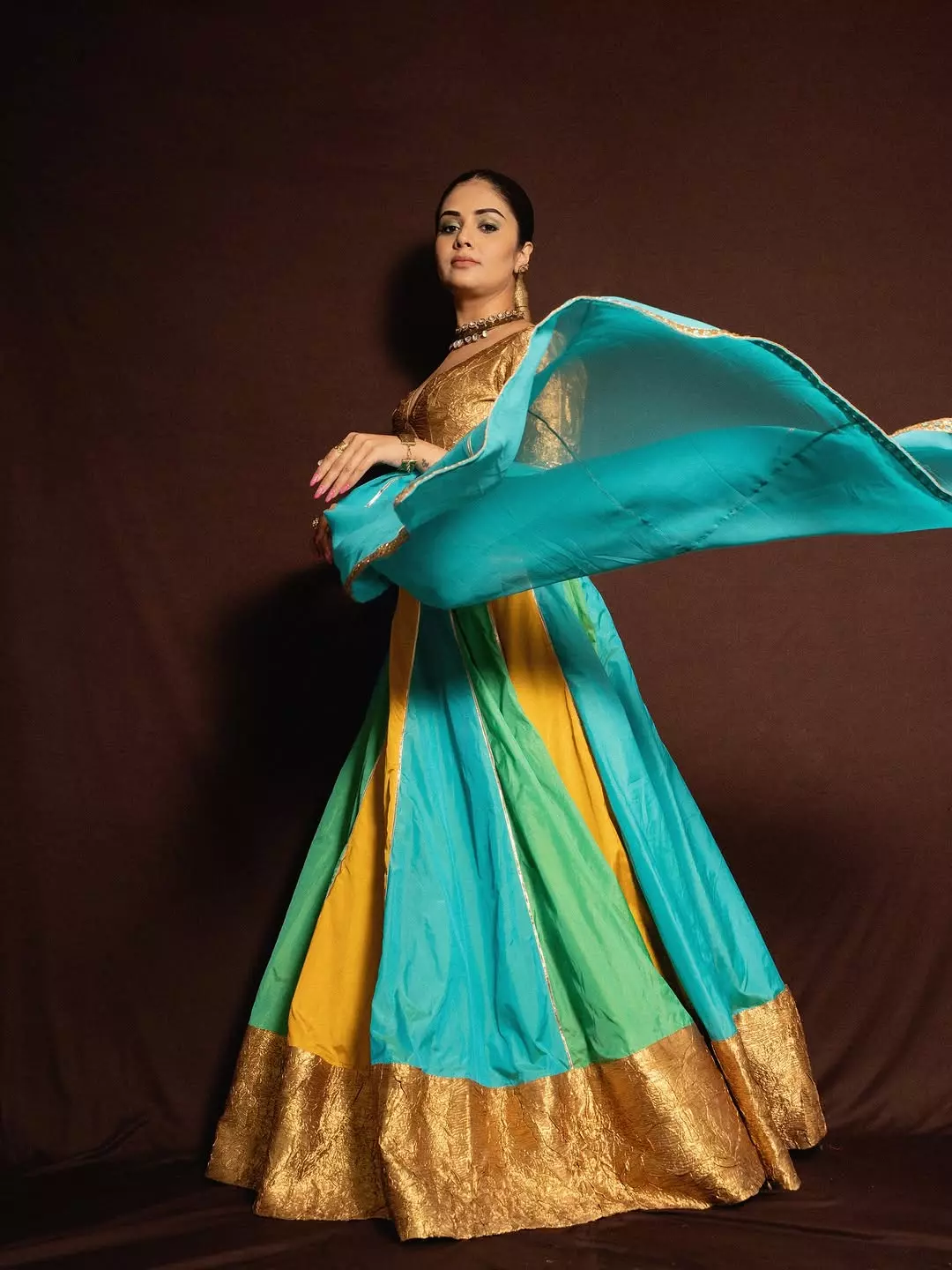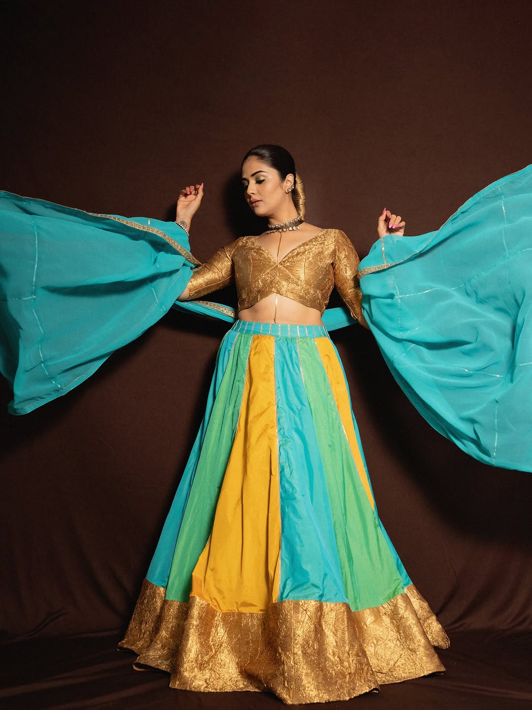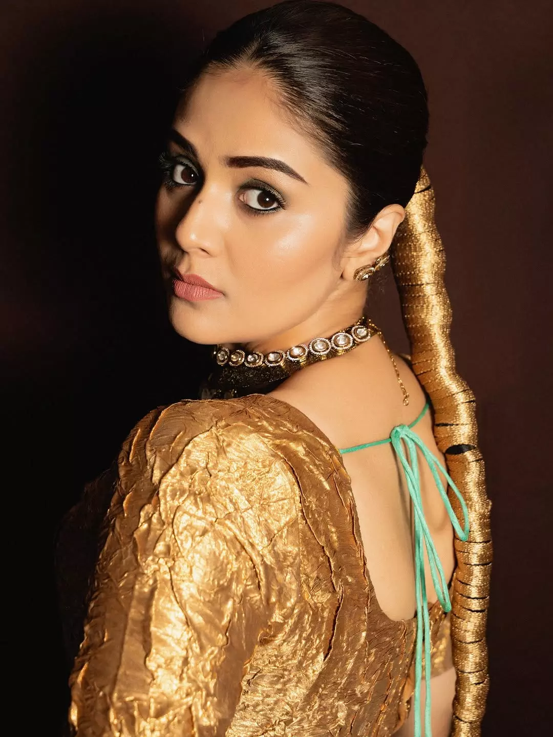 Her accessories elevate the look to statement-worthy heights: dazzling earrings from Samyu Collections perfectly complement her neckline, while delicate rings by Ambica Pearls and Jewellers add a subtle sparkle, striking the ideal balance between refinement and boldness. Makeup by Elegant Makeover Studio enhances her natural radiance, with a soft glow and defined eyes that tie the look together flawlessly. Mahesh Ravulapalli’s sleek, voluminous hairstyling adds movement and sophistication, completing the ensemble with finesse.