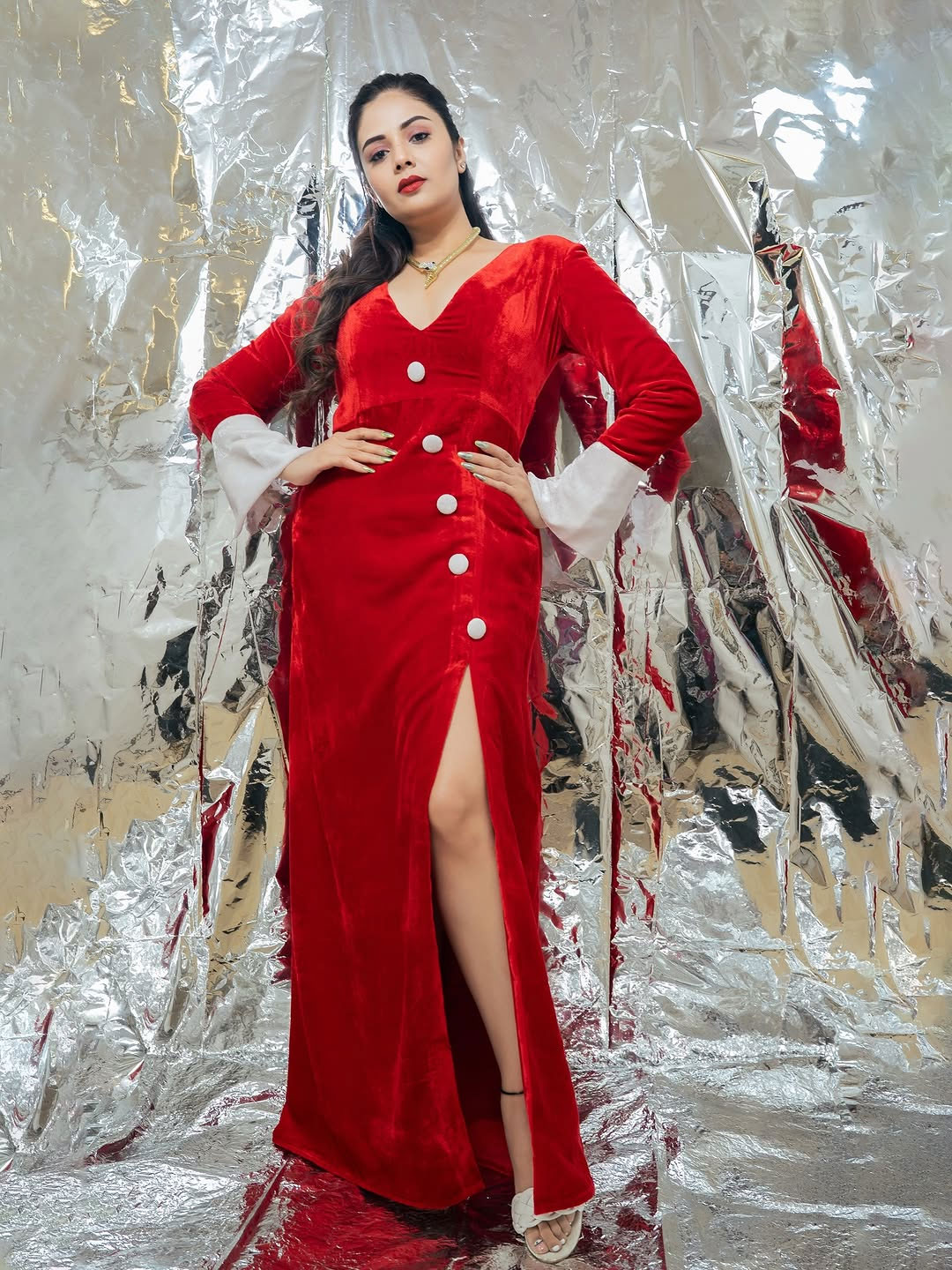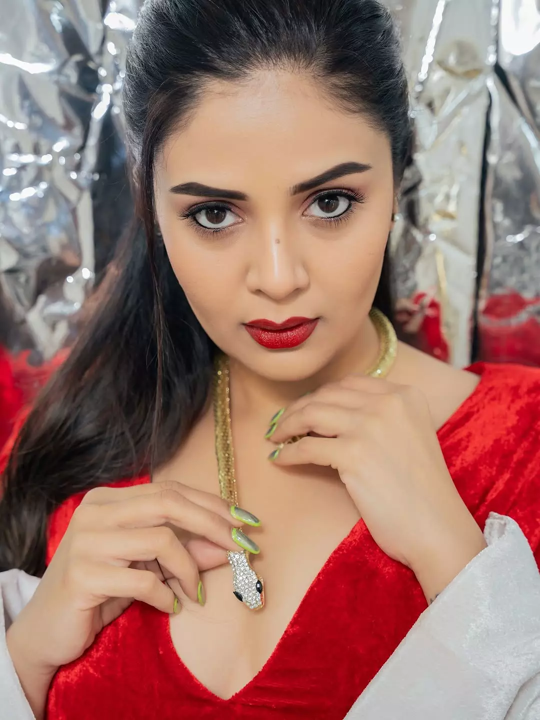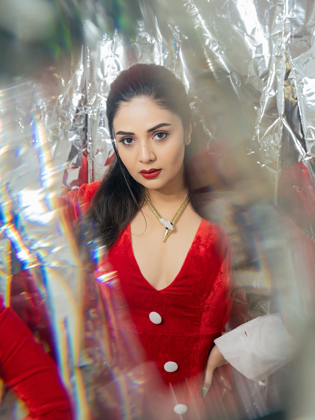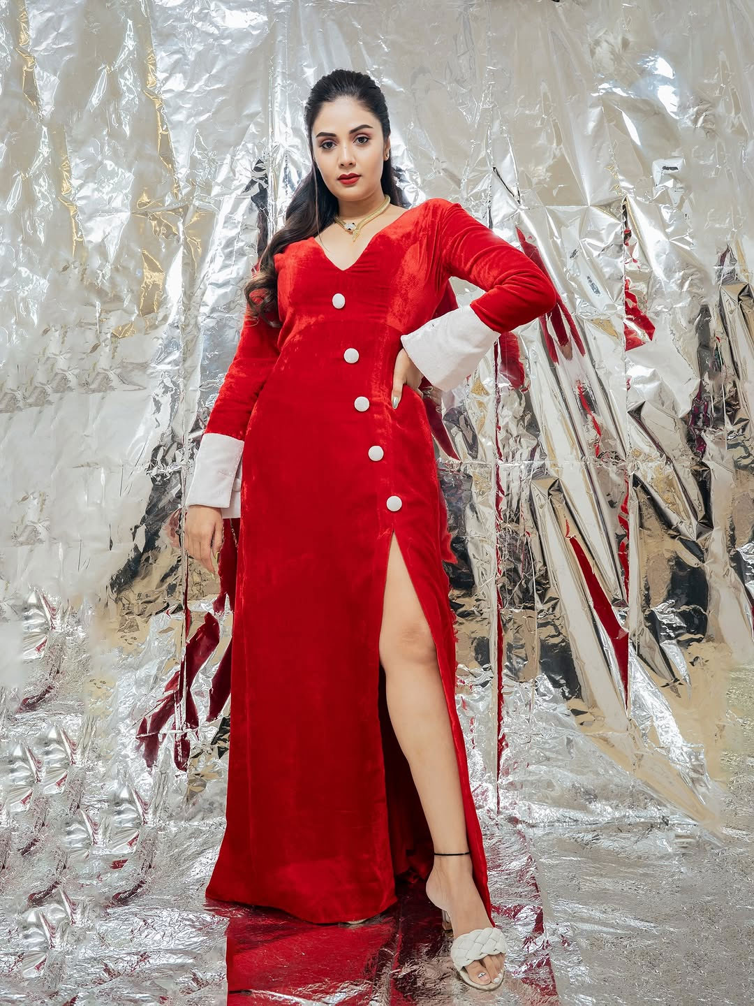 Sreemukhi recently shared a dazzling new picture on her Instagram with the caption “❤️✨”, letting the image speak for itself. Her look was styled by Greeshma Krishna while her elegant red velvet dress with white button detailing was designed by Designs by Snowbeadz. The photograph was captured by Manoj Gangula with her glam look completed by Elegant Makeover Studio for makeup and Mahesh Ravulapalli for hair.