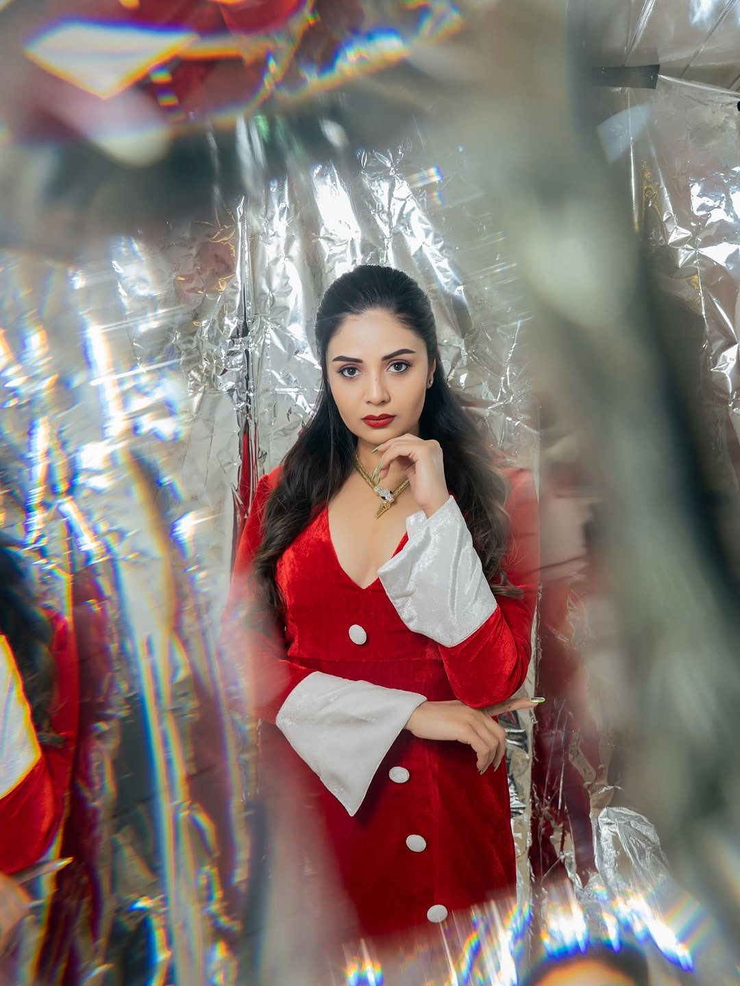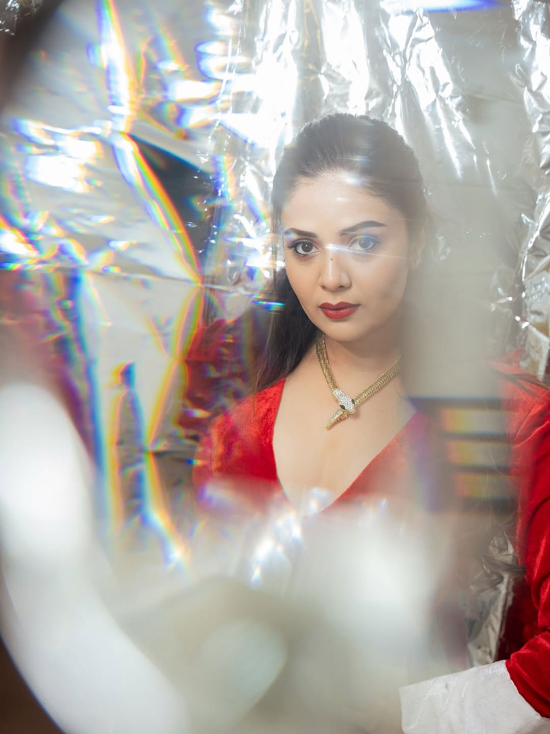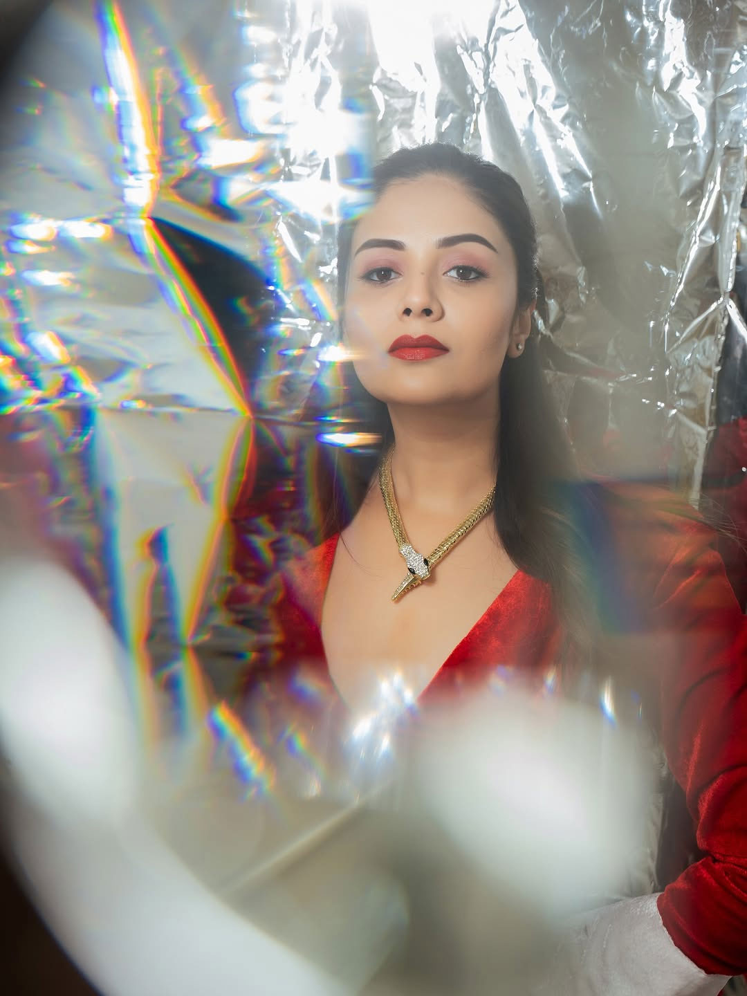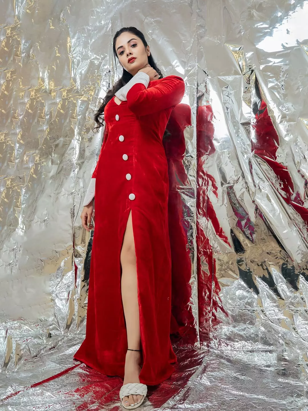 Sreemukhi recently shared a dazzling new picture on her Instagram with the caption “❤️✨”, letting the image speak for itself. Her look was styled by Greeshma Krishna while her elegant red velvet dress with white button detailing was designed by Designs by Snowbeadz. The photograph was captured by Manoj Gangula with her glam look completed by Elegant Makeover Studio for makeup and Mahesh Ravulapalli for hair.