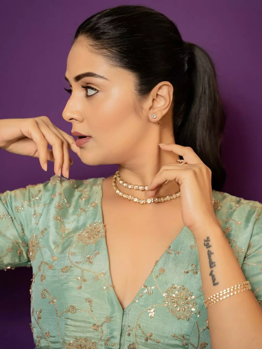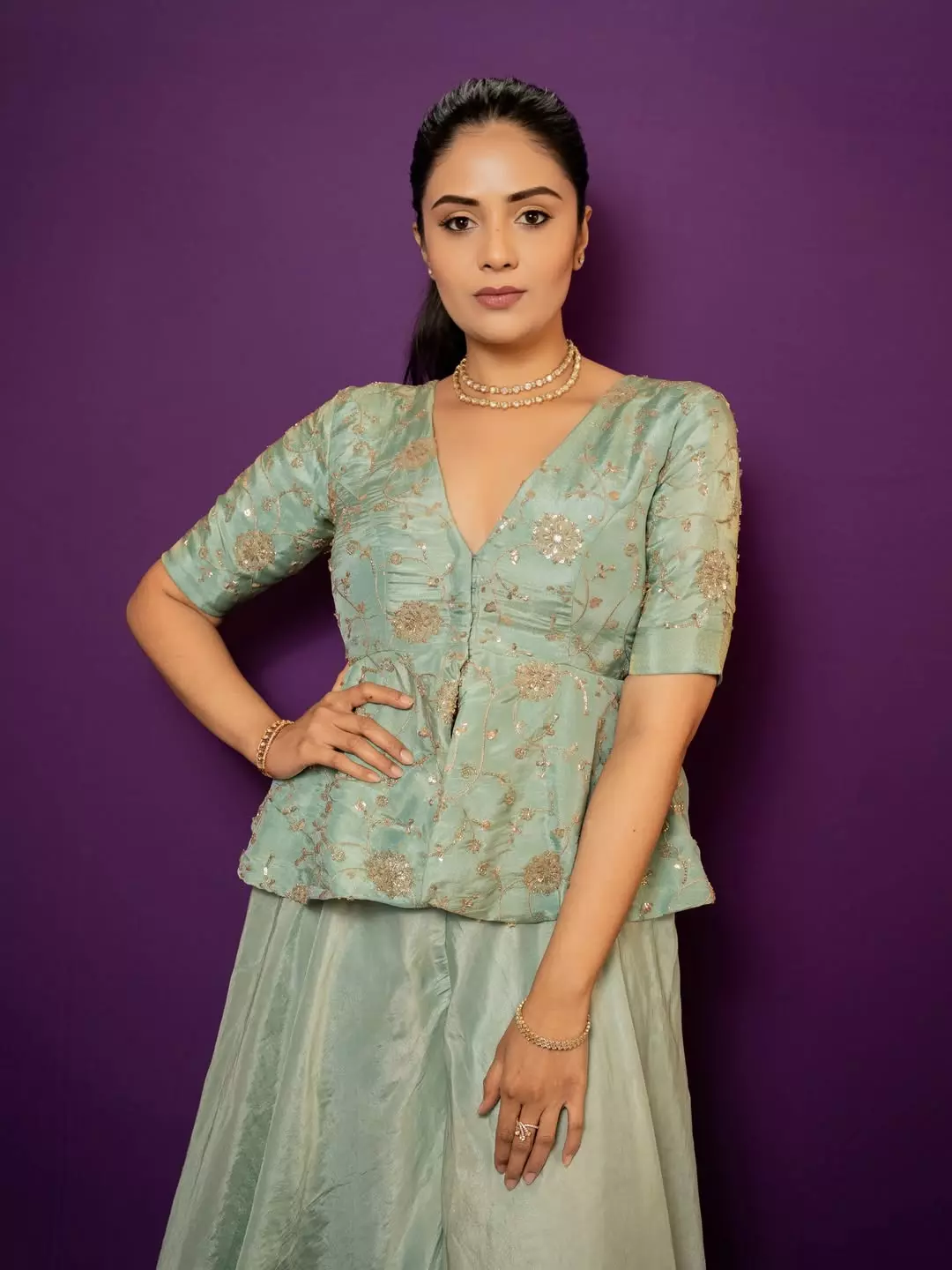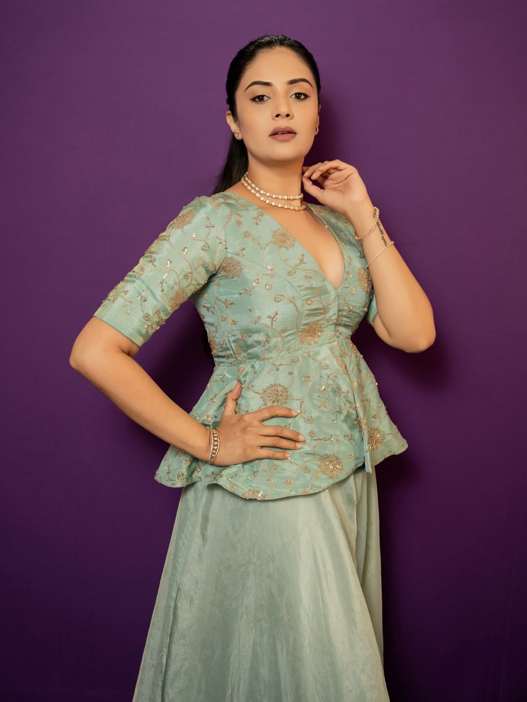 This graceful studio portrait of Sreemukhi highlights her poised elegance in a delicate mint-green embroidered peplum top paired with a flowing skirt.