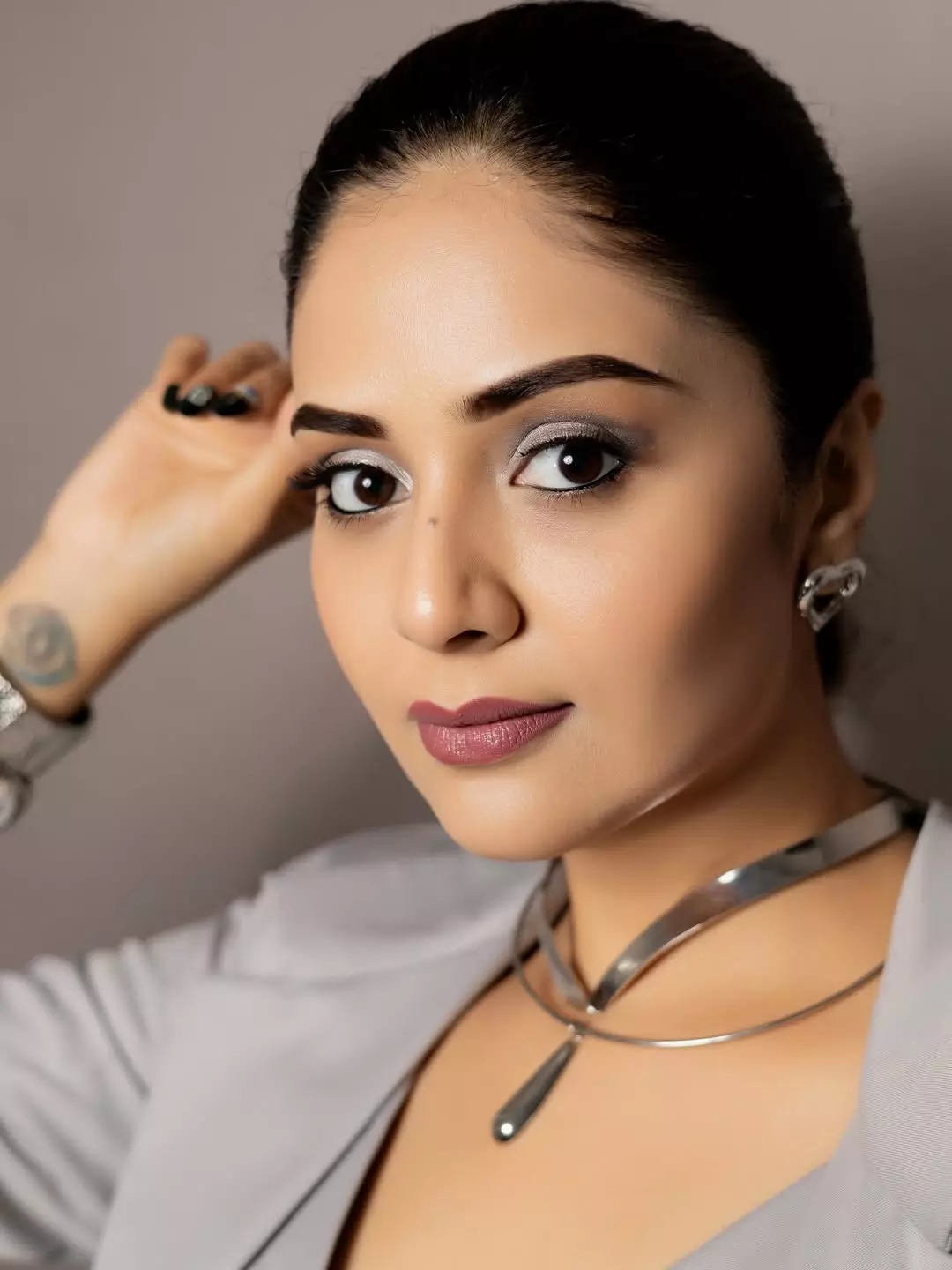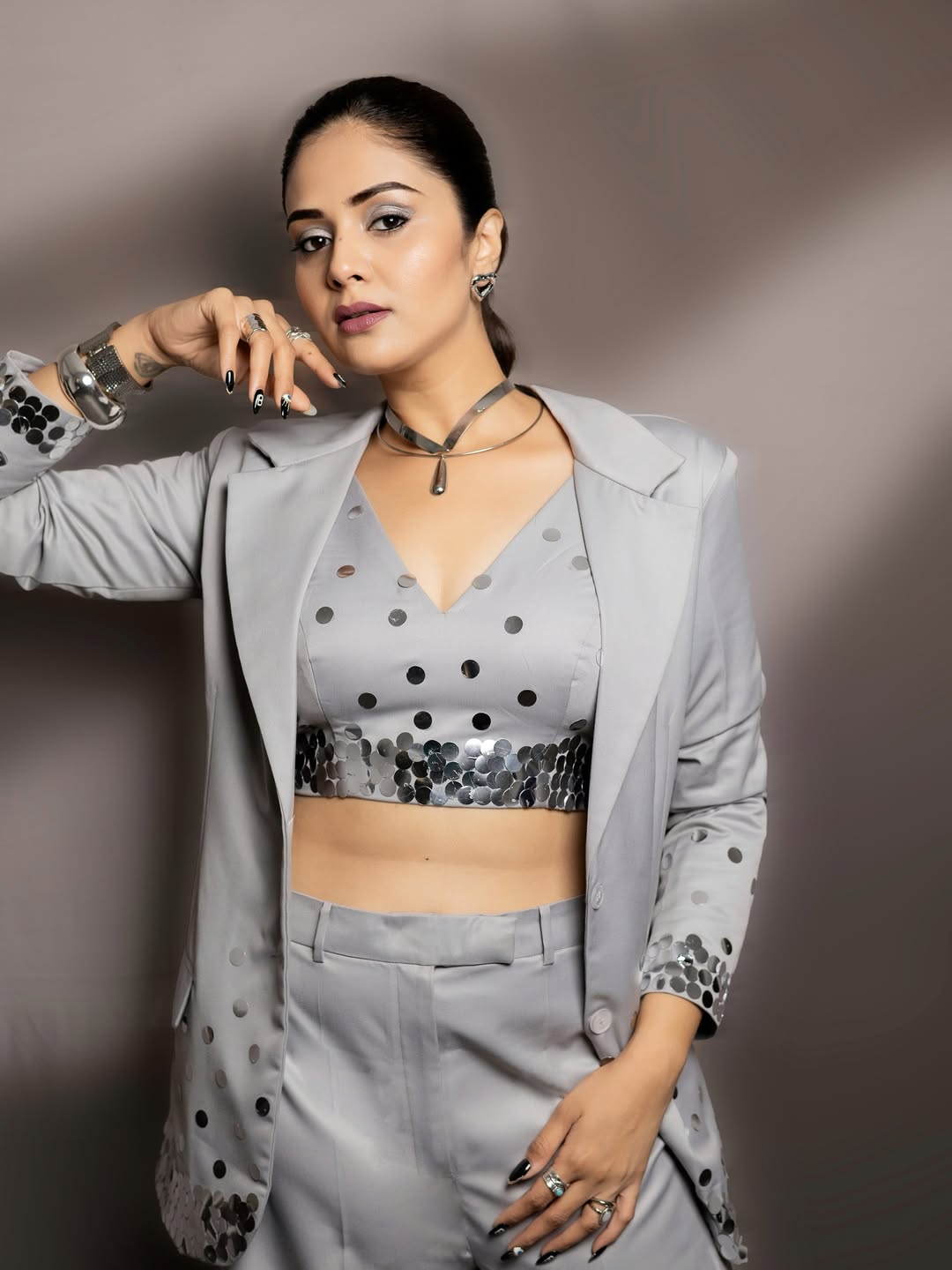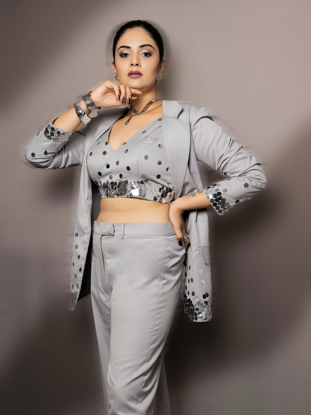 Sreemukhi recently shared an elegant post on Instagram by showcasing her stylish look. In the photo, she can be seen dressed in a chic grey outfit that consists of a sleek, satin-like pant paired with a modern top.