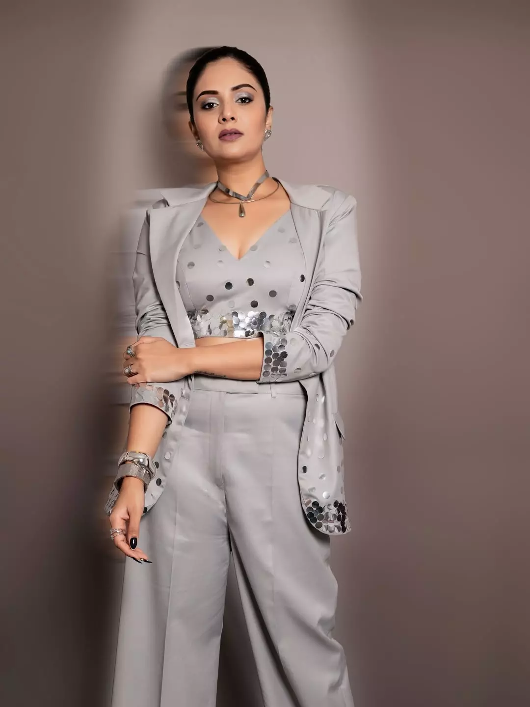 In the photo, she can be seen dressed in a chic grey outfit that consists of a sleek, satin-like pant paired with a modern top.
