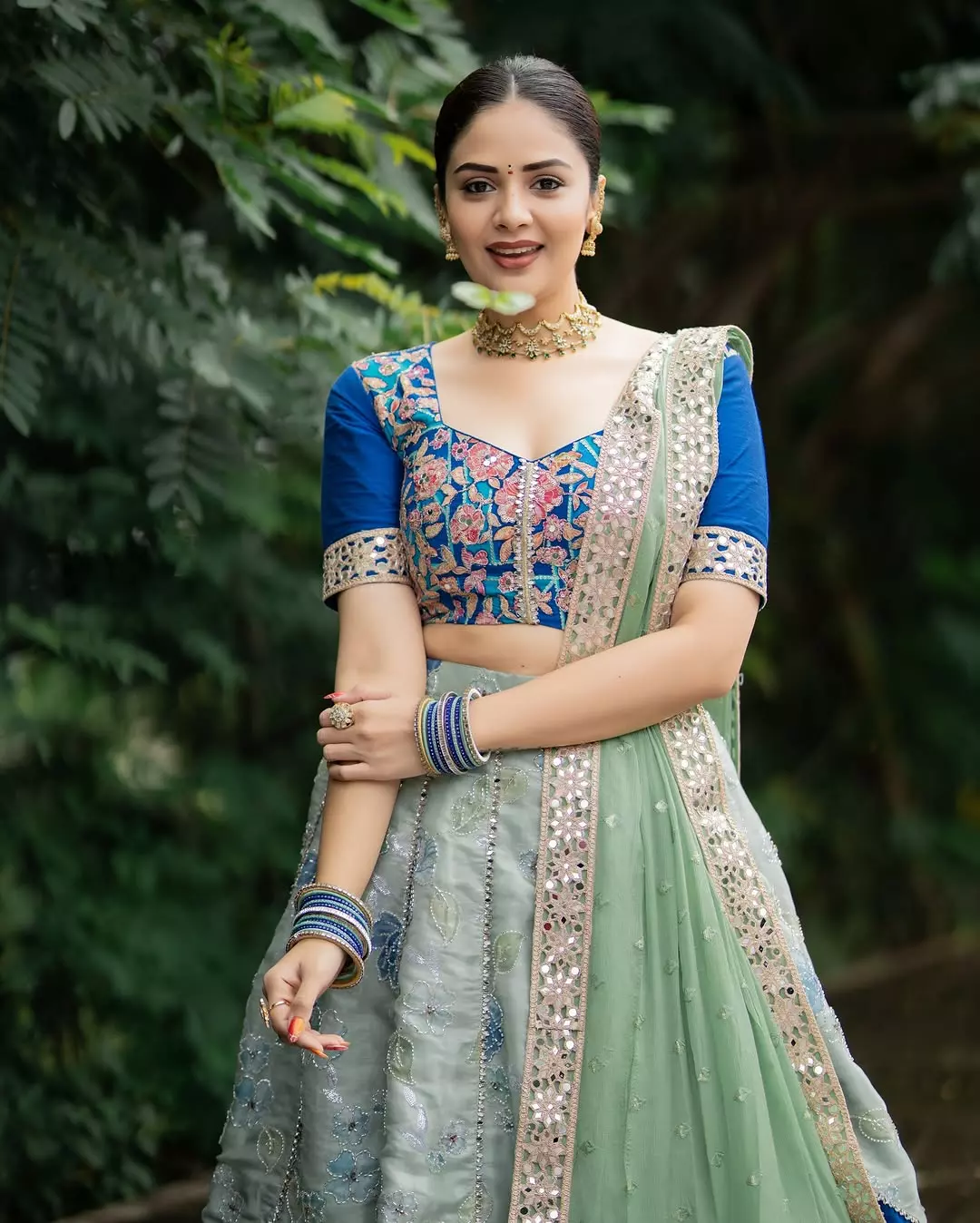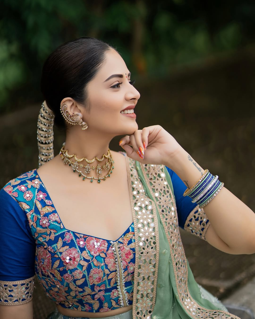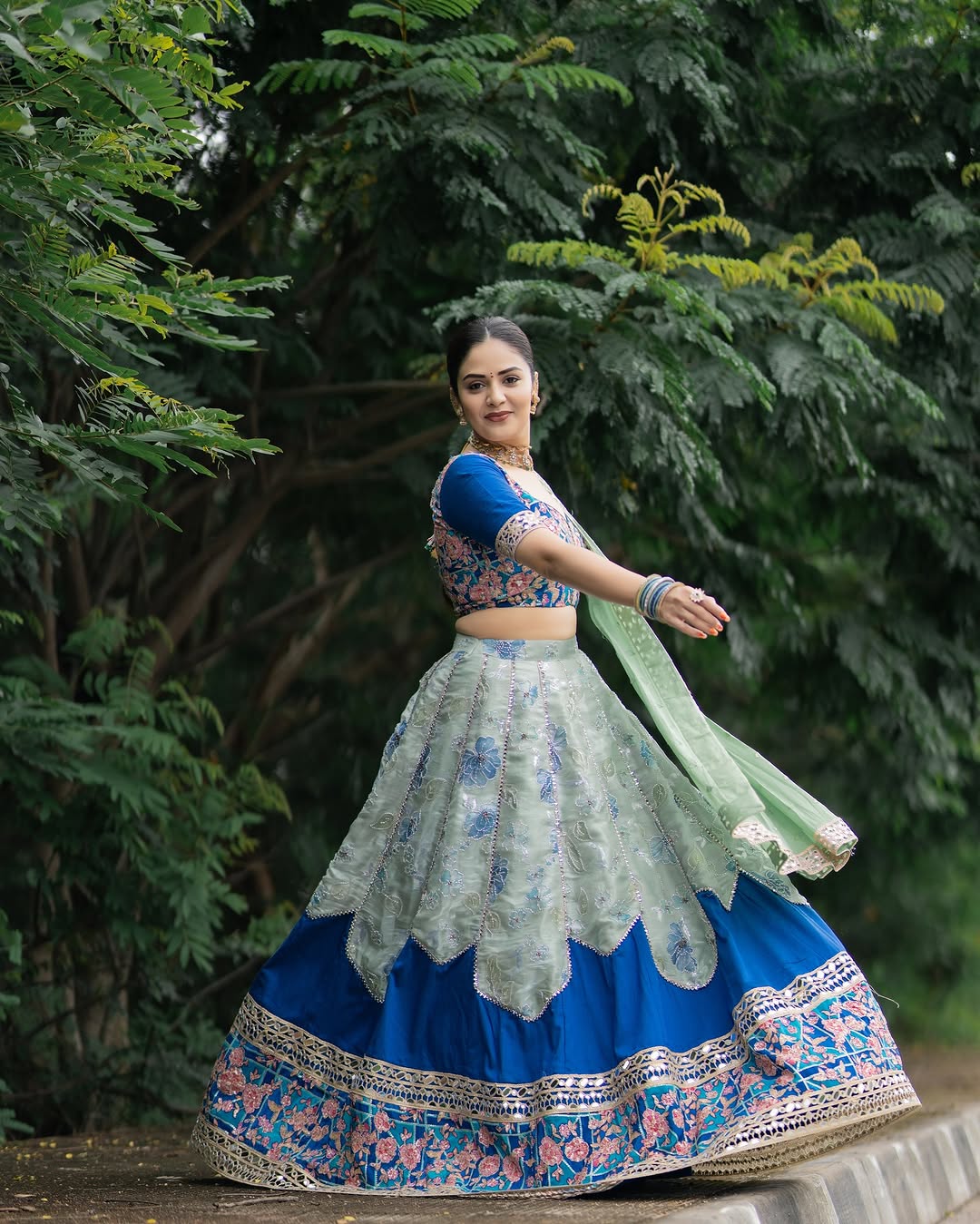 Sreemukhi proves yet again why she remains a trendsetter—effortlessly owning the traditional aesthetic while adding her signature modern flair. Truly, a vision in blue! 💙✨