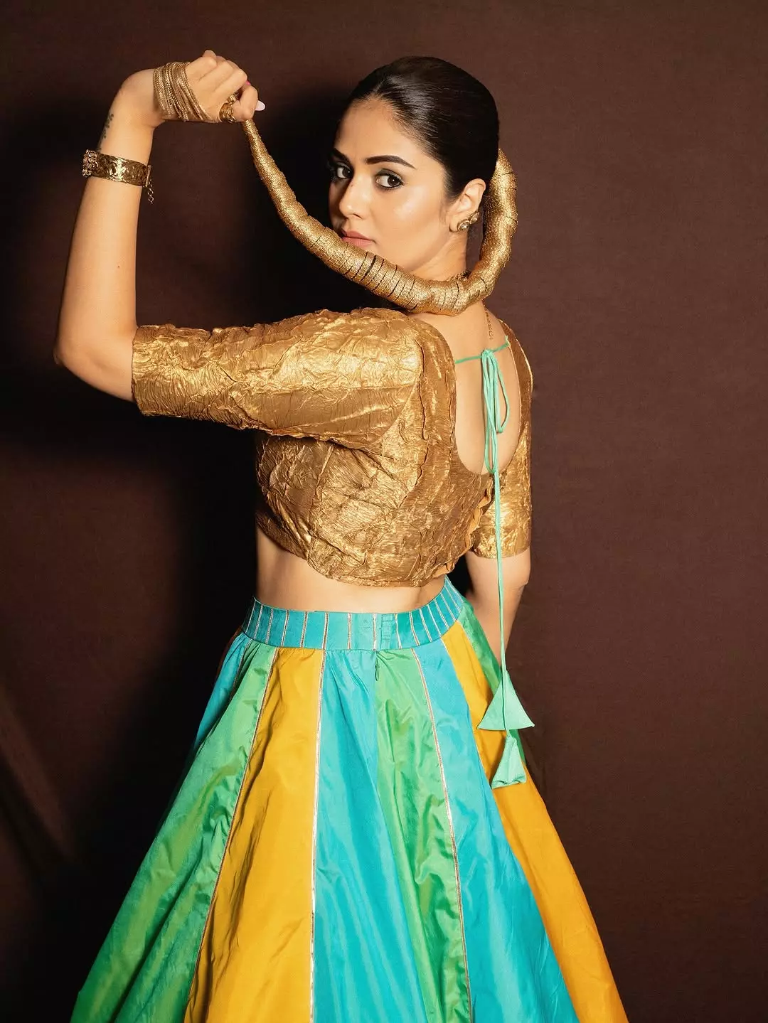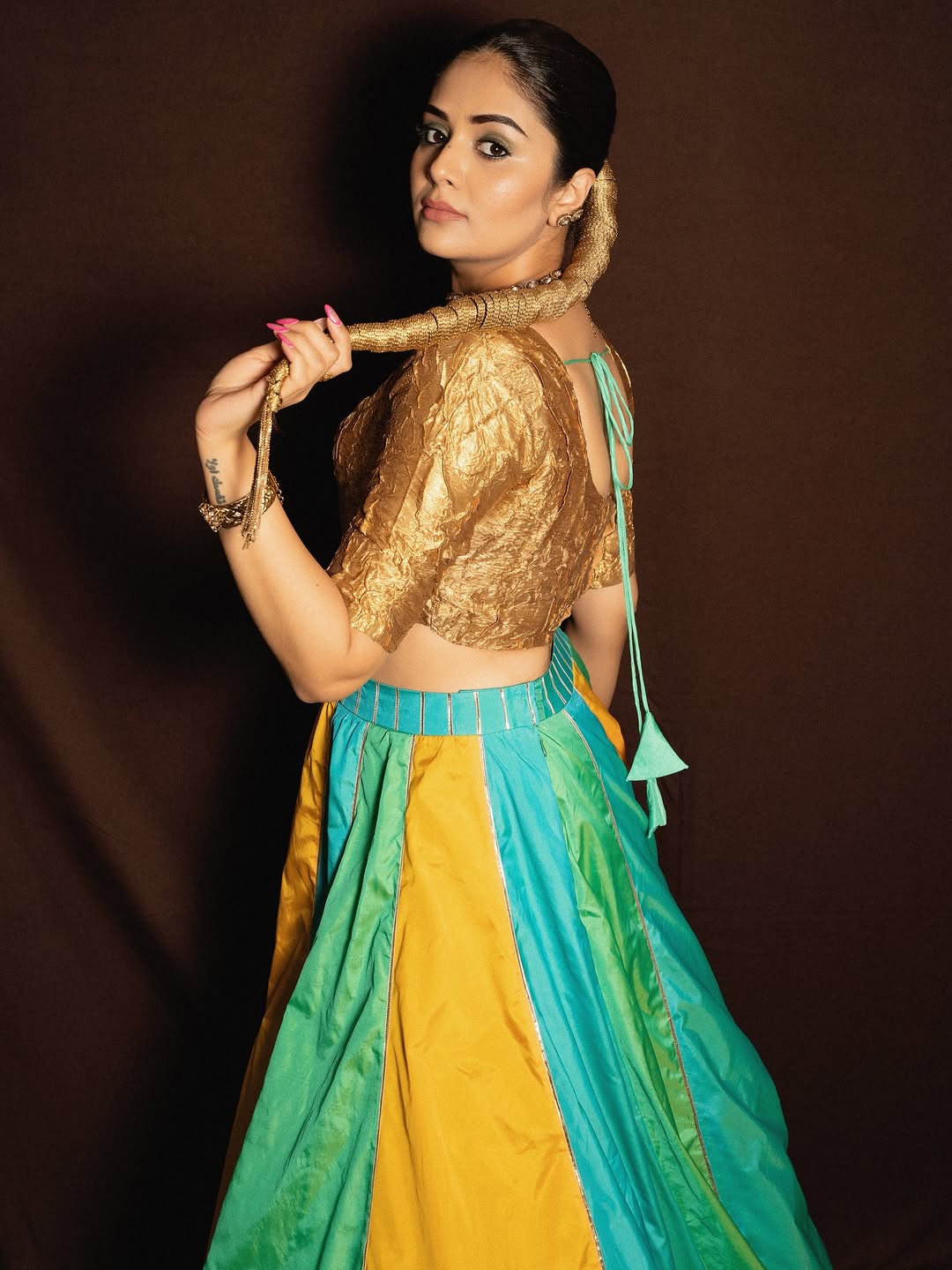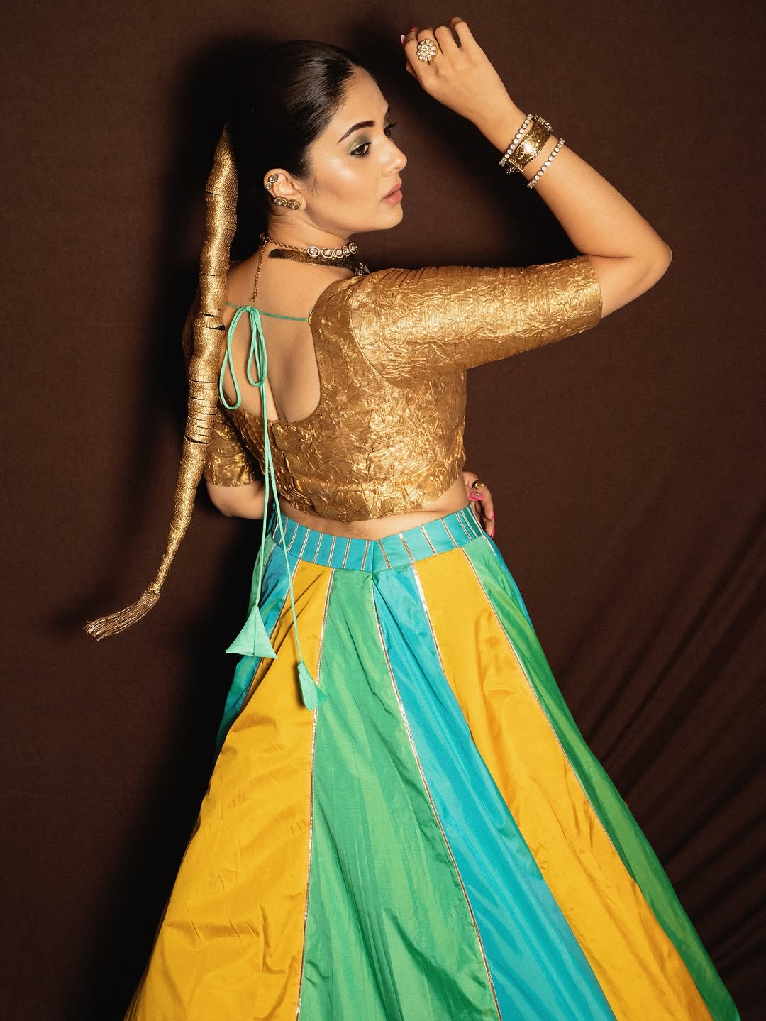 Styled to perfection by @greeshma_krishna.k, the outfit from @ashwiniscouture exudes royal sophistication. Intricate craftsmanship and a flattering silhouette make this look a standout, effortlessly highlighting Sreemukhi’s vibrant personality.