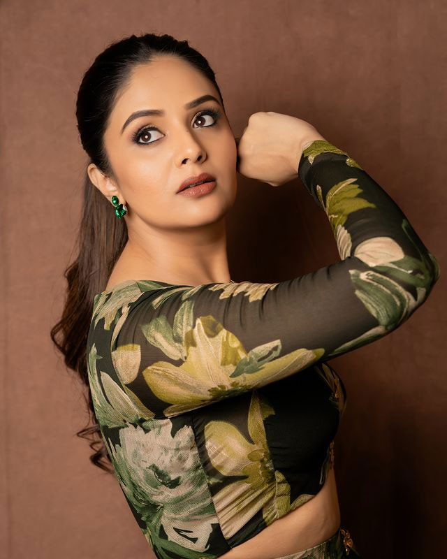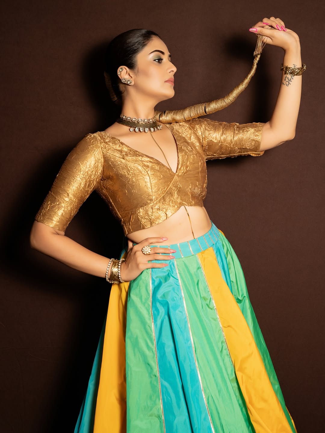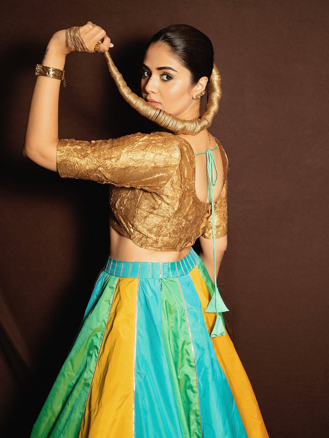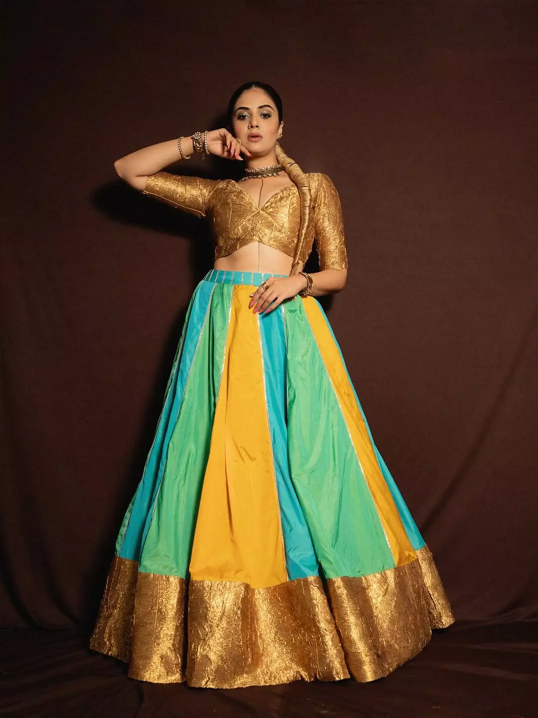 Sreemukhi shared a stunning picture on Instagram where she looked graceful in a gold, green, and blue lehenga.