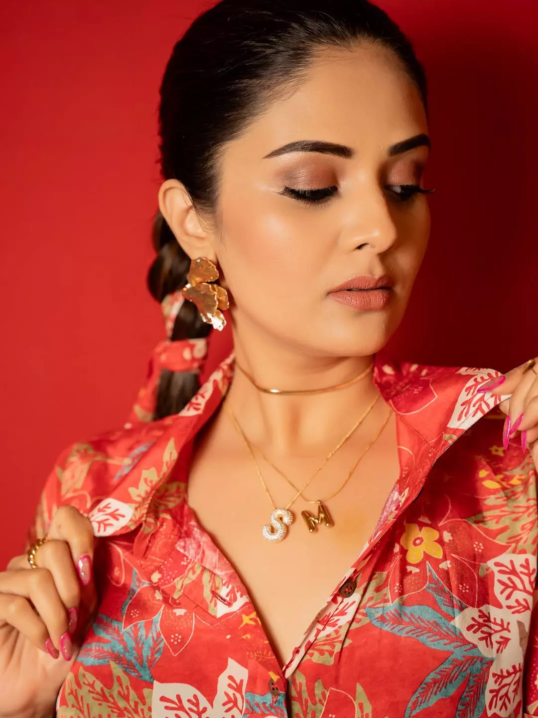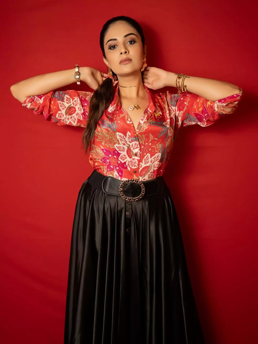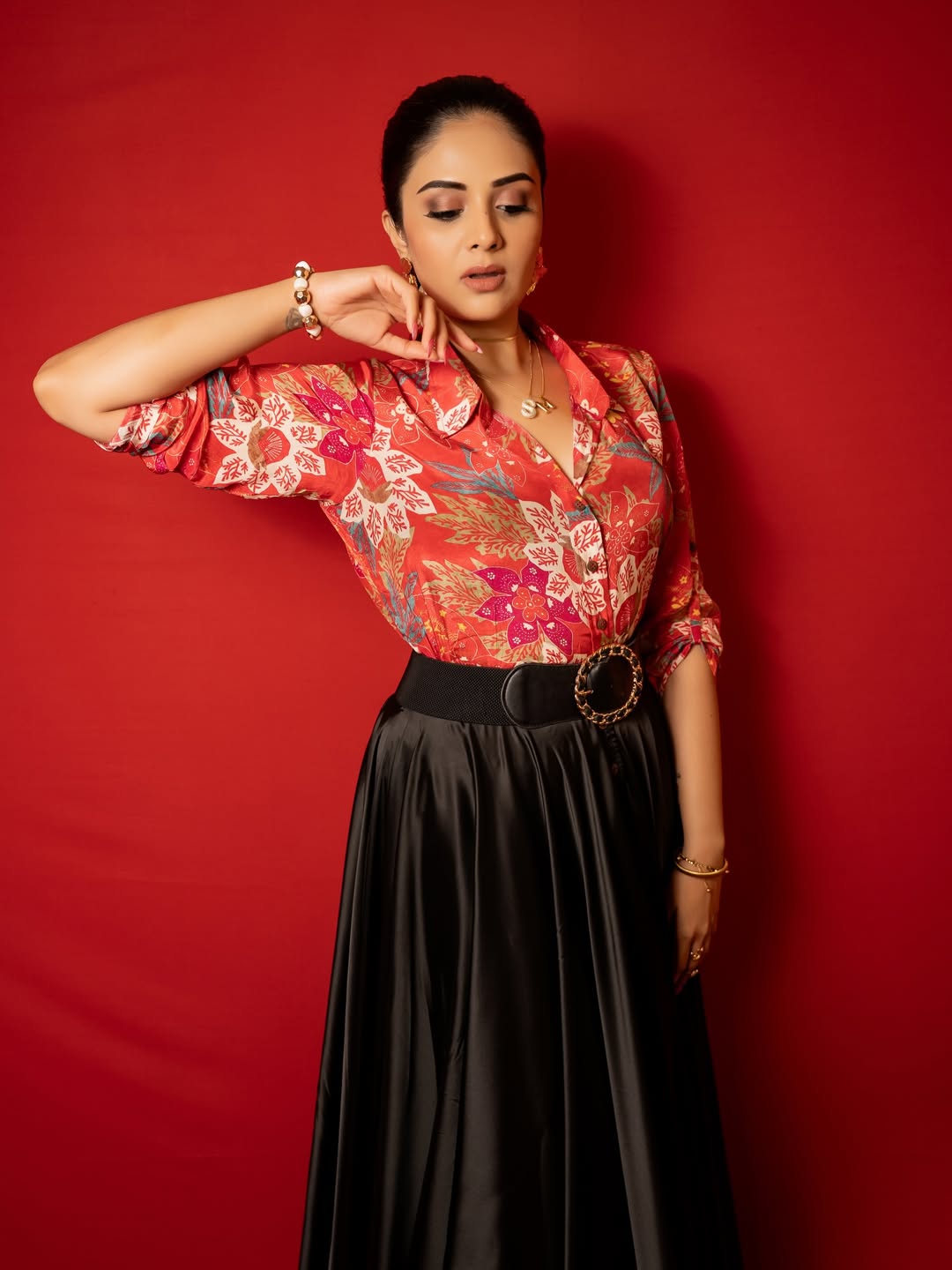 Sreemukhi detonates against fiery red, tropical floral shirt knotted high while a glossy black midi skirt cinches with a chunky gold belt.