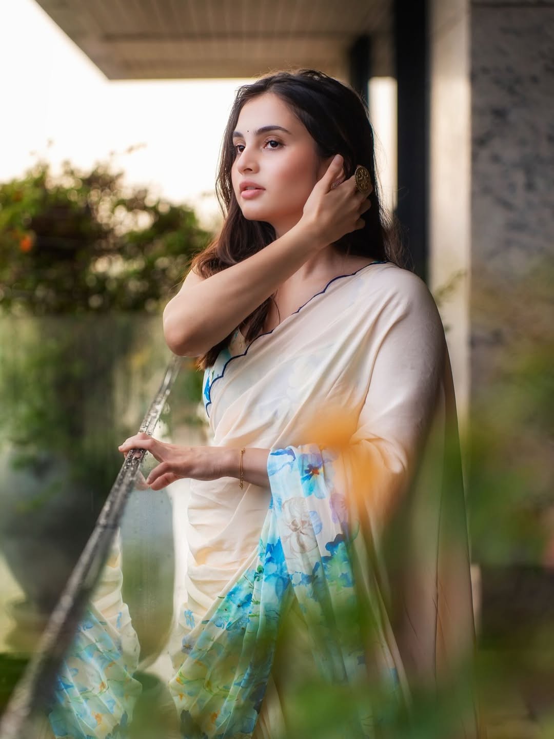 In the photo, she is seen wearing a soft white saree with a floral touch of blue by giving her an elegant and traditional look.