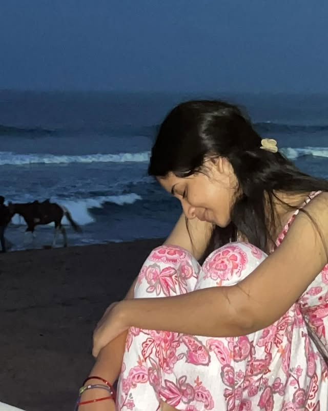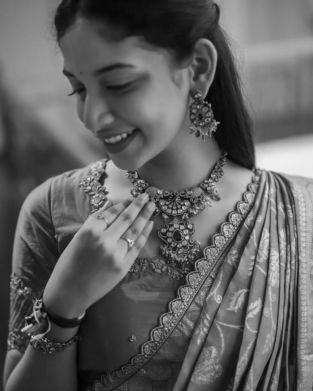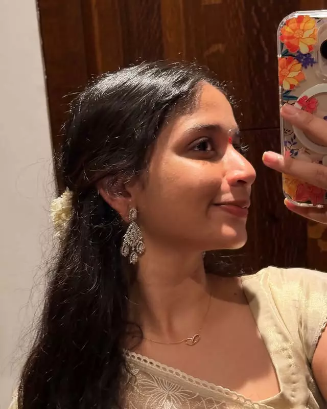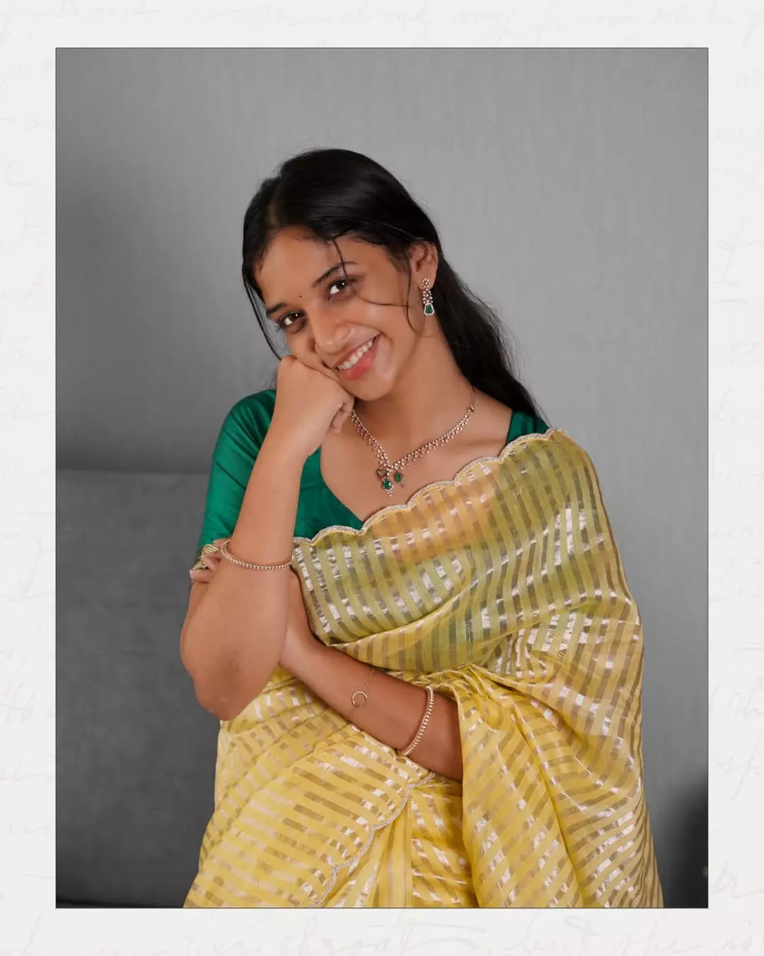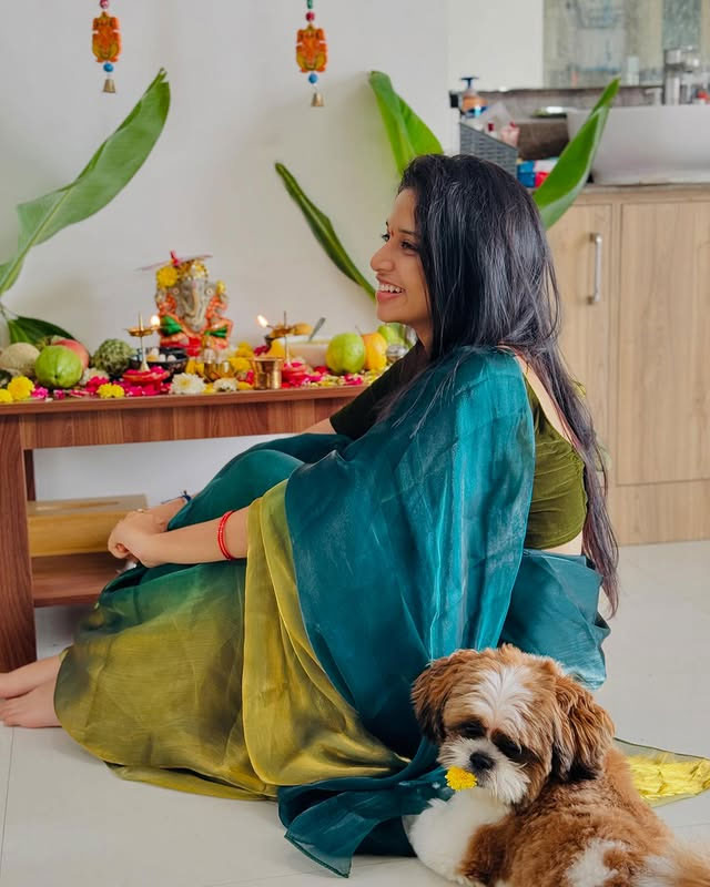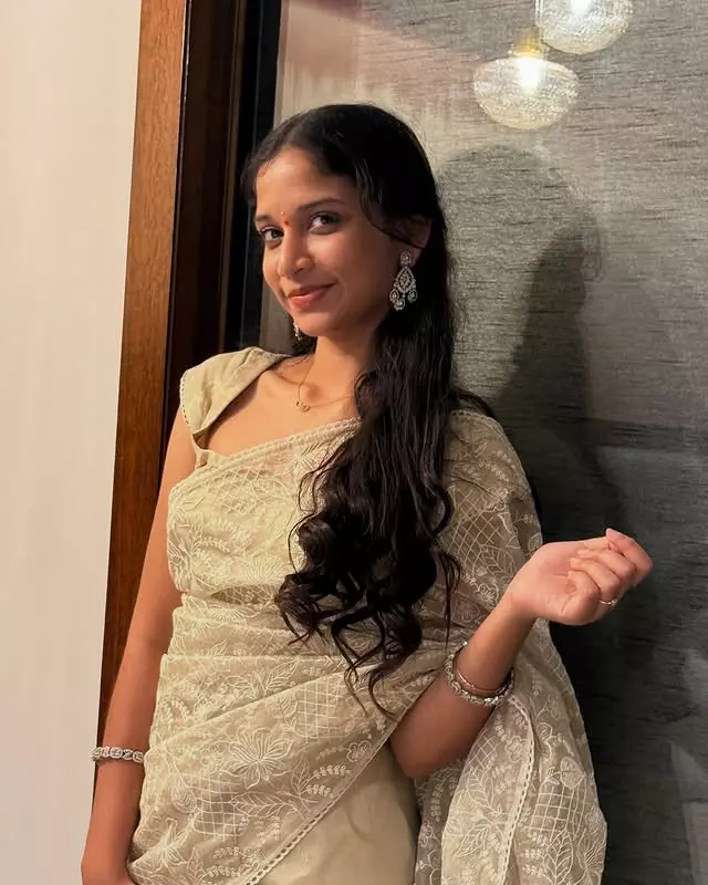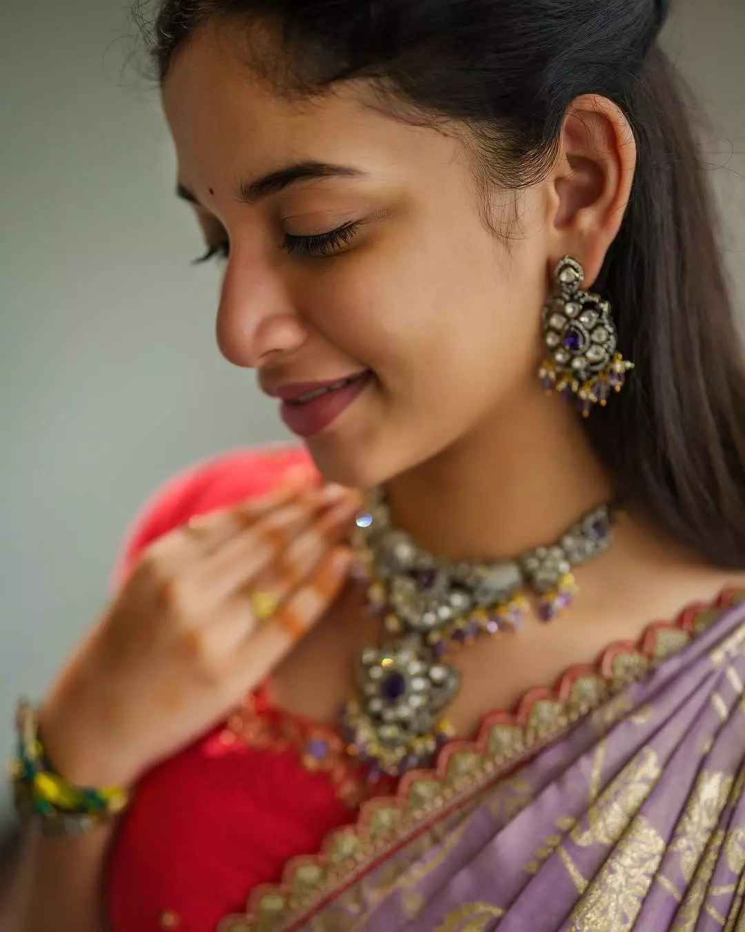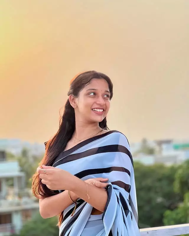 Sridevi Apella is one of the rising young actresses in the Telugu film industry. Known for her natural beauty and charming smile, she is quickly becoming a favorite among fans. In the latest Instagram picture, she looks simple yet stylish in a blue top, minimal makeup and light jewelry. Her fashion sense is youthful, classy, and relatable. The black beaded chain and sleek gold necklace add a traditional touch.