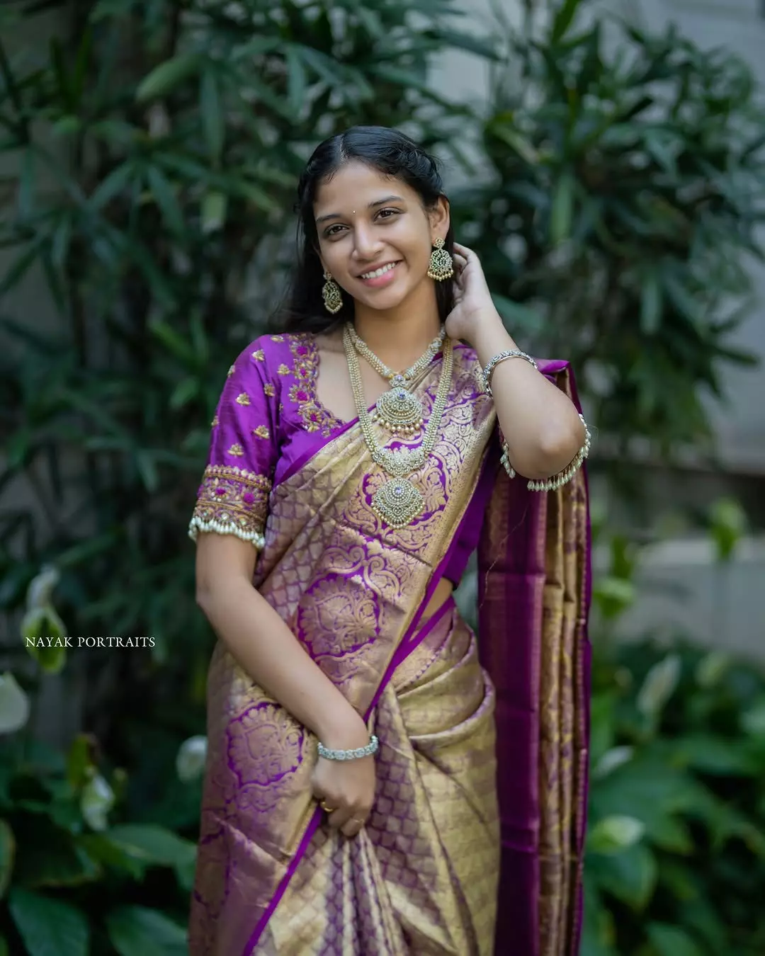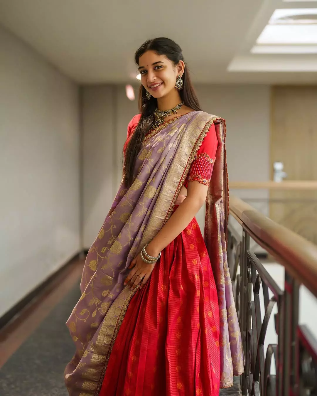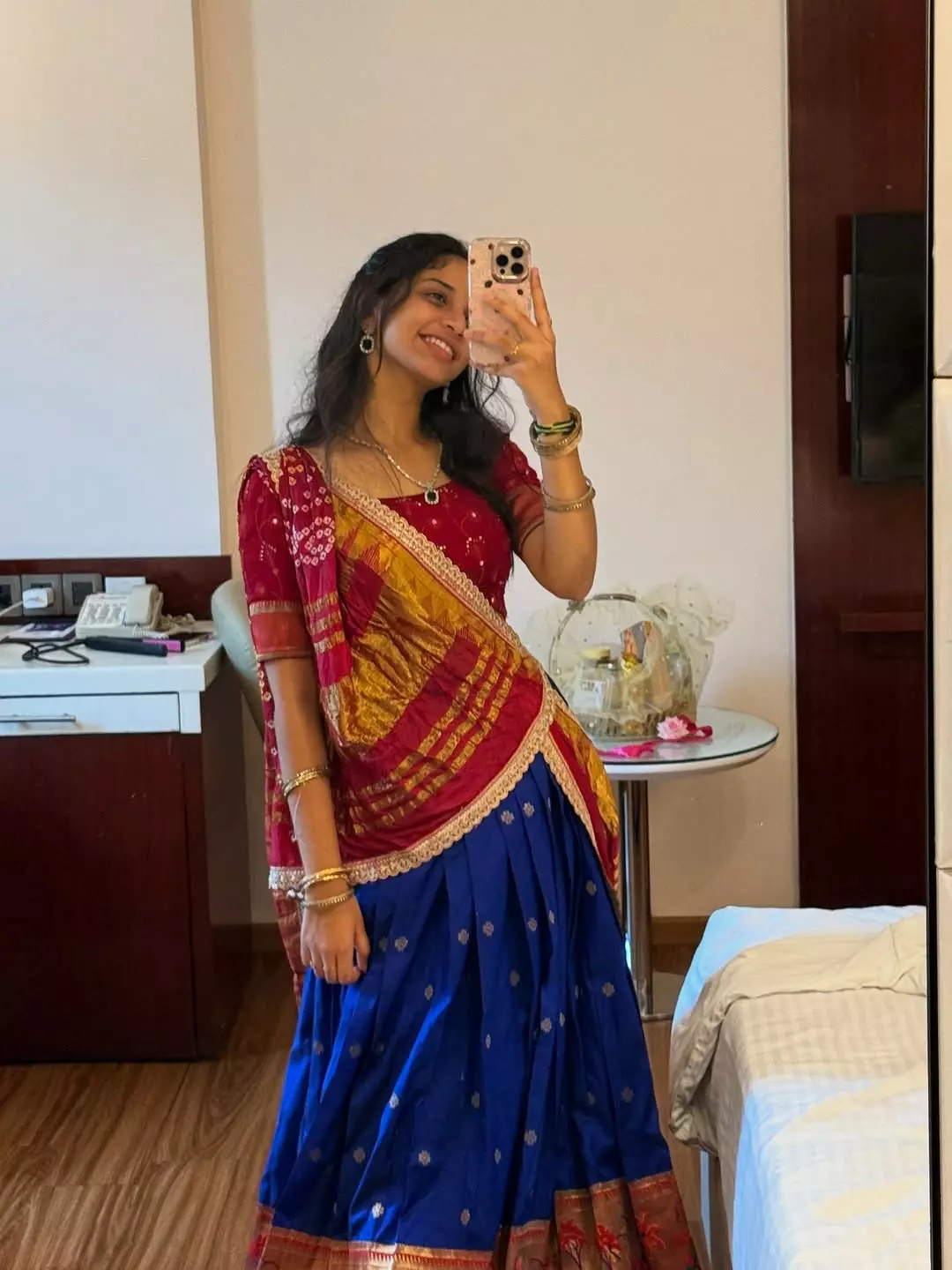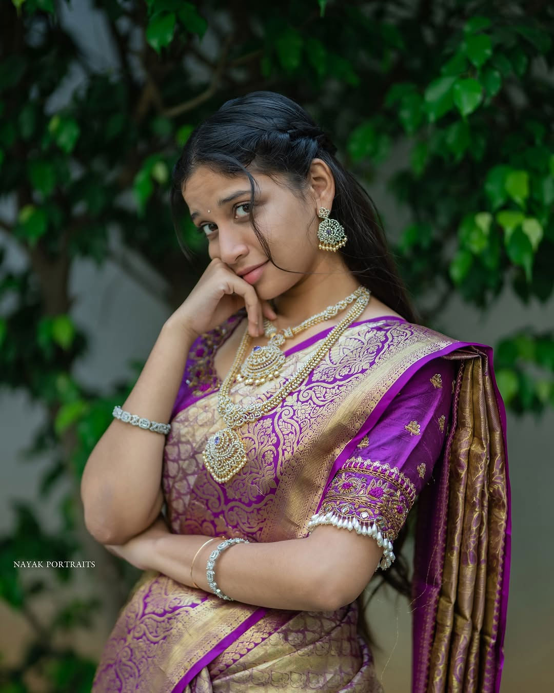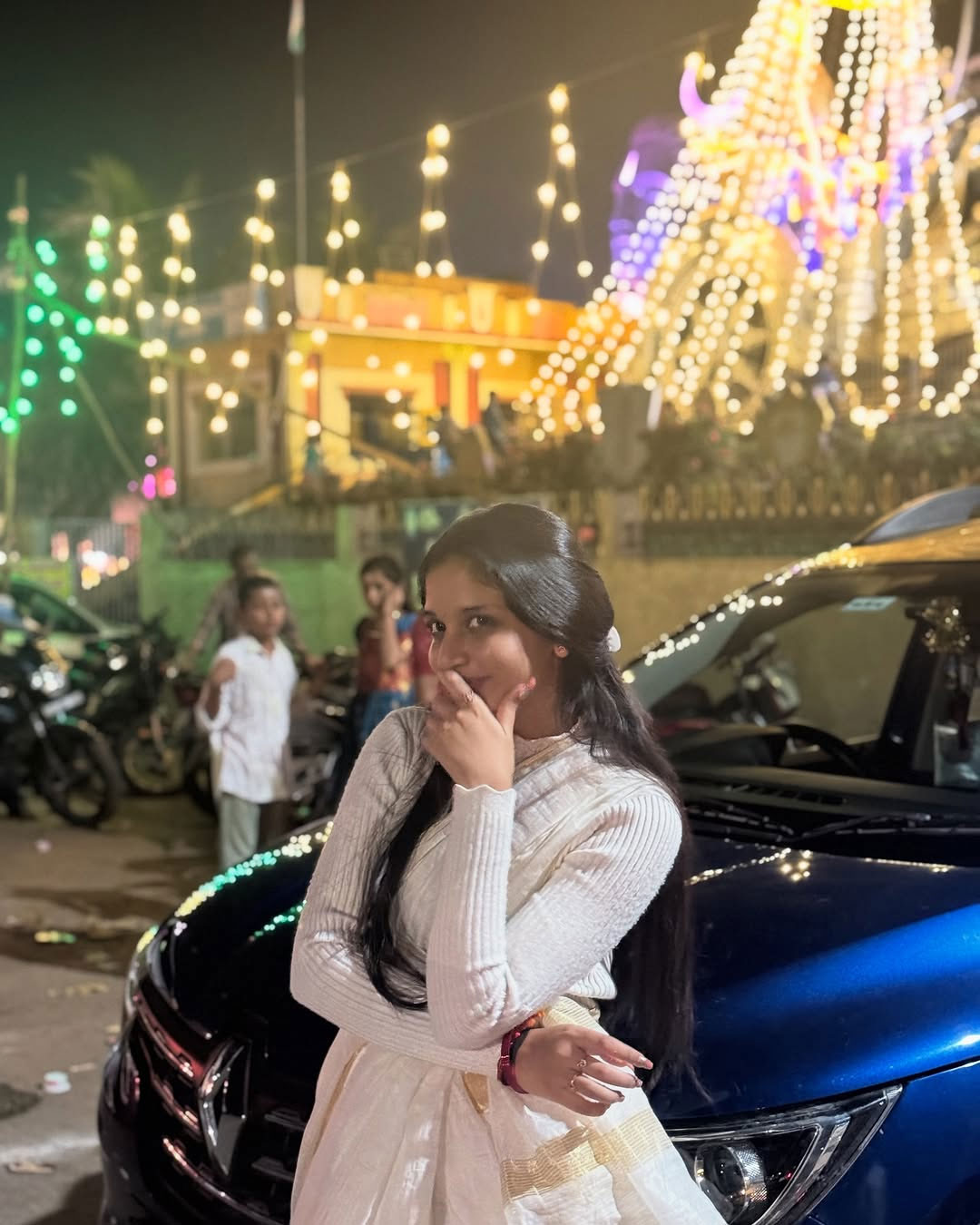 Sridevi Apella is one of the rising young actresses in the Telugu film industry. Known for her natural beauty and charming smile, she is quickly becoming a favorite among fans. In the latest Instagram picture, she looks simple yet stylish in a blue top, minimal makeup and light jewelry. Her fashion sense is youthful, classy, and relatable. The black beaded chain and sleek gold necklace add a traditional touch.