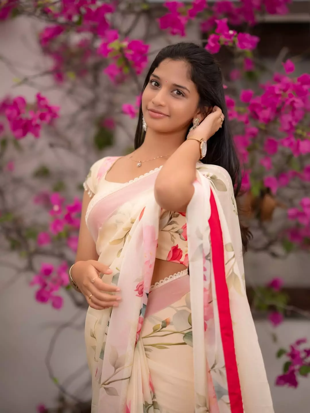 Sridevi continues to captivate hearts with her timeless charm and graceful presence. In this latest gallery, she effortlessly blends tradition with modern sophistication, showcasing her impeccable style and natural elegance. Draped in a delicate floral saree, Sridevi exudes a soft, radiant aura that is both enchanting and serene. The pastel hues of her outfit complement her poise, creating a perfect harmony between the attire and her personality.