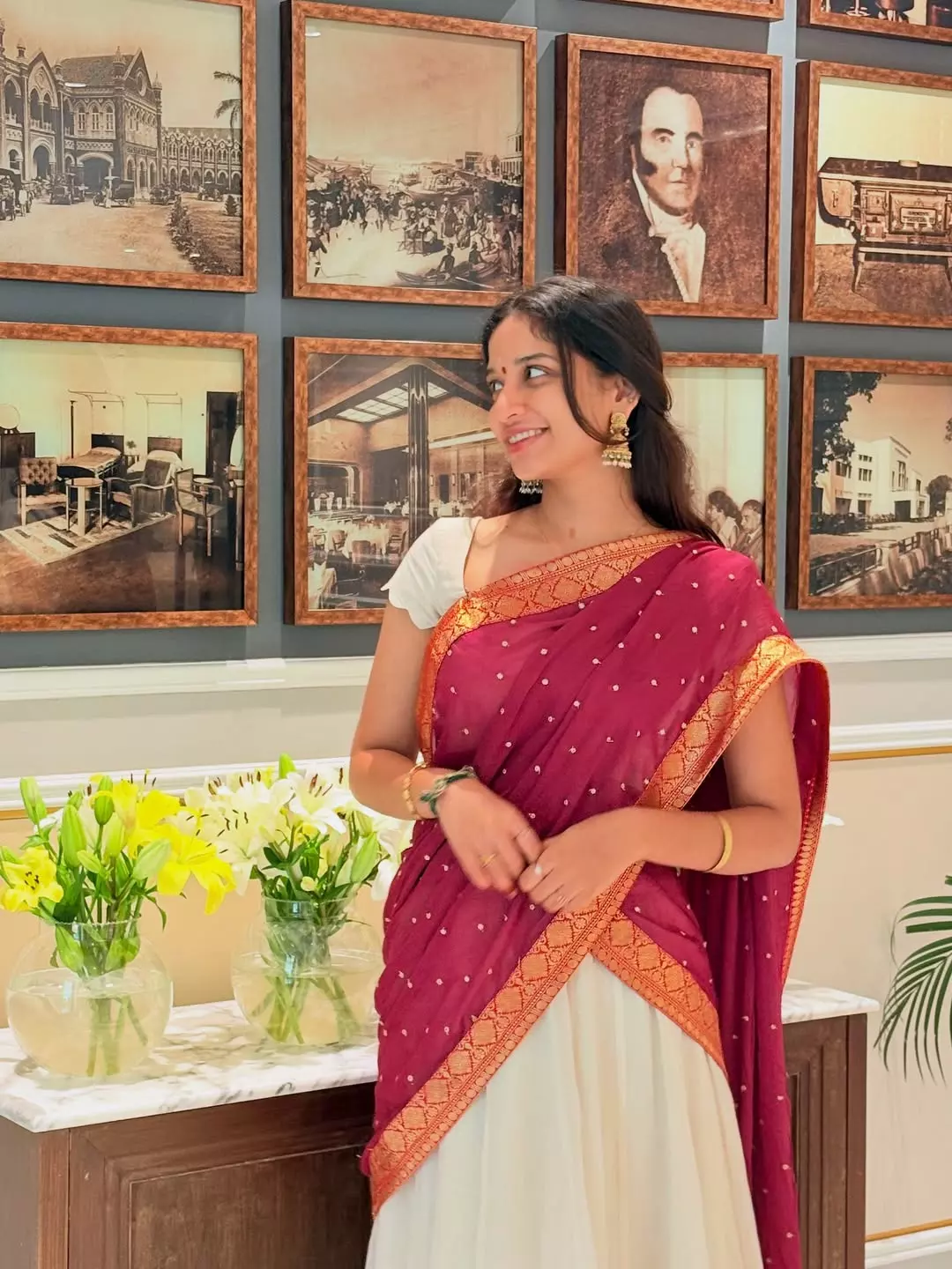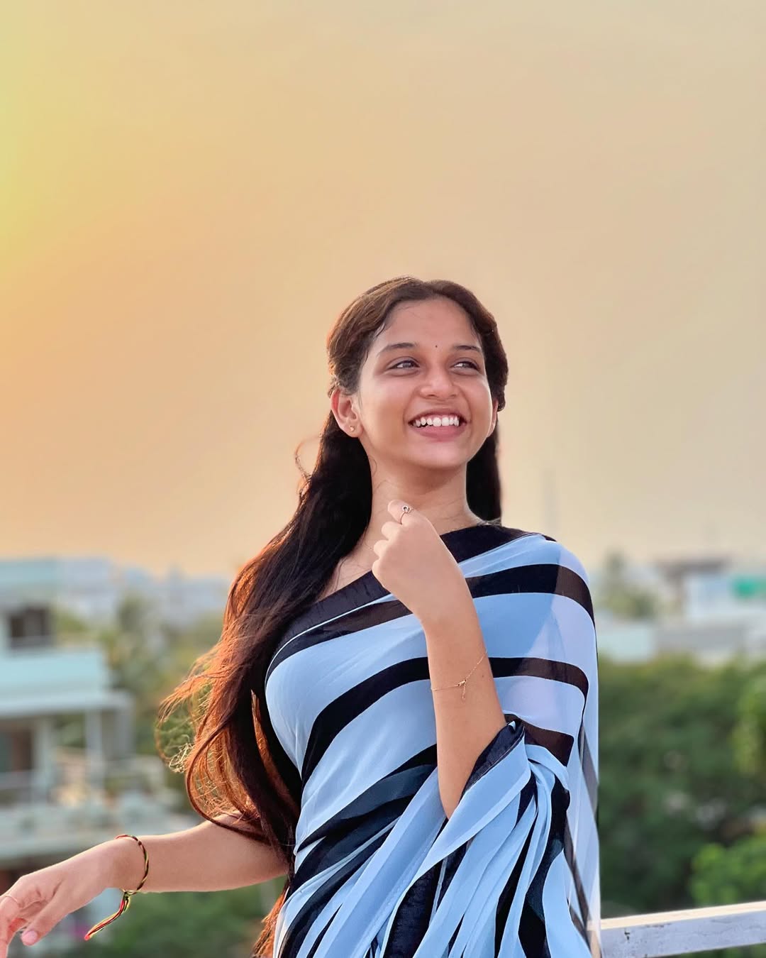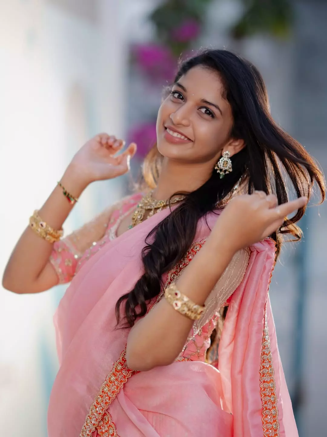 Her styling in this shoot, curated by @sravani.mandali, highlights understated elegance, while the expert photography of @shutterromance_ captures her expressions and delicate gestures with finesse. The outfit, sourced from @thaara_silks, is a testament to classic Indian craftsmanship, further enhanced by subtle makeup from @makeup_by_krishna_kasara and beautifully done hair by @ayyappa_8885.