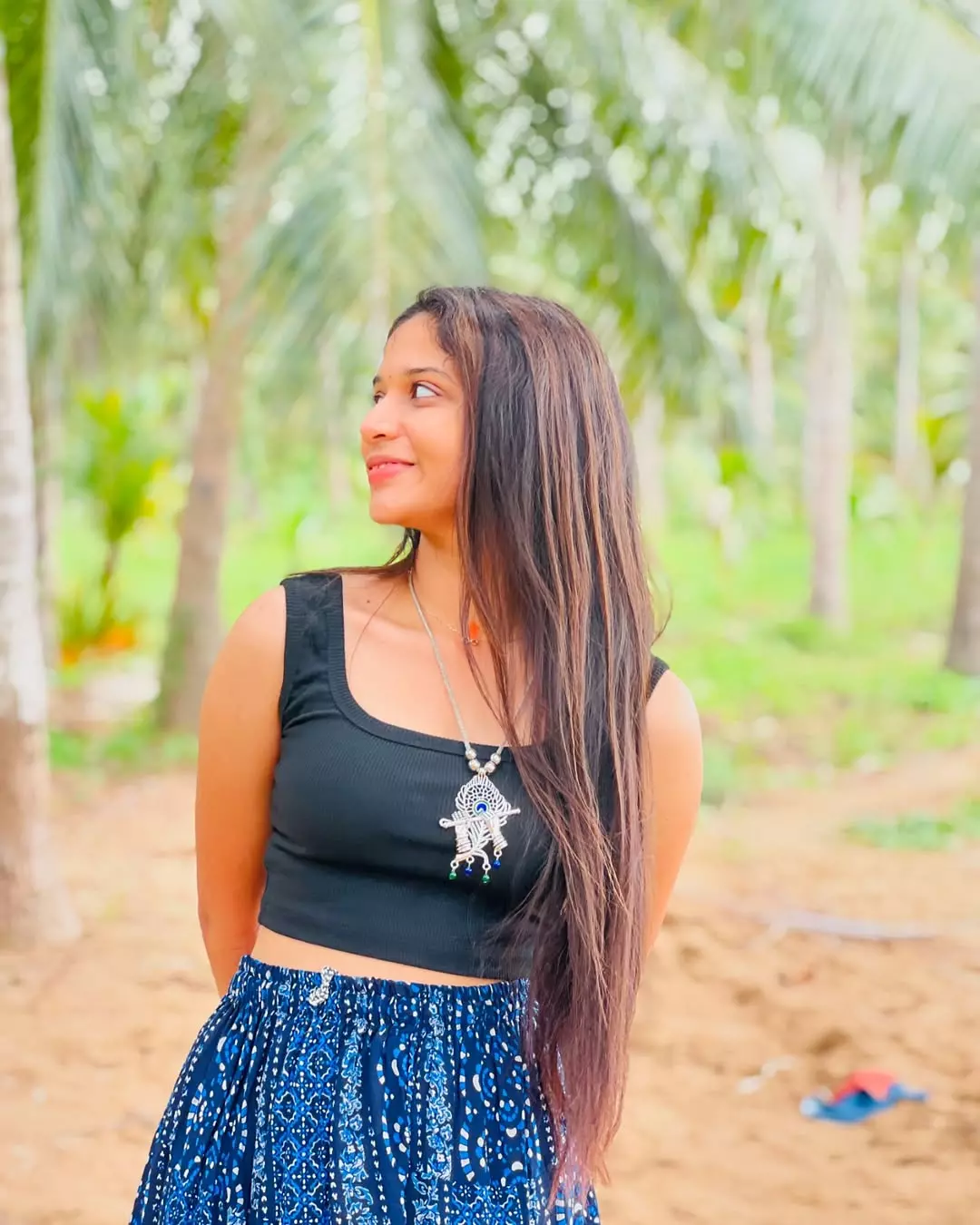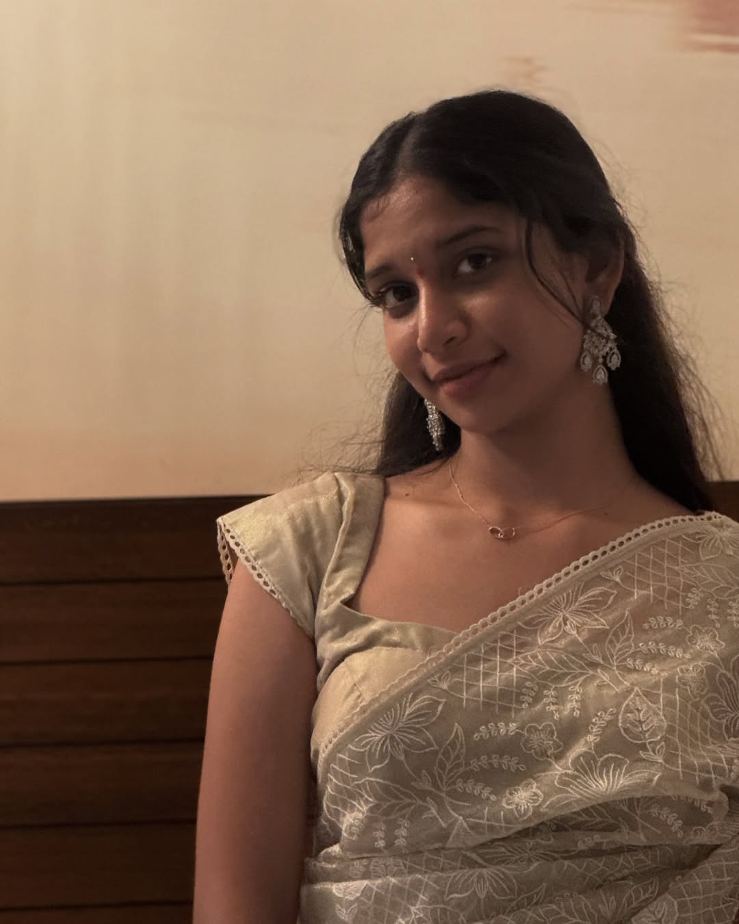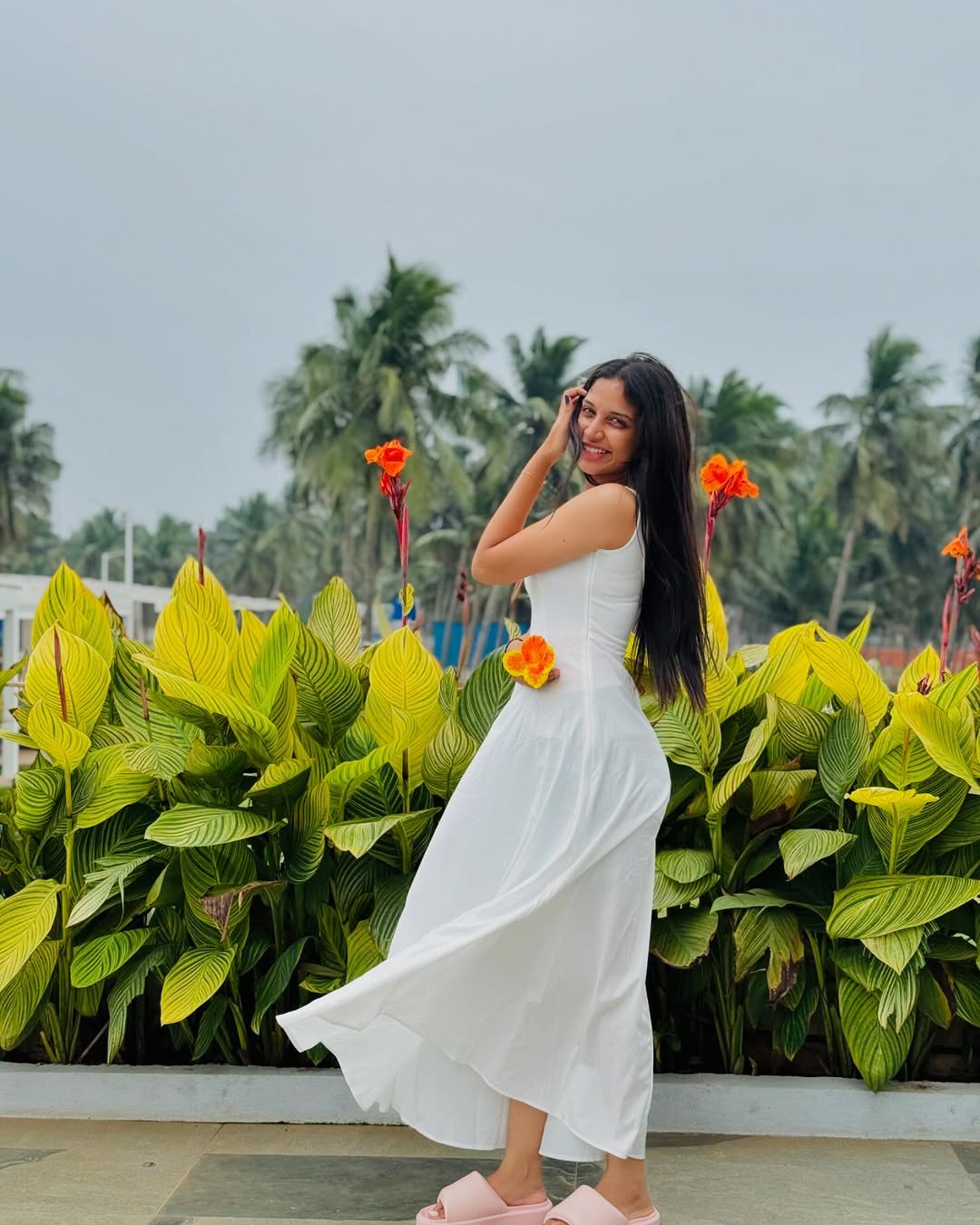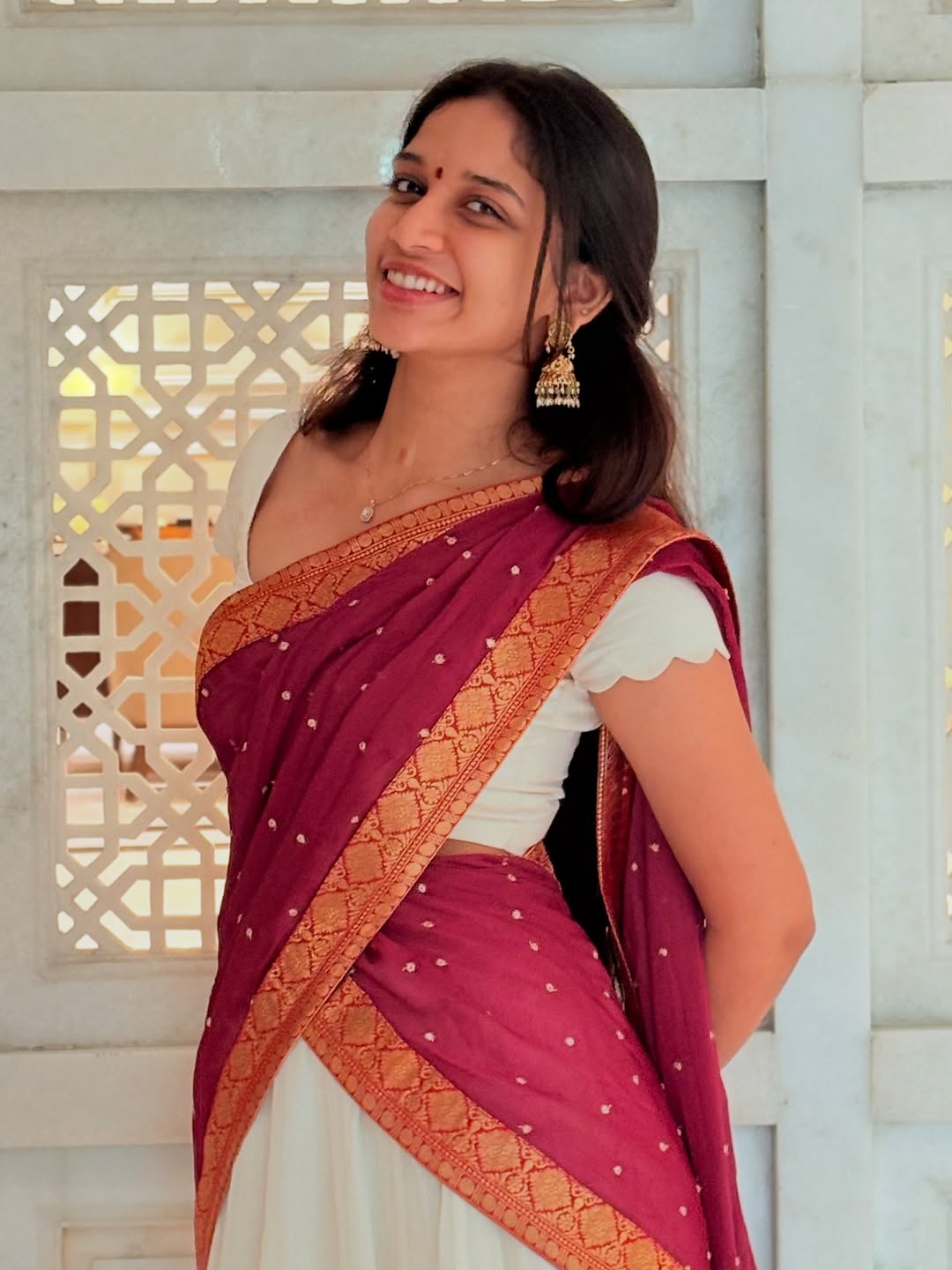 Her styling in this shoot, curated by @sravani.mandali, highlights understated elegance, while the expert photography of @shutterromance_ captures her expressions and delicate gestures with finesse. The outfit, sourced from @thaara_silks, is a testament to classic Indian craftsmanship, further enhanced by subtle makeup from @makeup_by_krishna_kasara and beautifully done hair by @ayyappa_8885.