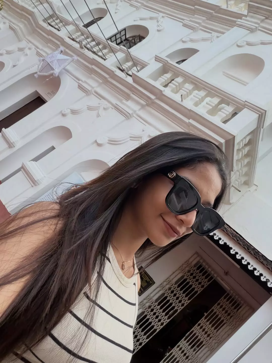 Telugu actress Sridevi (known for her breakout role in Court) wraps up the year with a delightful Goa getaway, captured in this vibrant photo. Smiling brightly in front of a colorful Portuguese-style building with a striking blue door, yellow walls, tiled steps, and lush potted plants, she wears a chic olive green long-sleeve top tucked into a checkered mini skirt, accessorized with a crossbody bag and sunglasses – casual yet stylish perfection amid Goa's iconic charm.