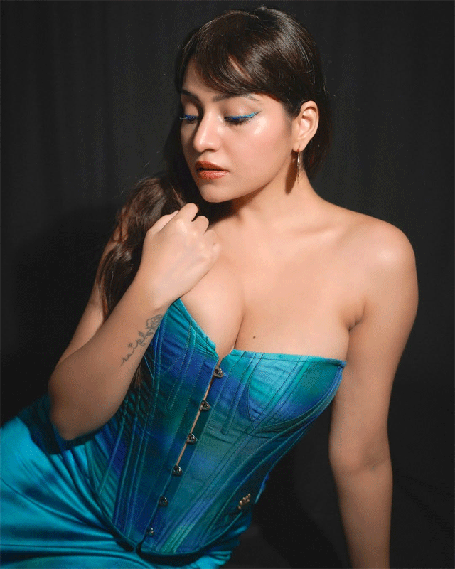 Designed by @sherinakapany, the outfit perfectly accentuates her graceful figure and confident allure against a minimalist grey backdrop.