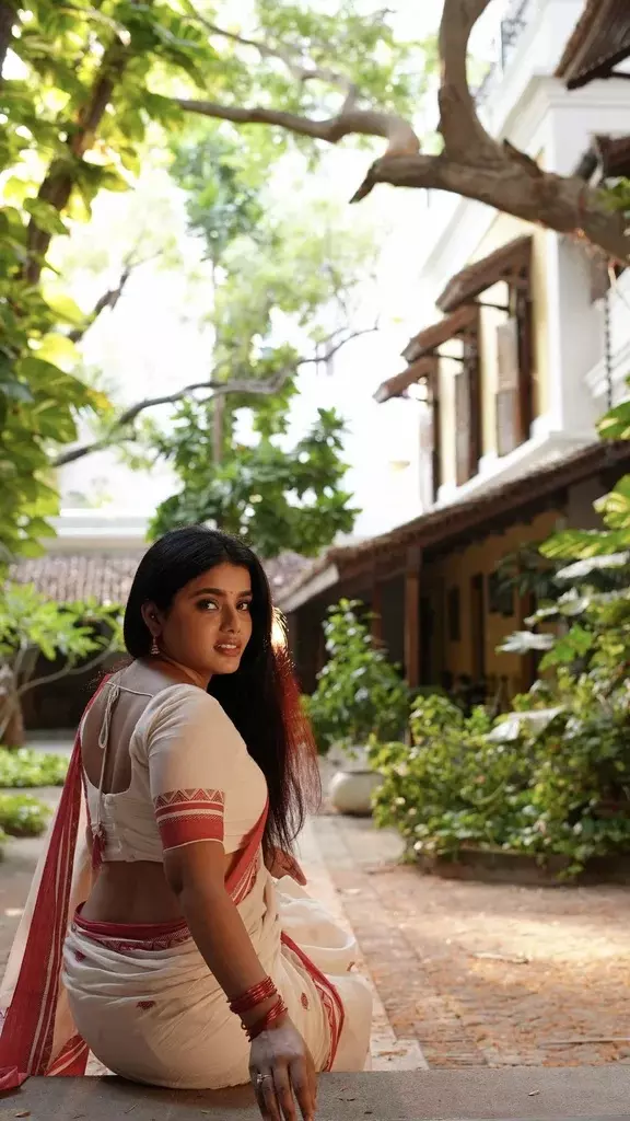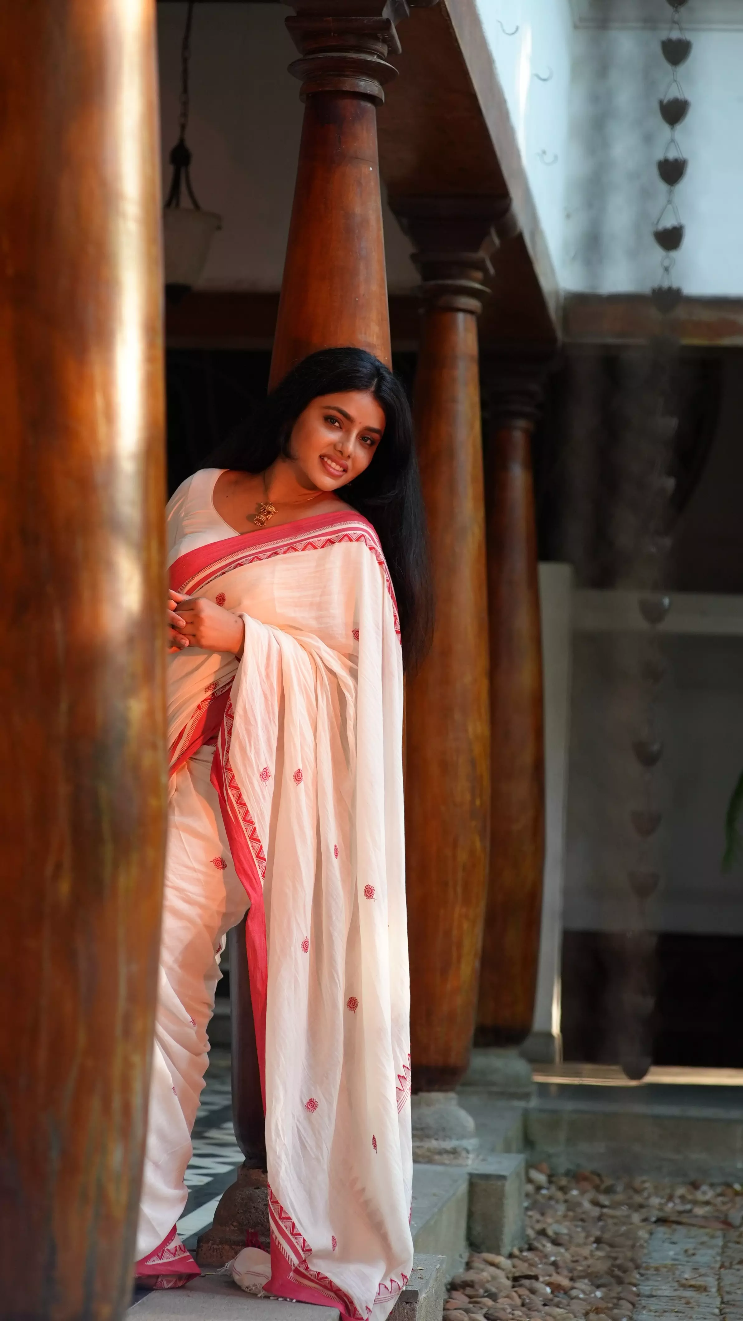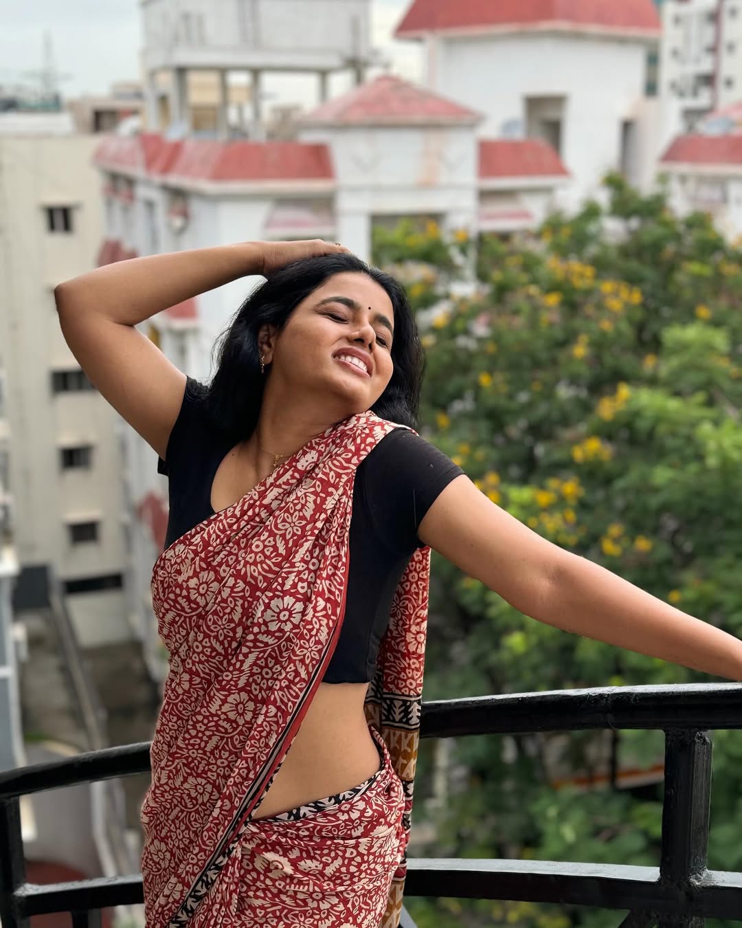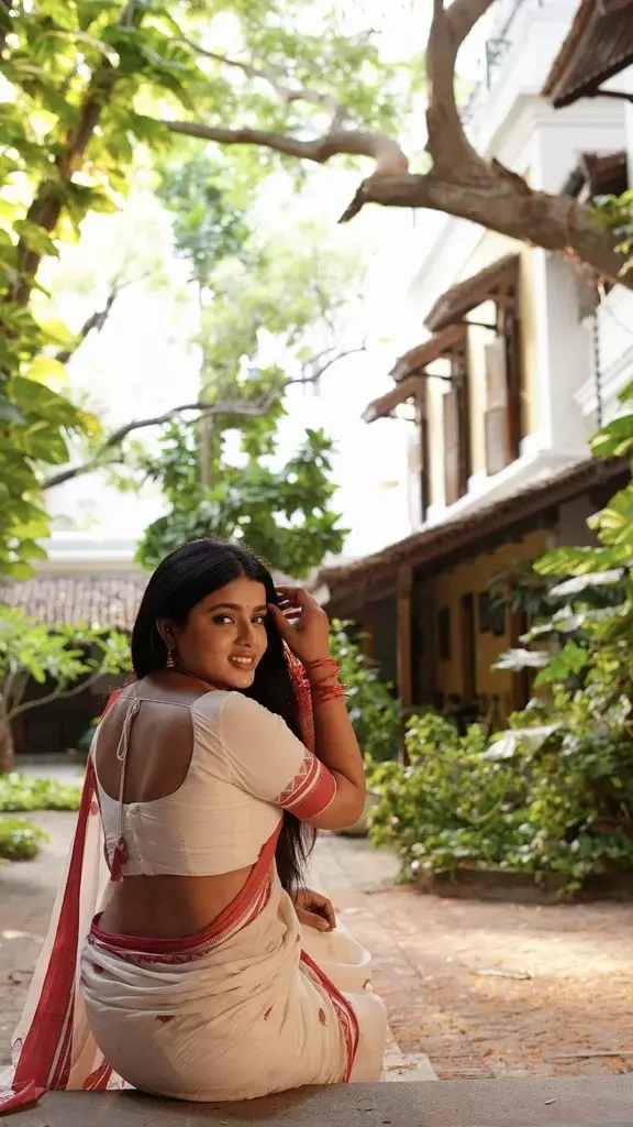 Sumaya Reddy, the talented and multifaceted Telugu actress from Anantapur, continues to impress with her elegant presence. In this serene outdoor photograph, she looks radiant in a traditional white and red saree with a stylish backless blouse, posing gracefully amid lush greenery. Her warm smile and confident poise reflect her strong on-screen persona.