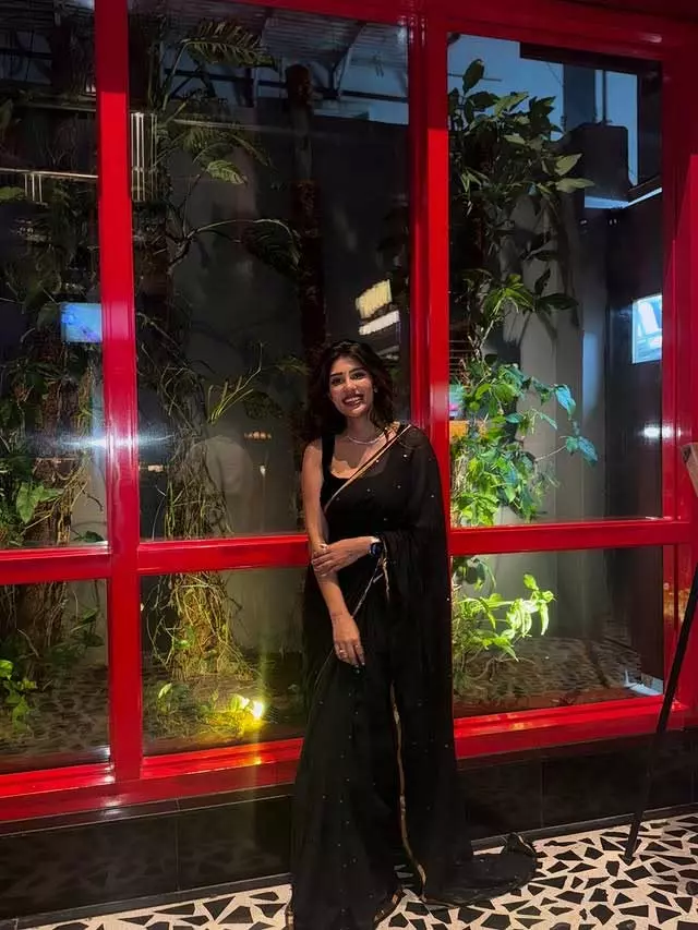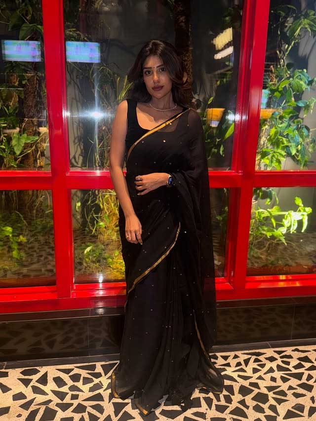 By: Tupaki Desk | 3 Jun 2025 12:50 PM ISTSupritha who is steadily building her presence in Tollywood, recently posted a new picture on Instagram that has grabbed the attention of her followers. In the photo, she is seen wearing a classic black saree with a gold border standing indoors beside a bright red window frame with greenery in the background. Her caption for the post was just: “🖤✨”