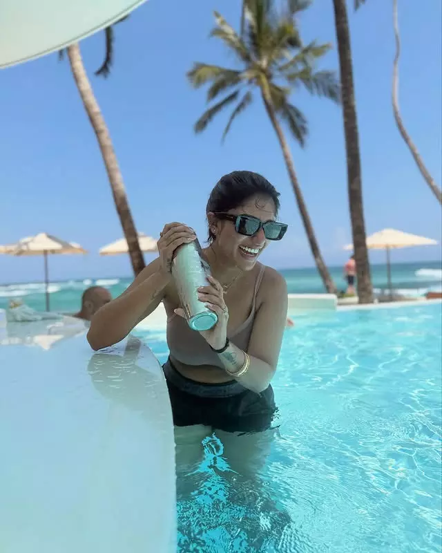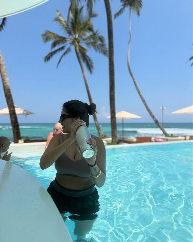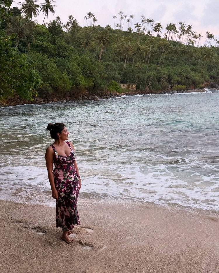 The background shows the calm sea, soft sand and lush green trees. Supritha is smiling brightly and her simple look is very refreshing. Her caption was just a pink heart emoji, showing her love for the peaceful moment.