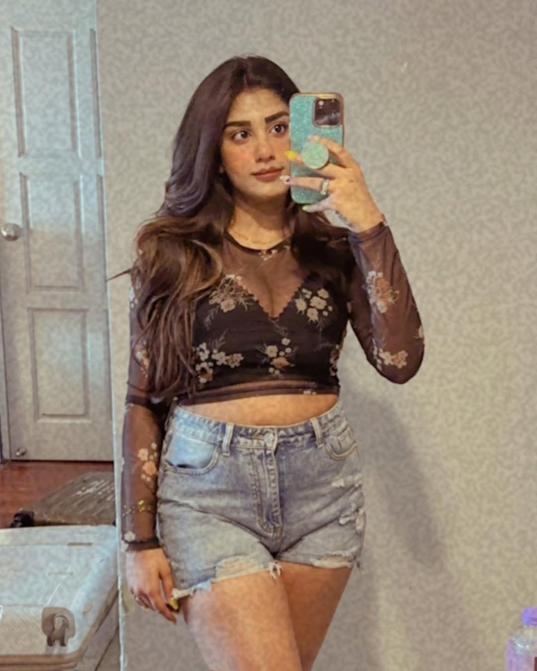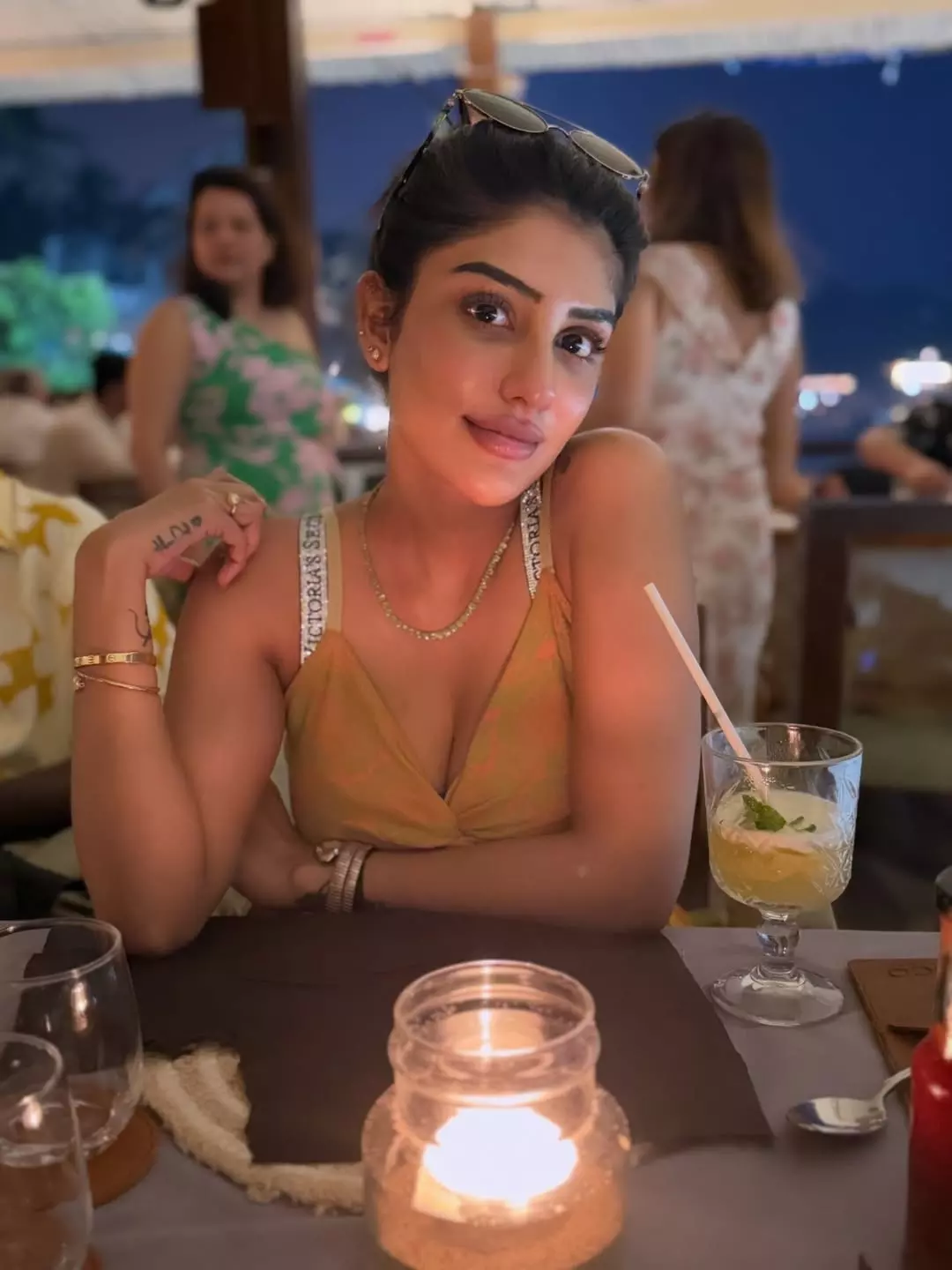 In this charming photo, rising Telugu actress Bandaru Sheshayani Supritha (Supritha Naidu) exudes effortless grace and warmth. Seated at a cozy café with a vibrant artistic backdrop, she flashes a joyful smile while looking away, her long dark hair cascading beautifully. Dressed in a flattering blue floral deep-V top paired with delicate layered necklaces and stacked bracelets, Supritha perfectly blends casual elegance with natural charisma.
