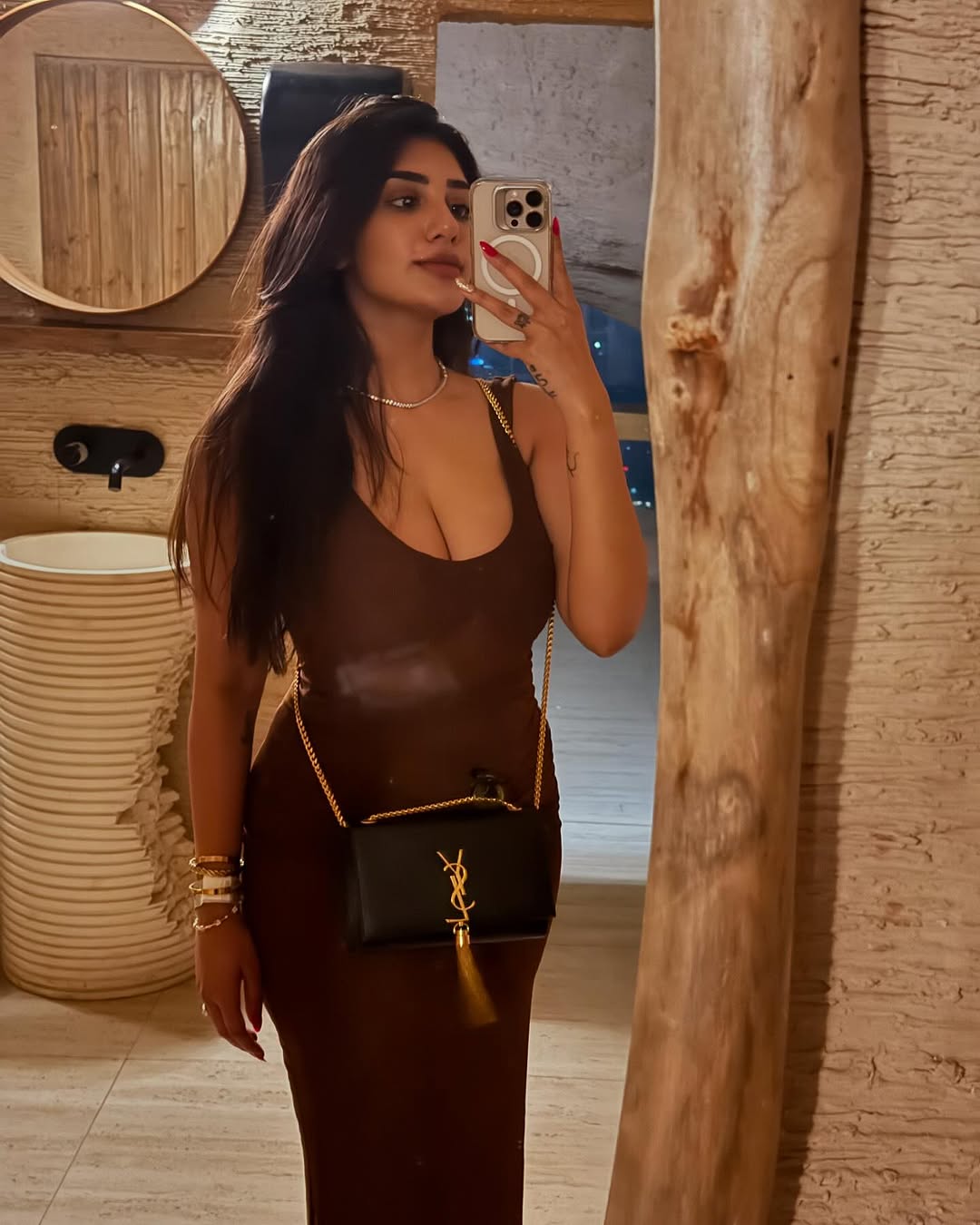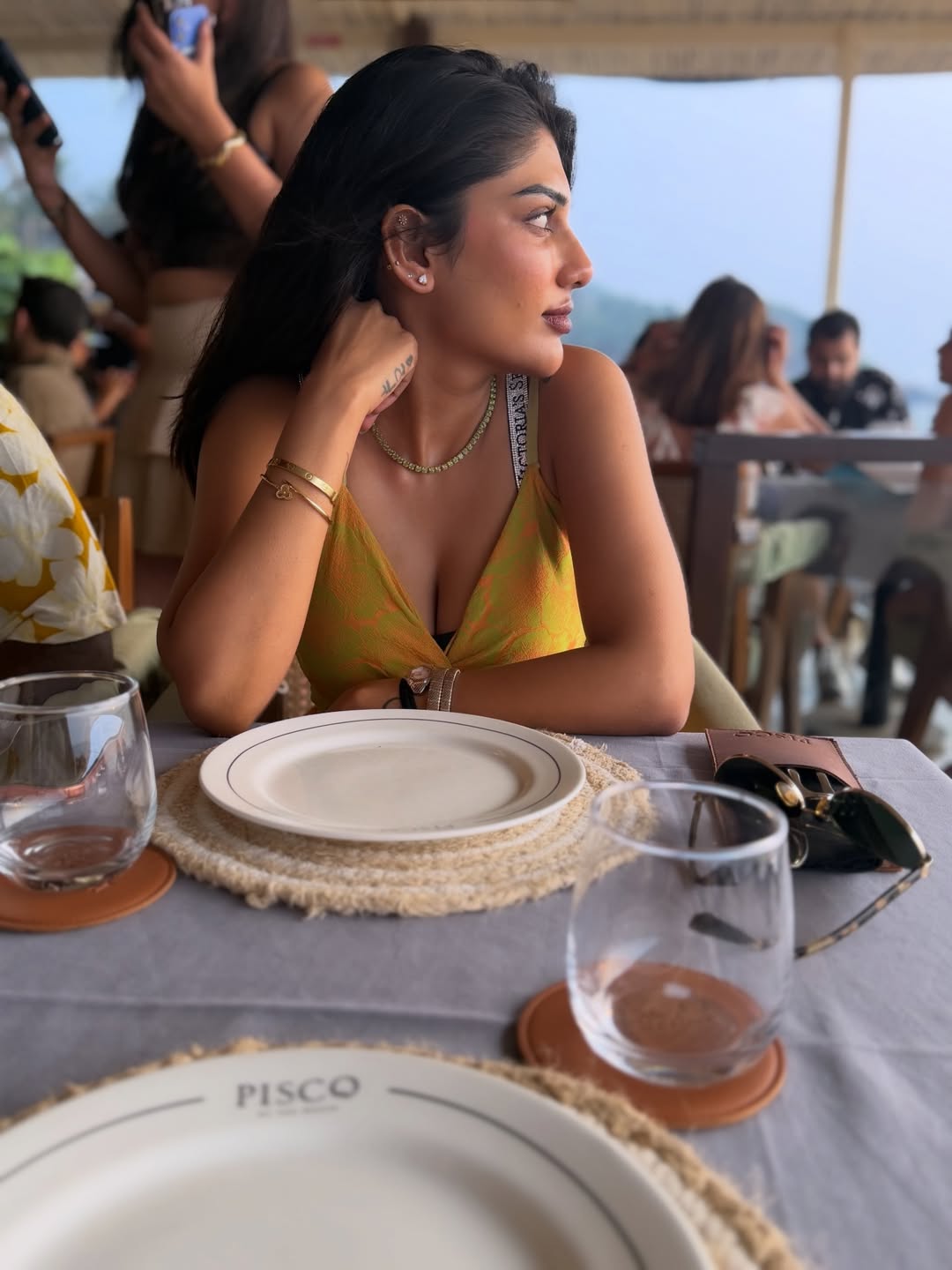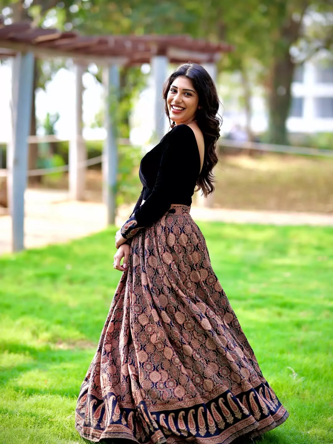 Bandaru Sheshayani Supritha, popularly known as Supritha Naidu, radiates charm and confidence in this elegant black velvet crop top paired with a vibrant patterned lehenga. Her warm smile, wavy tresses, and traditional gold jewellery with a red bindi create a perfect blend of modern grace and ethnic beauty. Outfit: @thesjlabel_